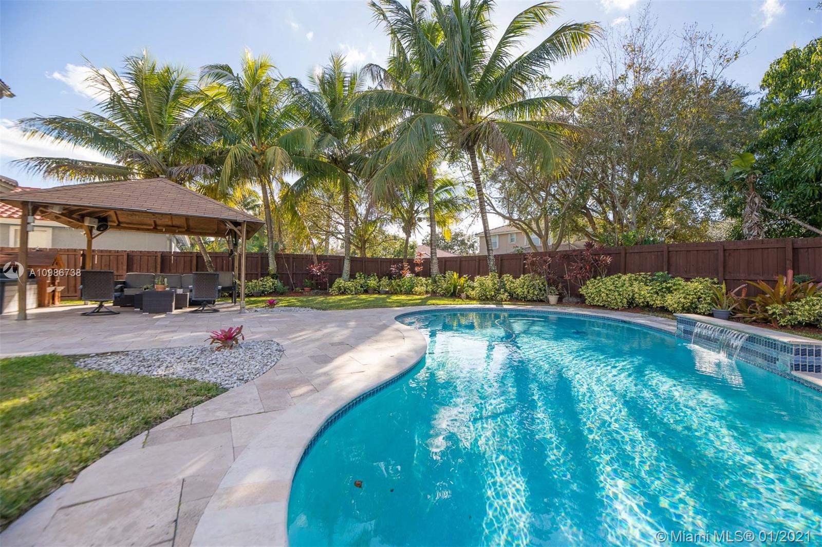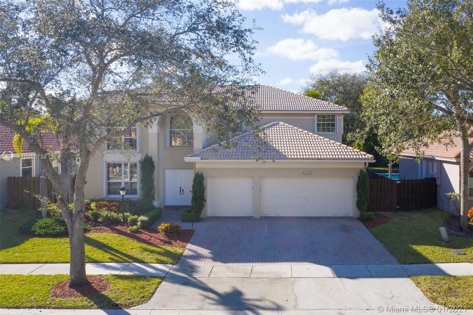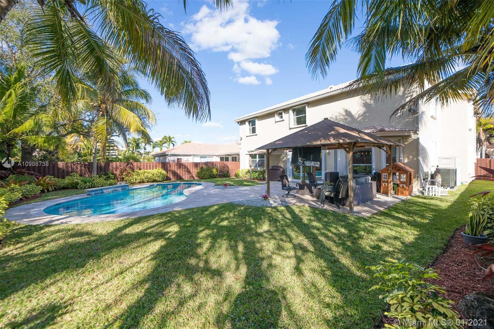 Elegant Kingston model with pool in sought after Pembroke Falls*this upgraded home features 5 bedrooms, 3 1/2 baths + big loft upstairs that's great for multi-purpose use and three car garages * master bed downstairs, with large walk-in closet * porcelain tile downstairs & dark wood on 2nd floor & staircase*open kitchen granite counters & s.steel app, ample custom wood cabinetry and cooking island*high ceilings*new led lighting throughout the house*laundry room*expansive backyard with your own tiki hut and pool to enjoy the breeze and peaceful evenings*the home is ready for immediate occupancy* HOA fee includes internet, cable, alarm, clubhouse, gym, heated pool, lakes, dog park, tennis & basketball courts. centrally located, a+ school district.