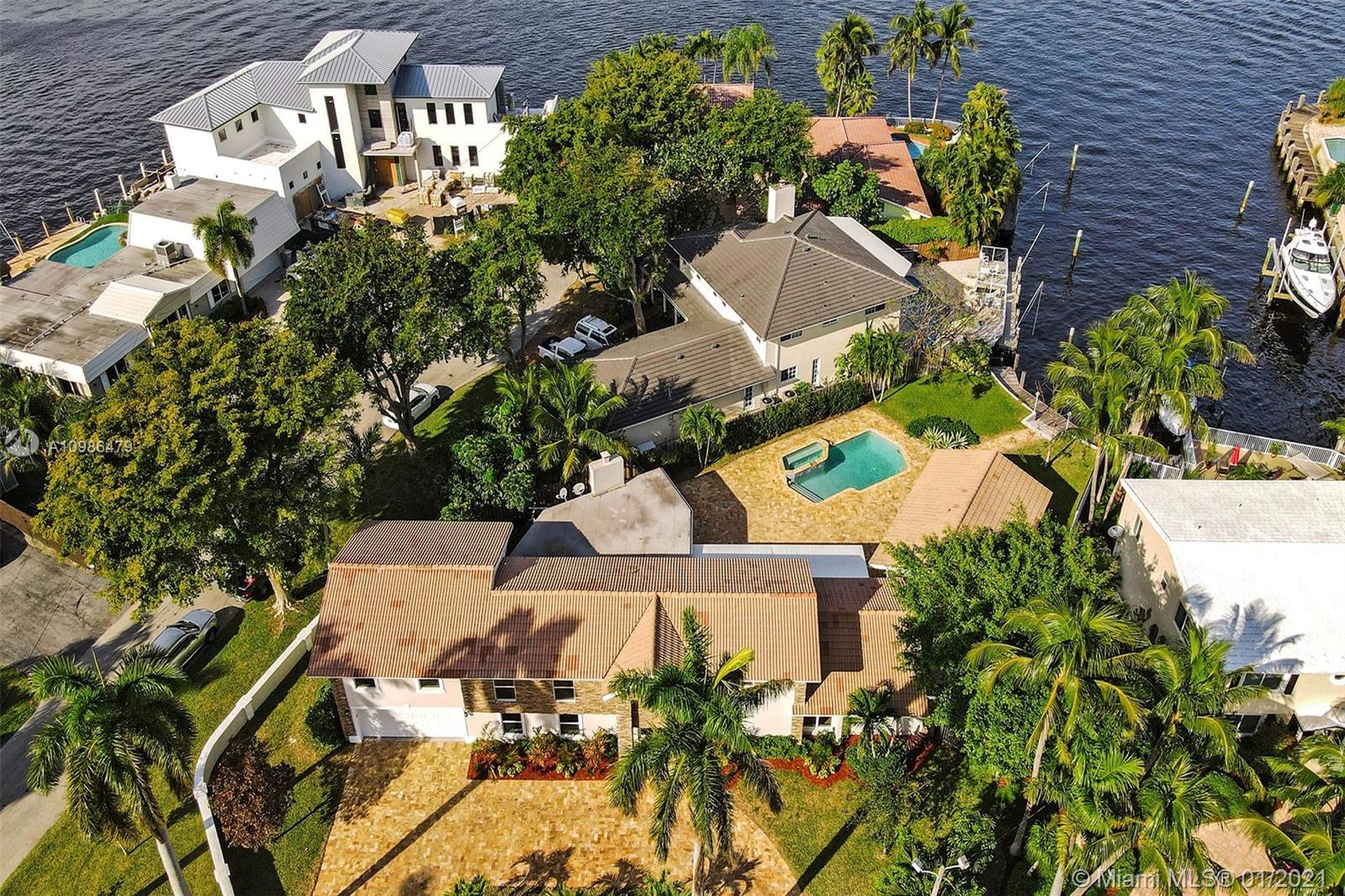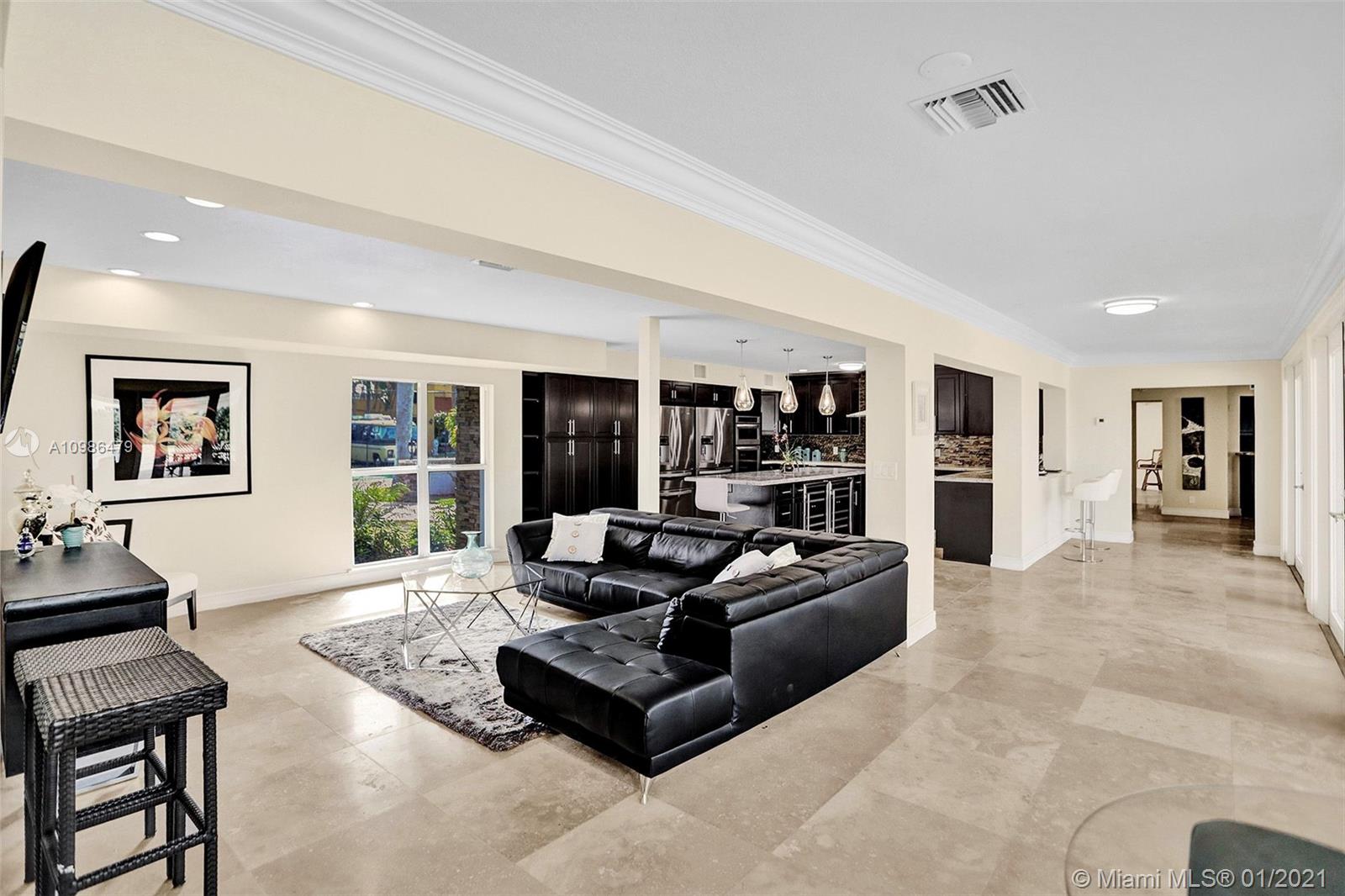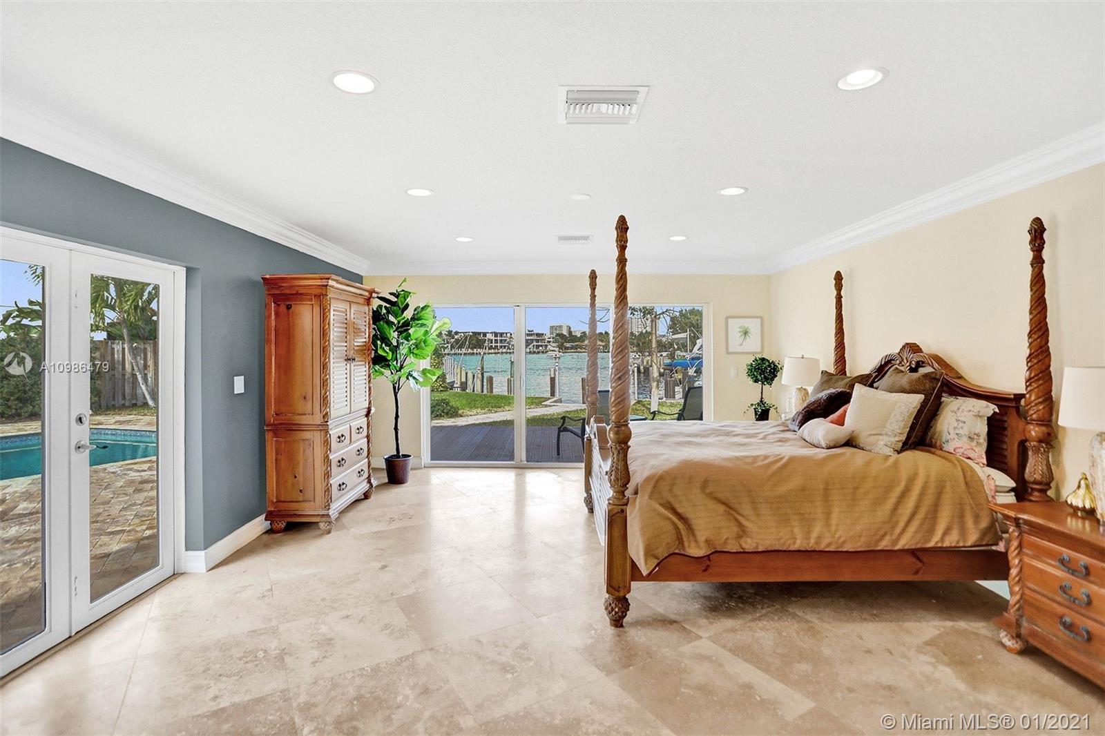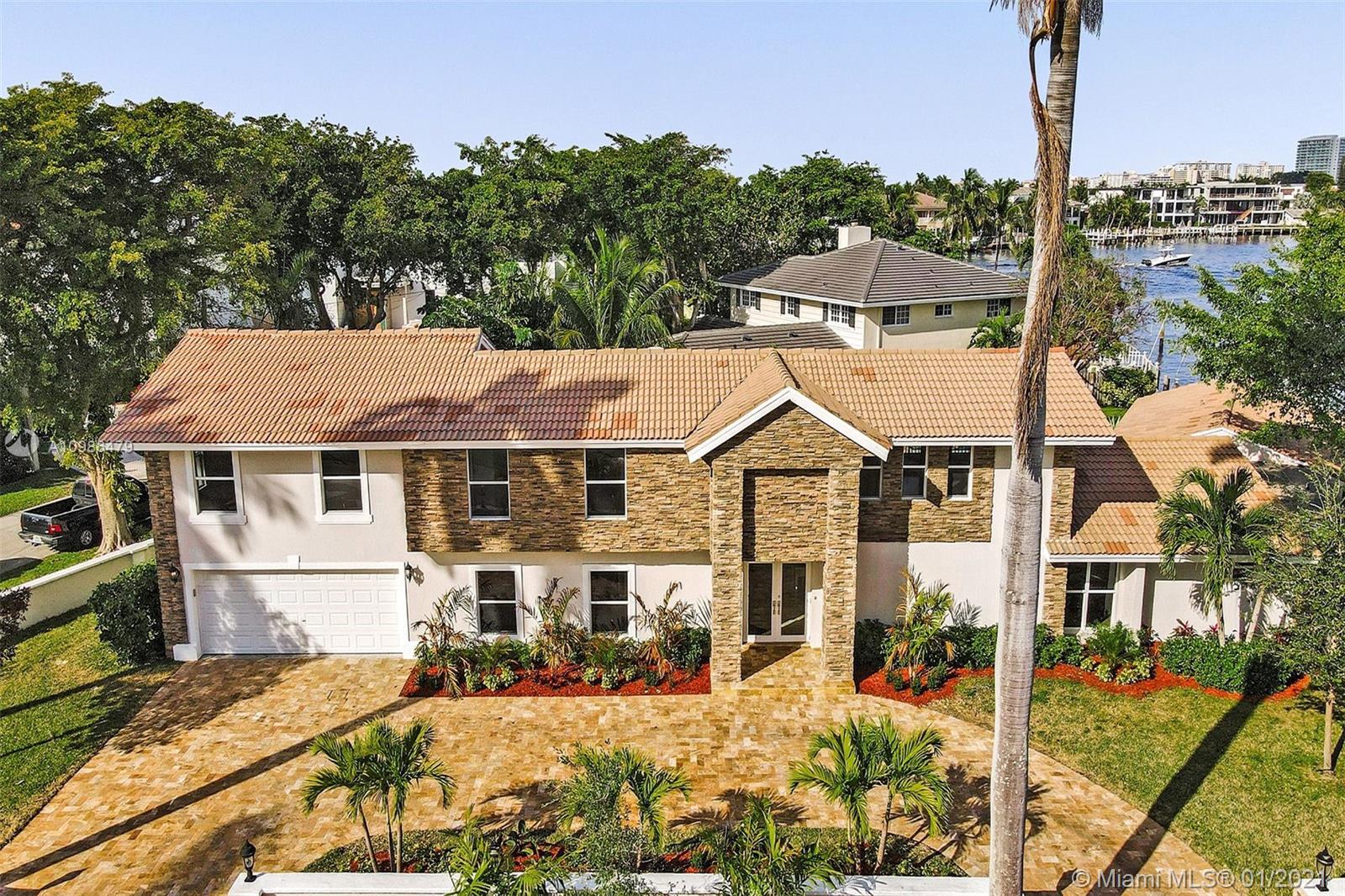 Tropical waterfront & lake views from this beautifully updated corner lot mansion in the coveted Lake Santa Barbara Shores area of Pompano Beach. This bright open concept 2-story pool home features abundant living space. Master suites both up & downstairs, each w/ private deck overlooking water. The huge chef's kitchen is fit for entertaining w/ 2 counter depth stainless refrigerators. Large driveway + oversized 2 car garage, spacious fenced-in patio w/ pool/spa, IMPACT windows & doors throughout, stone surround fireplace, private ELEVATOR, new professional landscaping & dockage for an approx 40ft boat. Zoned for A Rated McNab Elementary School. Northern Exposure for cool breezes. Minutes by boat to Hillsboro Inlet, a quick drive to Pompano Pier & dining, i95 & Ft. Lauderdale.