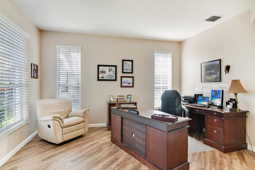 Gorgeous 5 bedroom 3 bathroom 2 car garage home in desirable Waterways of Boca Winds. Enormous pie shaped private lakefront lot. Brand New Roof with fresh contemporary exterior paint. Spacious open concept floor plan with volume ceilings and long lake views from nearly all windows. Light and bright tile flooring with durable vinyl in the dining room, formal/office, and 5th bedroom. Kitchen boasts 42'' cabinets, large snack bar, and inviting eat in dining. 5th bedroom is downstairs with a full bathroom. Dream size screened patio overlooks the oversized backyard and quiet lake views. Super Low HOA of $114. Walk or bike to ''A'' rated schools. clubhouse, pool, tennis, basketball, playgrounds, fishing, and more. Minutes to amphitheater, dog park, water park, skatepark, and 27 hole golf course.
