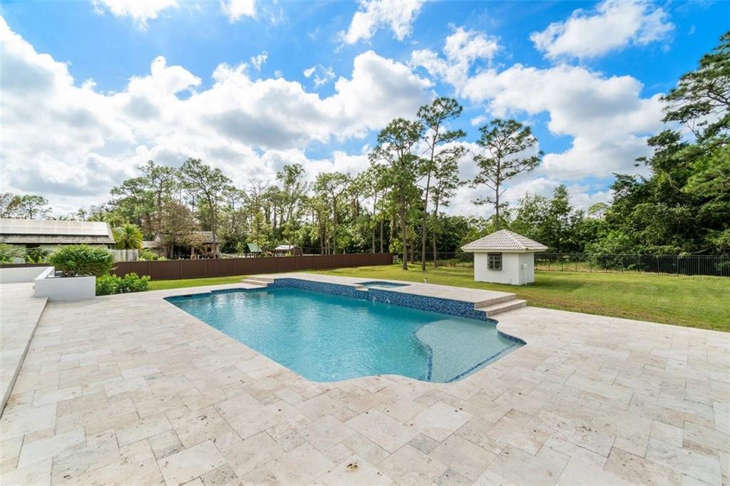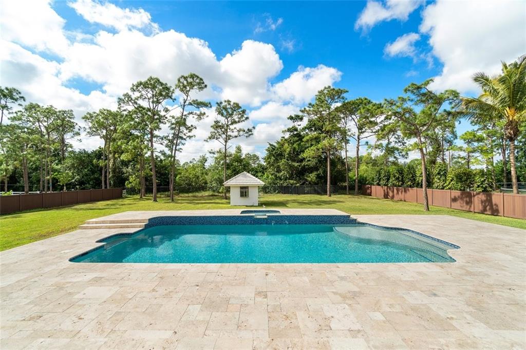 Soaring white wood ceilings, Sun-drenched living areas, walls of impact glass doors/windows & views of the resort-style pool thruout, have created a light & airy home with classic Florida influences. The crisp white kitchen is expansive & features a huge island/professional size refrigerator/double ovens & a keeping room w/a fireplace. Retreat-like Master Suite offers a huge cedar closet & a spa-like bathroom w/a separate tub & shower/sauna/double vanity. Swing open the French doors to experience indoor/outdoor living at its finest in your private outdoor oasis! Glorious oversize pool w/spa/sunning shelf/new heater & a very large travertine pool deck. The sprawling backyard offers plenty of space for the horses. A flexible design is perfect for multi-generation households. 2 Fireplaces!