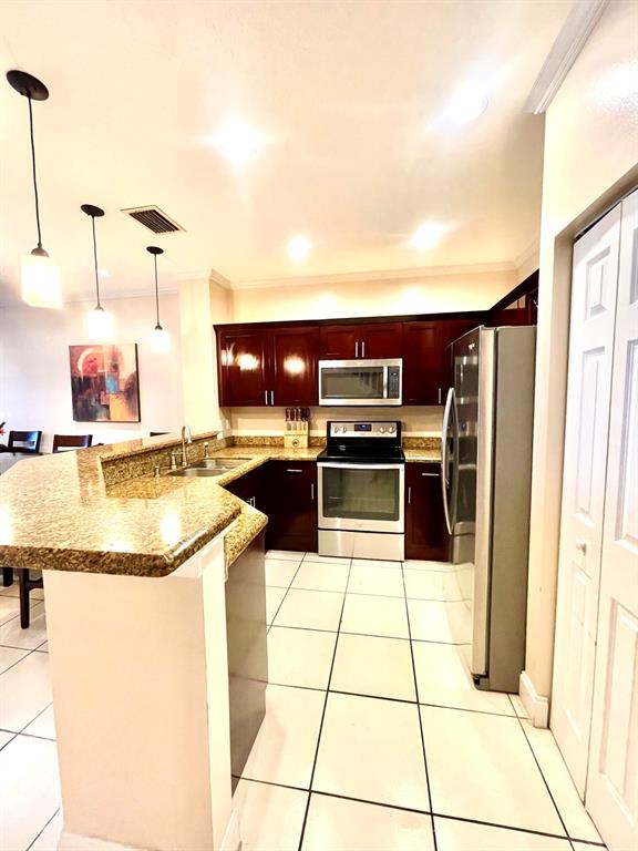 Beautifully remodeled 3 BR 2.5 BA, 1 car garage (converted to laundry room/storage) townhome with 2 parking spaces. This home is conveniently located just steps from the community pool and all of the community amenities such as club house, tennis court, fitness center and more. The home has tile flooring throughout and recessed lighting in the main living areas. The remodeled kitchen has gorgeous granite counter tops and top stainless appliances. The baths have also been fully remodeled. Crown moldings abound in this naturally light and bright open floor plan. This townhome has a pool view from second bedroom. Walking distance to Trader Joe's and the new Burlington Coat Factory store in Pembroke Pines! Easy access to major highways and short driving distance to major hospital, mall,