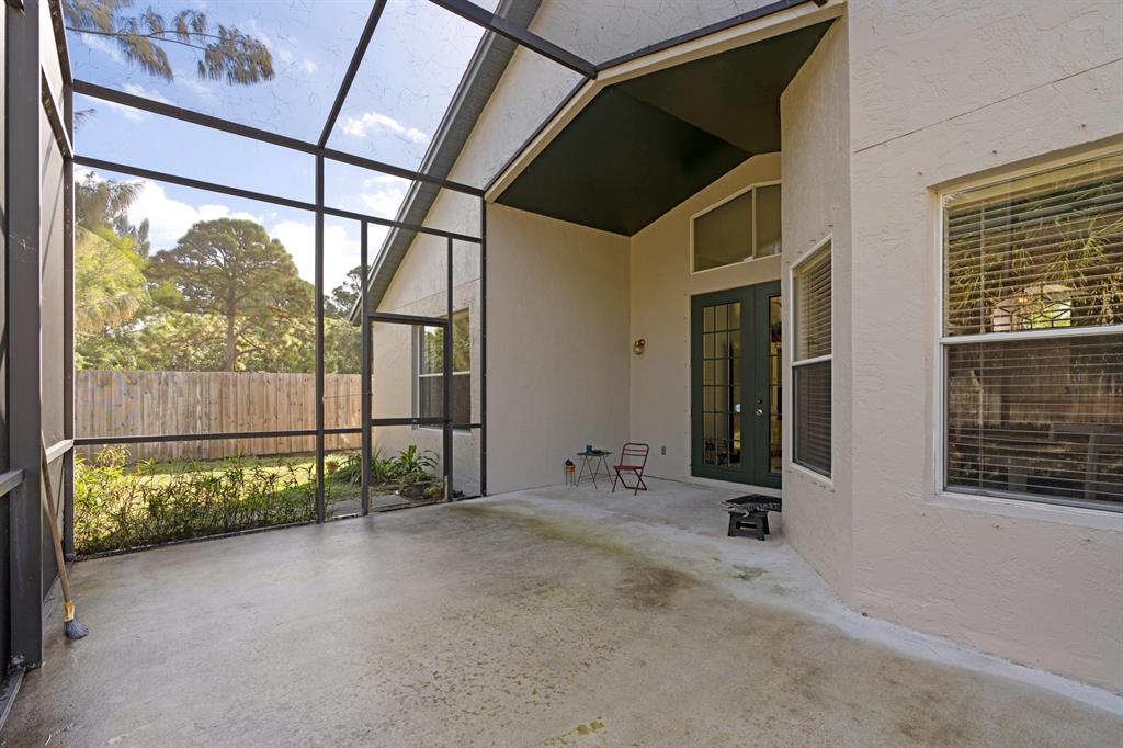 Largest lot in community sits on 1/4-acre of land, at end of quiet cul-de-sac, and backs to preserve. Land includes Lot in front of Property. Tall cathedral ceilings throughout. Eat-in kitchen with snack bar, solid wood cabinets, and stainless-steel appliances. Master suite has separate spa tub, separate shower, separate water closet, dual sinks, and skylight to bring in natural light. Large indoor laundry room. Big covered and screened back patio, plus screened front porch. Fabric hurricane shields. 6-car driveway. New exterior paint. Gated community includes pool, and playground. Near new Ballpark, easy access to I-95, turnpike, Rosemary Square, Clematis, airport.