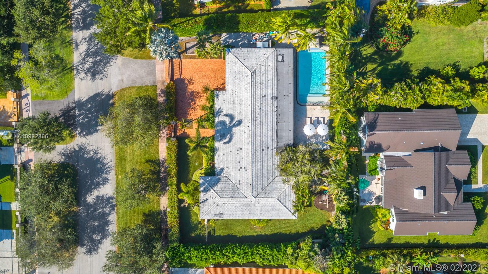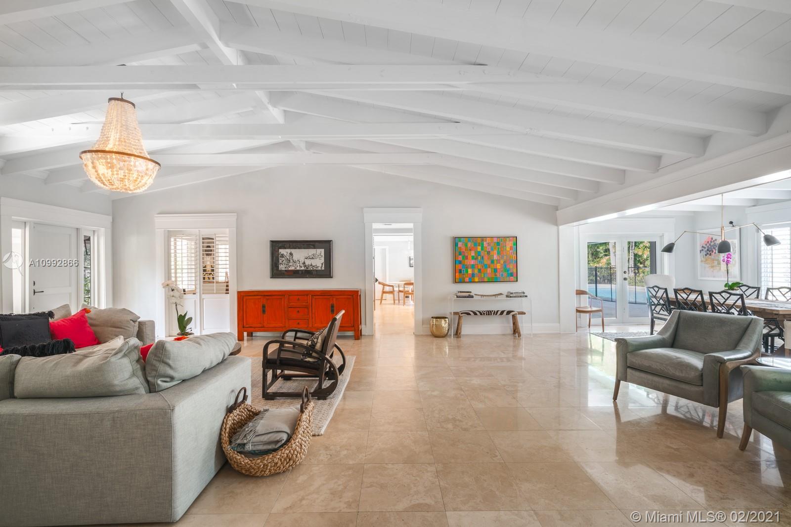 Beautiful 4,818 total Sq. Ft. midcentury modern Coral Gables home with exposed wood beam ceilings, plantation shutters, built-in bookshelves, and travertine floors. Open floor plan with abundant light from impact doors and windows. This jewelbox house includes 4 bedrooms, 4 bathrooms, a family room with plantation doors leading into a formal living room, and a formal dining room with a built-in bar console. Entertain in a sleek eat-in kitchen with breakfast area, marble countertops, and appliances by Wolf, Miele, LG, and SubZero. Lush 18,146 SF lot, ample driveway, spacious 2-car garage, with laundry room and built-ins. Kids playground, heated pool with beach entry, full cabana bathroom, and a whole house diesel generator.