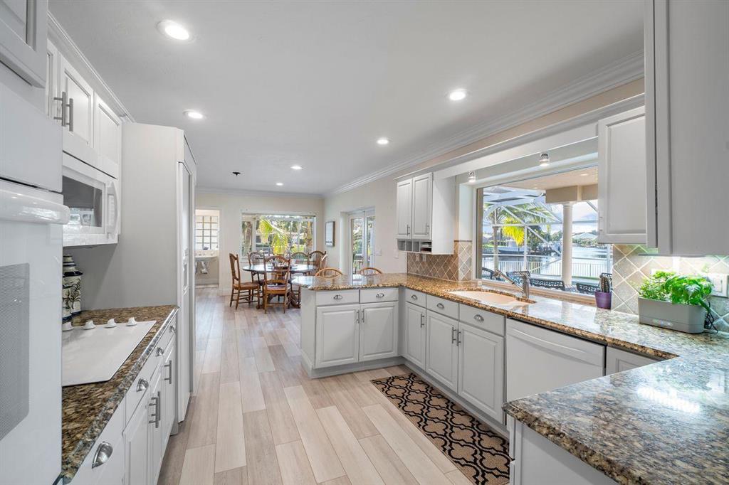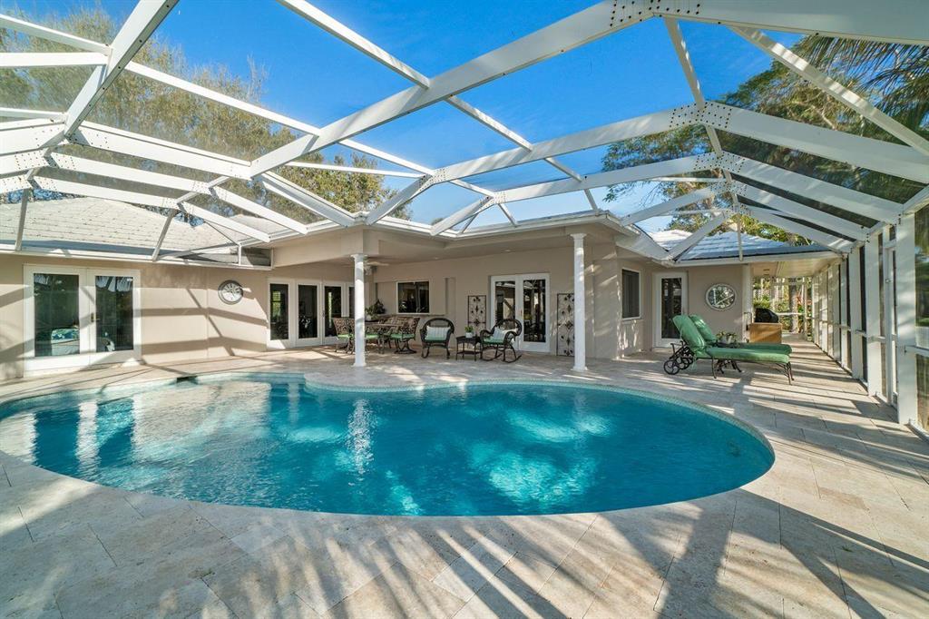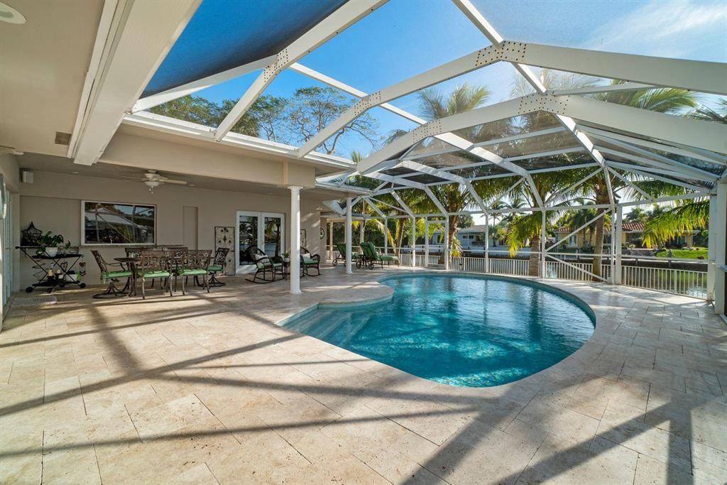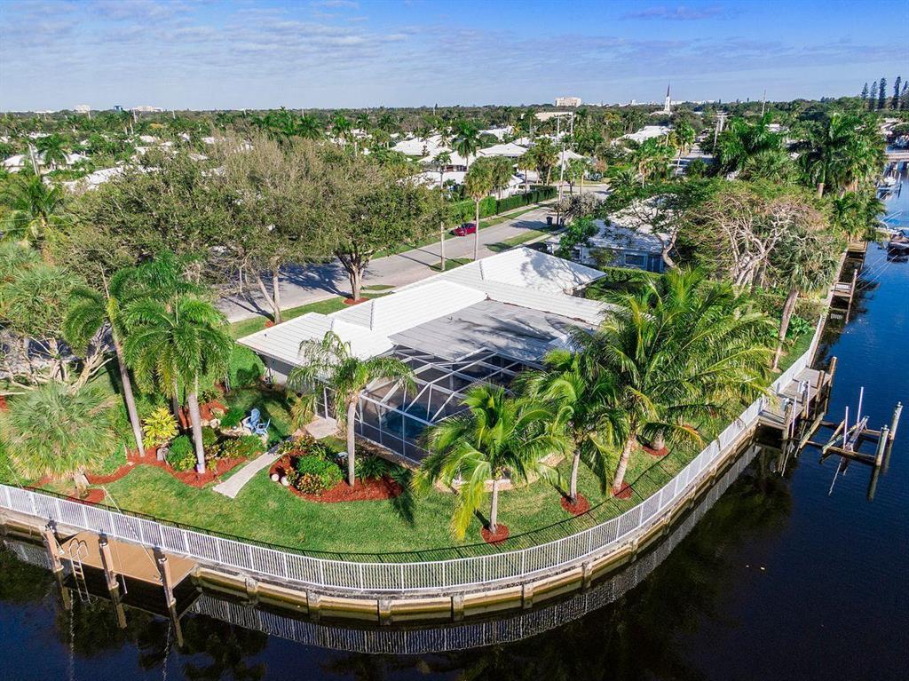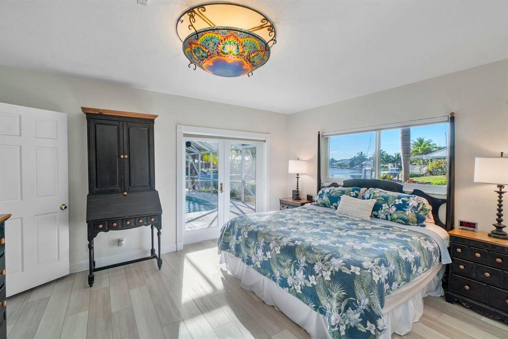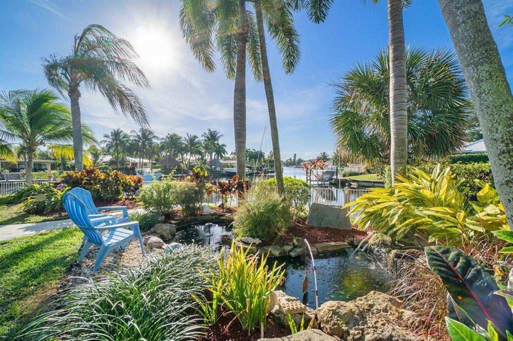 Situated on an oversized point lot with 246' of seawall on the El Rio Canal (widest canal with intracoastal and ocean access), this home offers breathtaking water views. The beauty of this backyard is unmatched, featuring a recently upgraded heated pool with salt chlorinator, travertine patio and a serene koi pond overlooking the canal. The home's interior includes 3 bedrooms, 3.1 baths and an oversized bonus room with beautiful vinyl wood plank flooring throughout. Additional upgrades include a whole house generator (2020), full hurricane protection, newer AC (2019) with Remi Halo air purifier and UV light, new duct work (2020), Tesla charger, replaced roof (2014), steam shower in the master bathroom, and LED lights throughout. With two docks, you can enjoy fun in the sun with boat