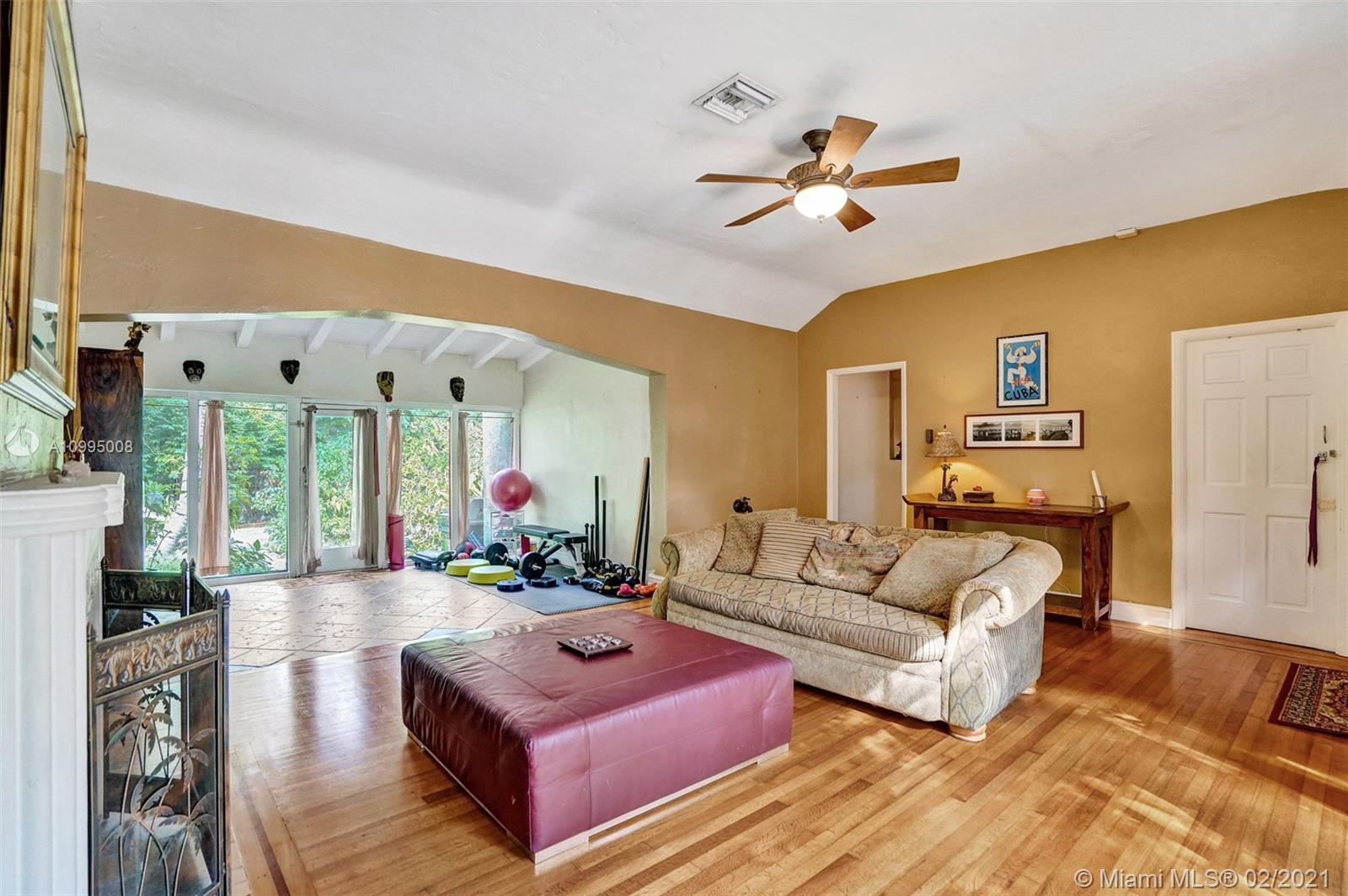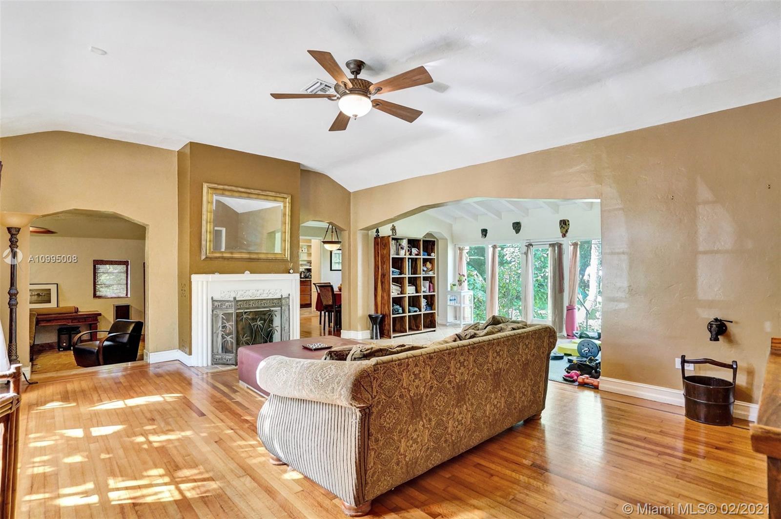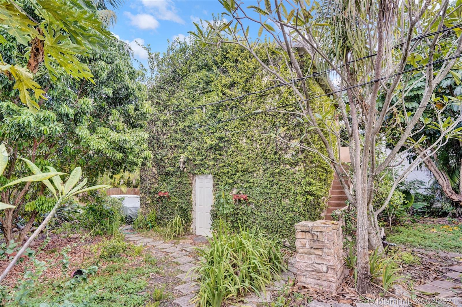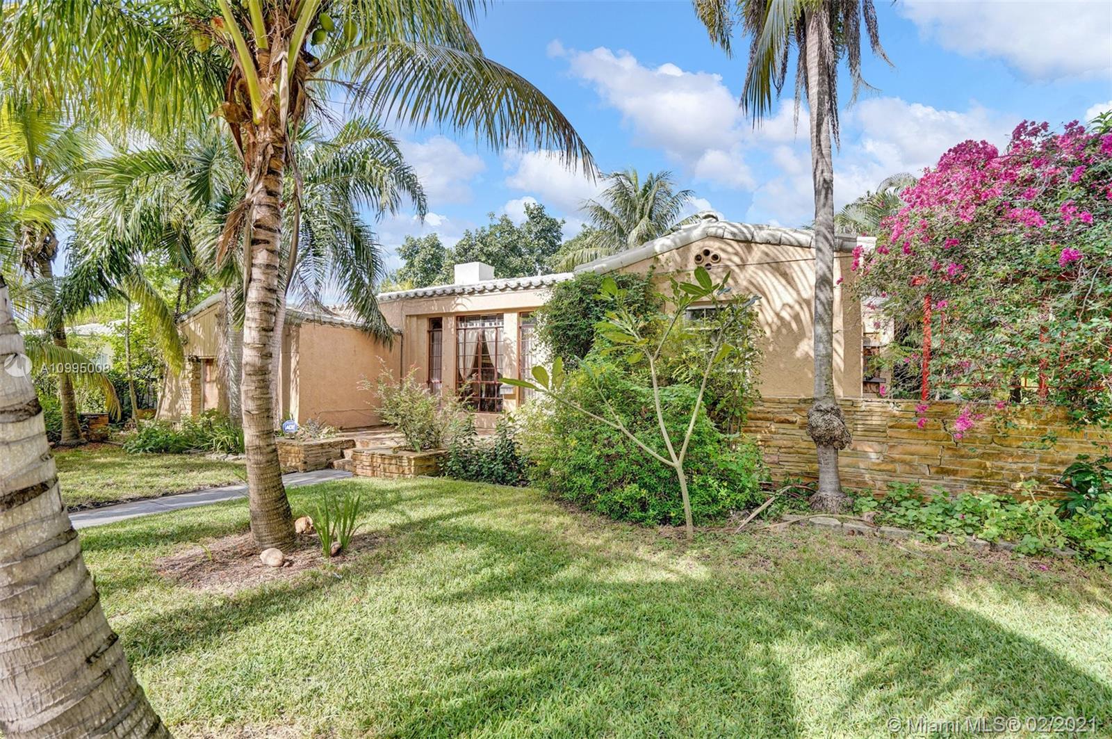 Extraordinary 1930's home with tons of beauty, sitting on an oversized lot of 14,300 sq ft. Located in the very desirable Miami Shores, this home features 3 bedrooms and 2 bathrooms in the main house, and a separate 1/1 living Guest House that is detached, and filled with charm. The main house offers original oak floors, spacious floor plan with a large family room and sun room, volume ceilings, wood burning fireplace, and much more. Very ideal detached guest house, with a 2 car garage on the first floor and a very comfortable 1/1 on the second floor, with an office. Guest house is currently vacant. Fenced yard with an abundance of trees, flowers and butterfly garden. Fruit trees include:avocado, mango, lychee, papaya, mamey and banana trees. Update plumbing and Electrical.