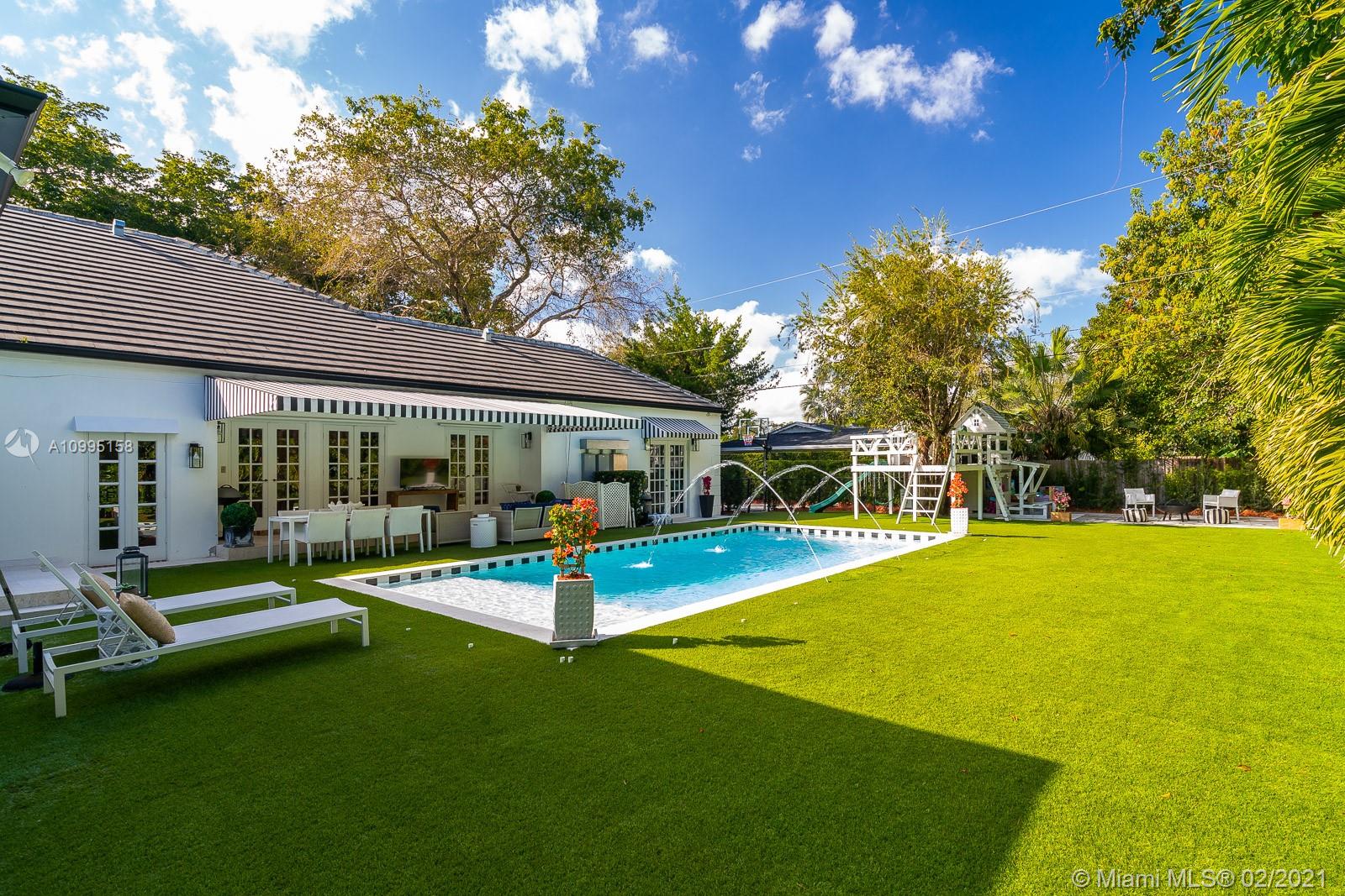 Exceptional, walled & gated one story home on a tranquil Pinecrest street. 5 bedrooms, 3.5 baths. Beautiful foyer entry, original millwork & crown moldings. Living room with stunning original wood flooring. Vaulted ceilings. French doors bring in abundant natural light. Newly remodeled, modern farmhouse kitchen with exposed brick & eat-in breakfast nook. Converted garage to a family/playroom complete w/ built-in wall unit. Amazing master suite with large walk-in closet complete with custom cabinetry. Oversized En-suite master retreat, marble tiles, large tub & separate shower. Turfed backyard full of lounging/entertaining areas, a treehouse, & stunning pool w/beach-style entry. A true Oasis!! Both master suite addition & pool completed in 2016! This home is a Must-See! More photos to come!