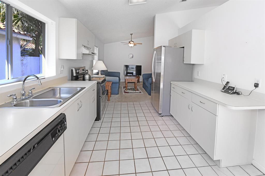 Spacious, 3 bedroom + den/ 2 bath home with a 2 car garage in desirable gated Boca Raton community. 1660 sq ft under air with vaulted ceilings & split bedroom plan. You will enjoy the sunny, southern exposure , nice patio & large fenced yard for outdoor fun! The roof , air conditioner & fence are 2 years old , exterior paint & gutters less than 2 years and sprinkler system done in July 2020. Reasonable HOA fees include, security entrance gate, community pool, tot play area, cable and common area lawn care. The eat-in kitchen is equipped with stainless steel stove & refrigerator plus a washer & dryer in a convenient laundry room. The master suite has a large walk- in closet plus another closet, oversized shower, & dual sinks.Plenty of closet space throughout your home.