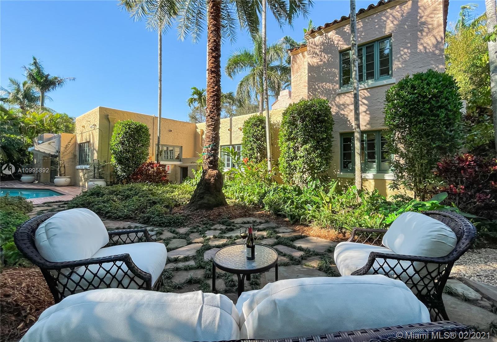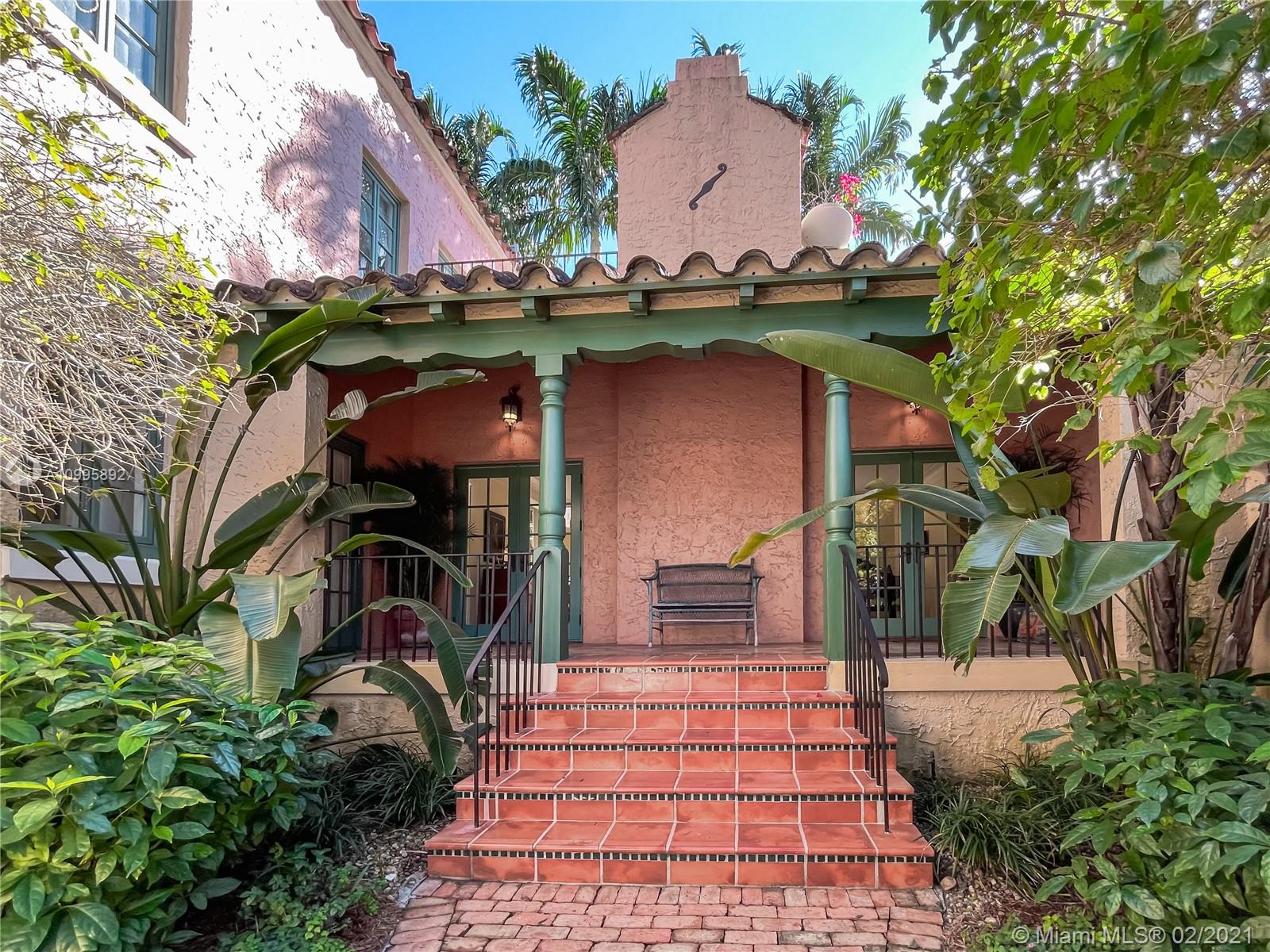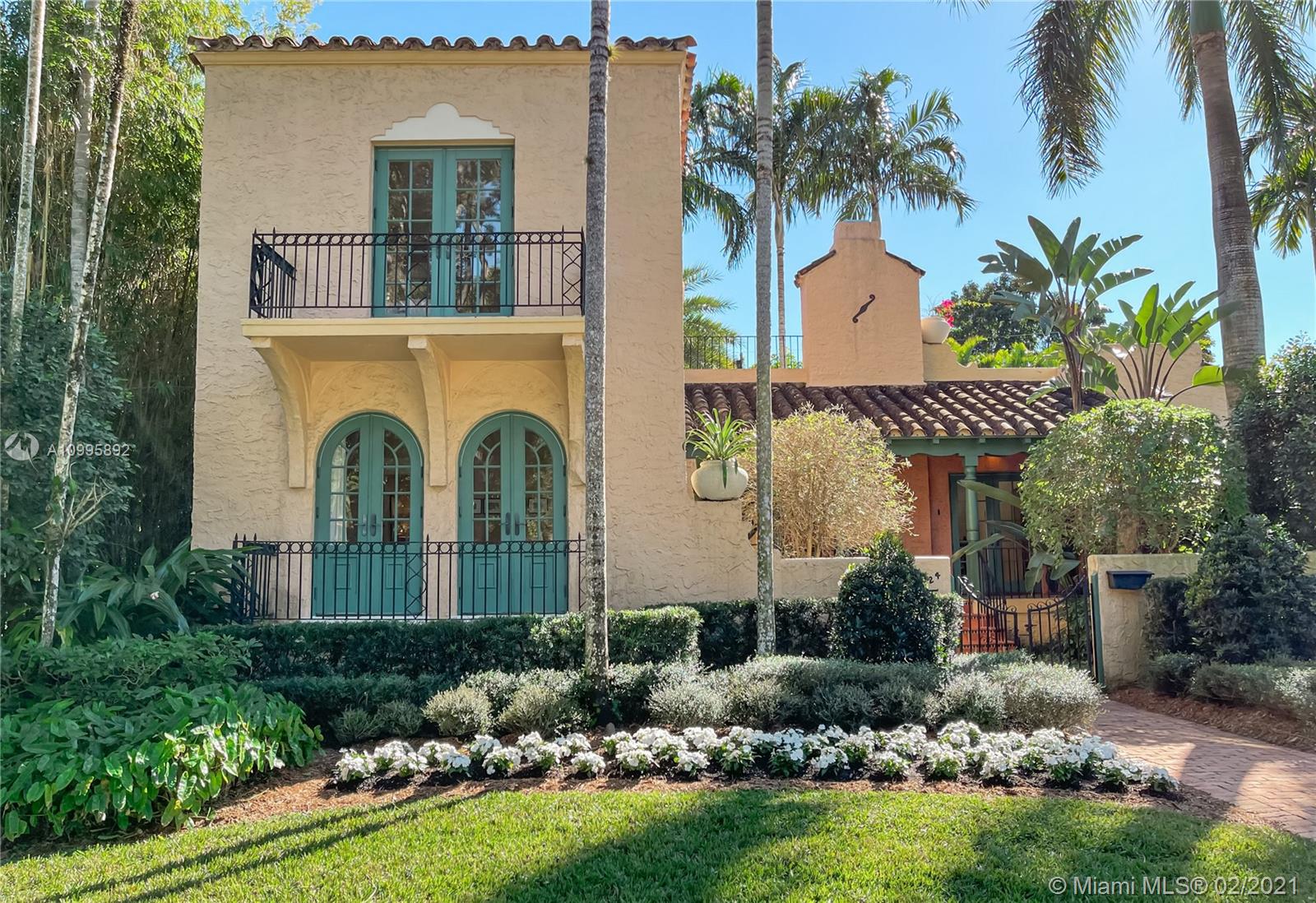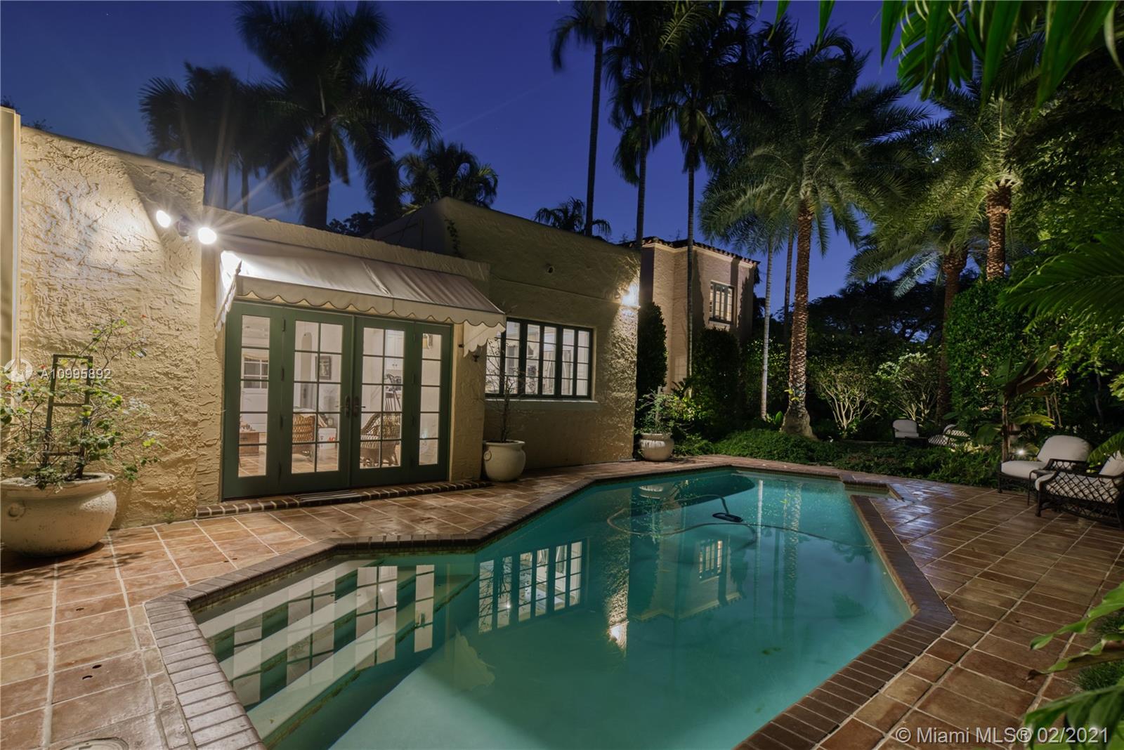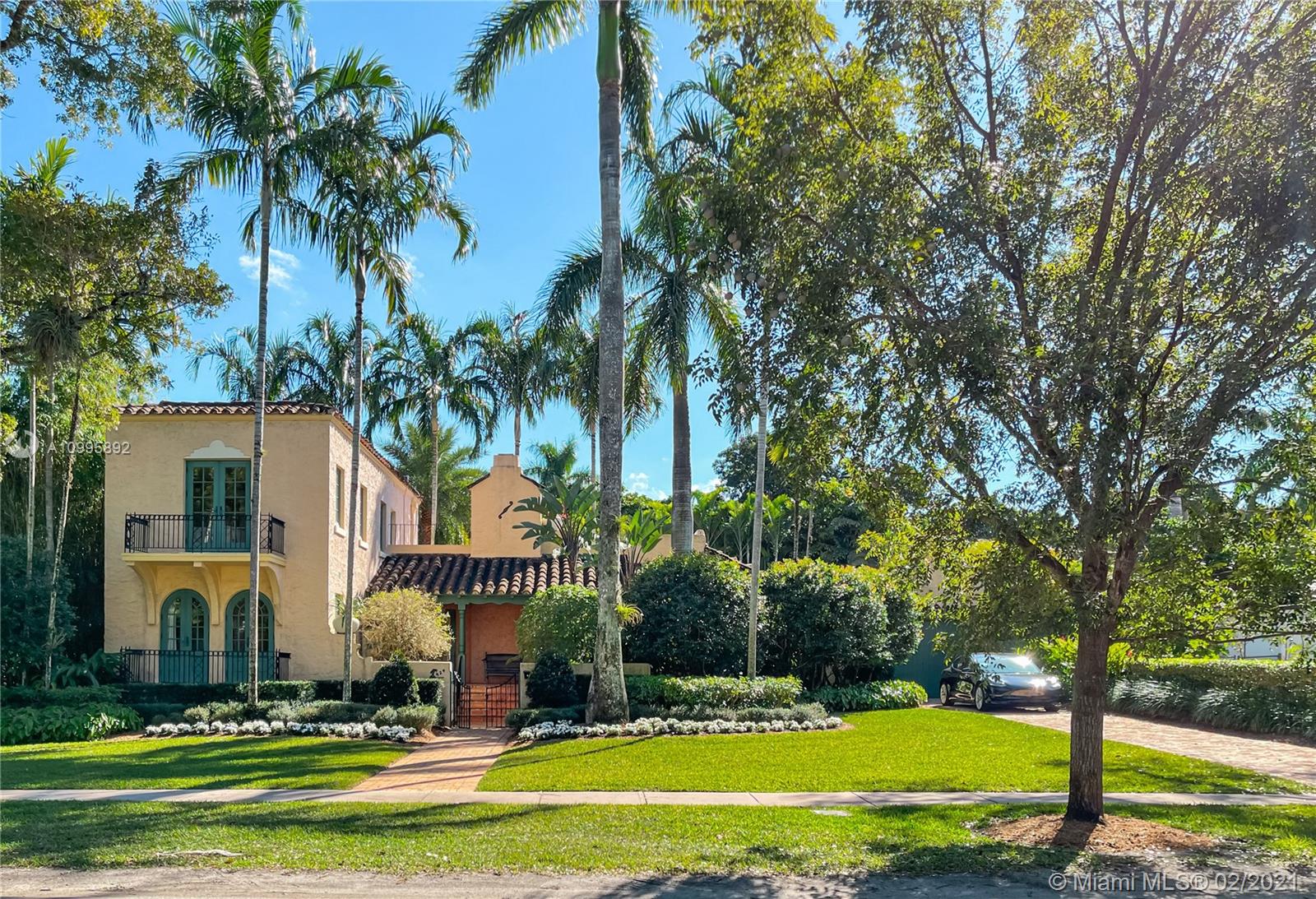 One of a kind, stunning, restored and updated Old Spanish home designed by architect H. George Fink in 1923. Large veranda entry reveals authentic architectural integrity, crown moldings, archways, hardwood floors, a grand living rm with fireplace, gracious formal dining room with adjacent butler's pantry. All-white eat-in kitchen with a gas stove opens to a cozy family room. Modern elements include advanced 2019 solar technology, hurricane impact glass & custom wood clad French doors. The floor plan boasts two bedrooms on the first floor plus a home office w/ built-in cabinetry, & two bedrooms upstairs. 12,500 sq' lot presents a peaceful, secluded tropical garden paradise, saline swimming pool & the ultimate "in private al fresco living". Generator ready with portable generator included.