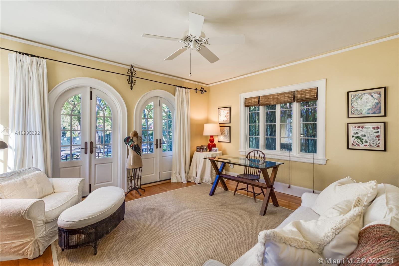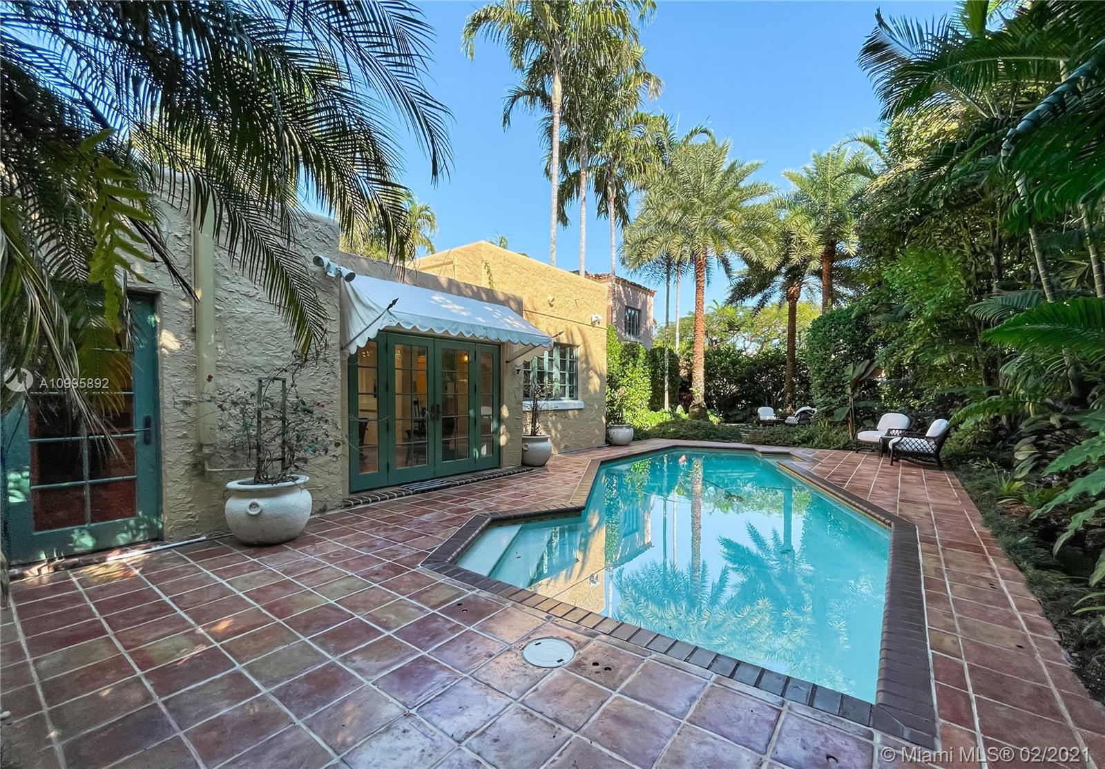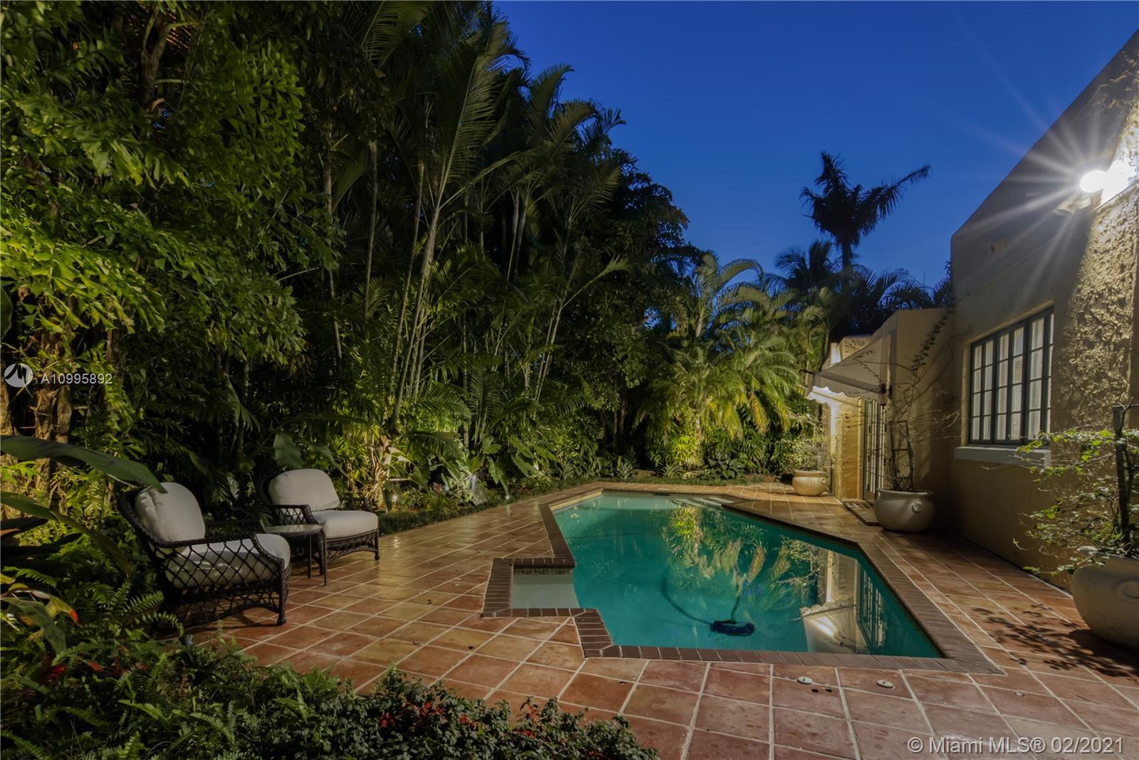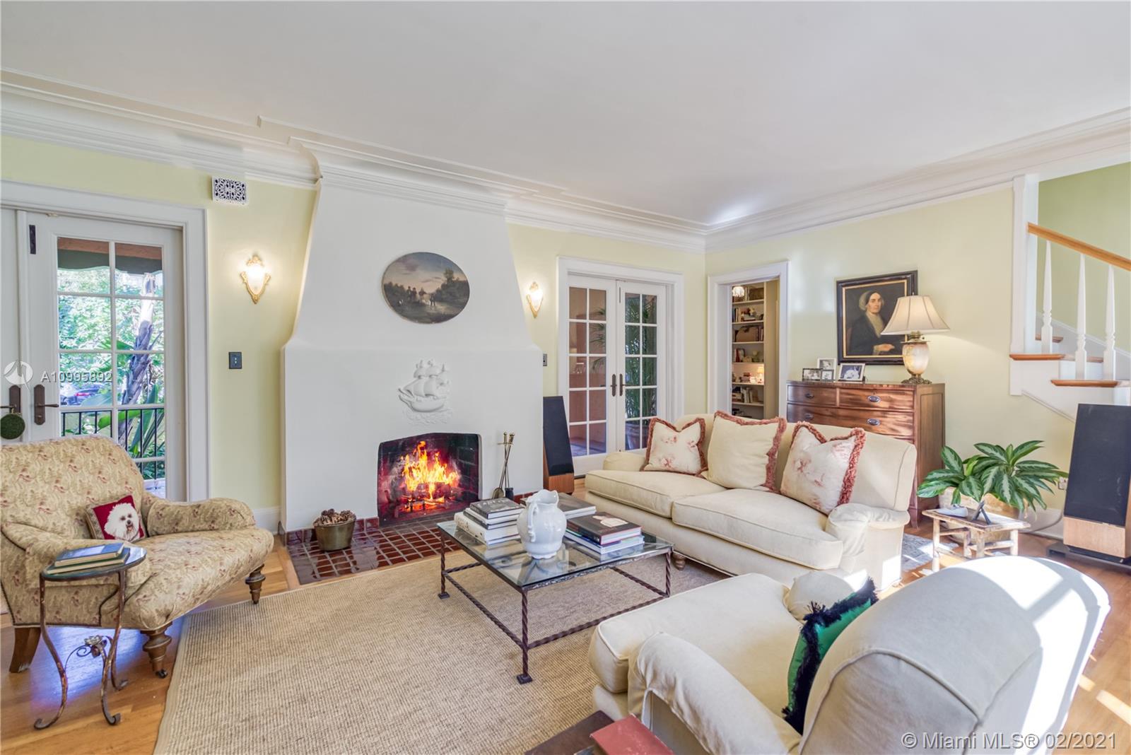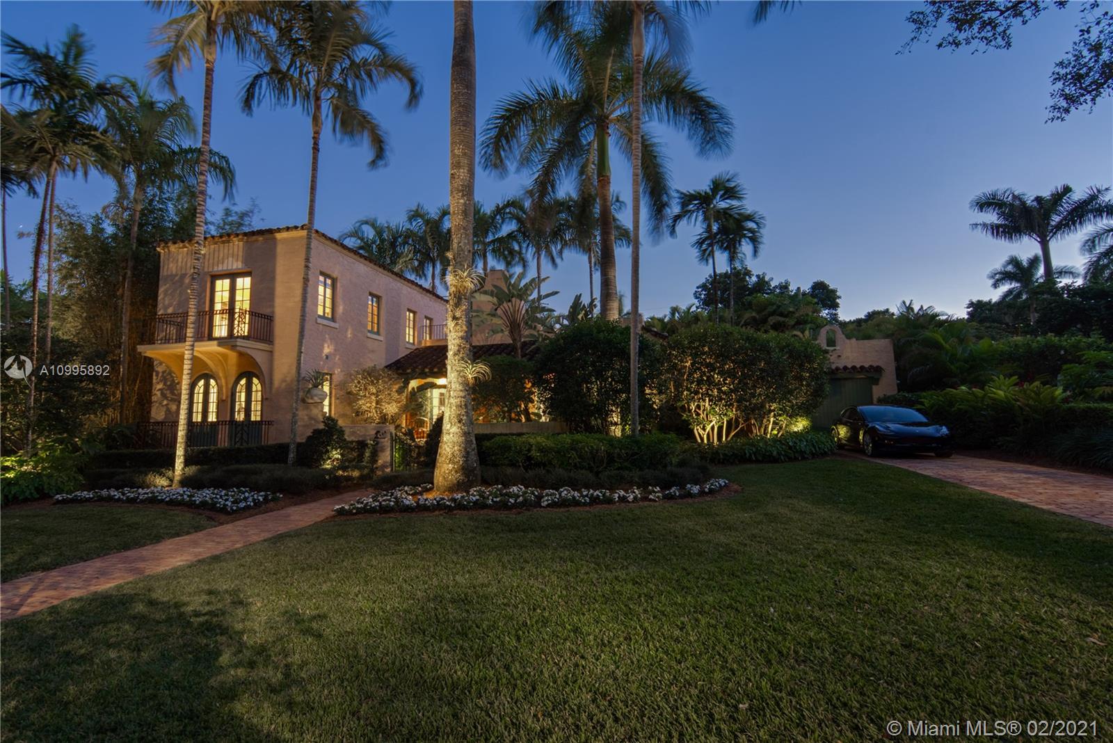 One of a kind, stunning, restored and updated Old Spanish home designed by architect H. George Fink in 1923. Large veranda entry reveals authentic architectural integrity, crown moldings, archways, hardwood floors, a grand living rm with fireplace, gracious formal dining room with adjacent butler's pantry. All-white eat-in kitchen with a gas stove opens to a cozy family room. Modern elements include advanced 2019 solar technology, hurricane impact glass & custom wood clad French doors. The floor plan boasts two bedrooms on the first floor plus a home office w/ built-in cabinetry, & two bedrooms upstairs. 12,500 sq' lot presents a peaceful, secluded tropical garden paradise, saline swimming pool & the ultimate "in private al fresco living". Generator ready with portable generator included.