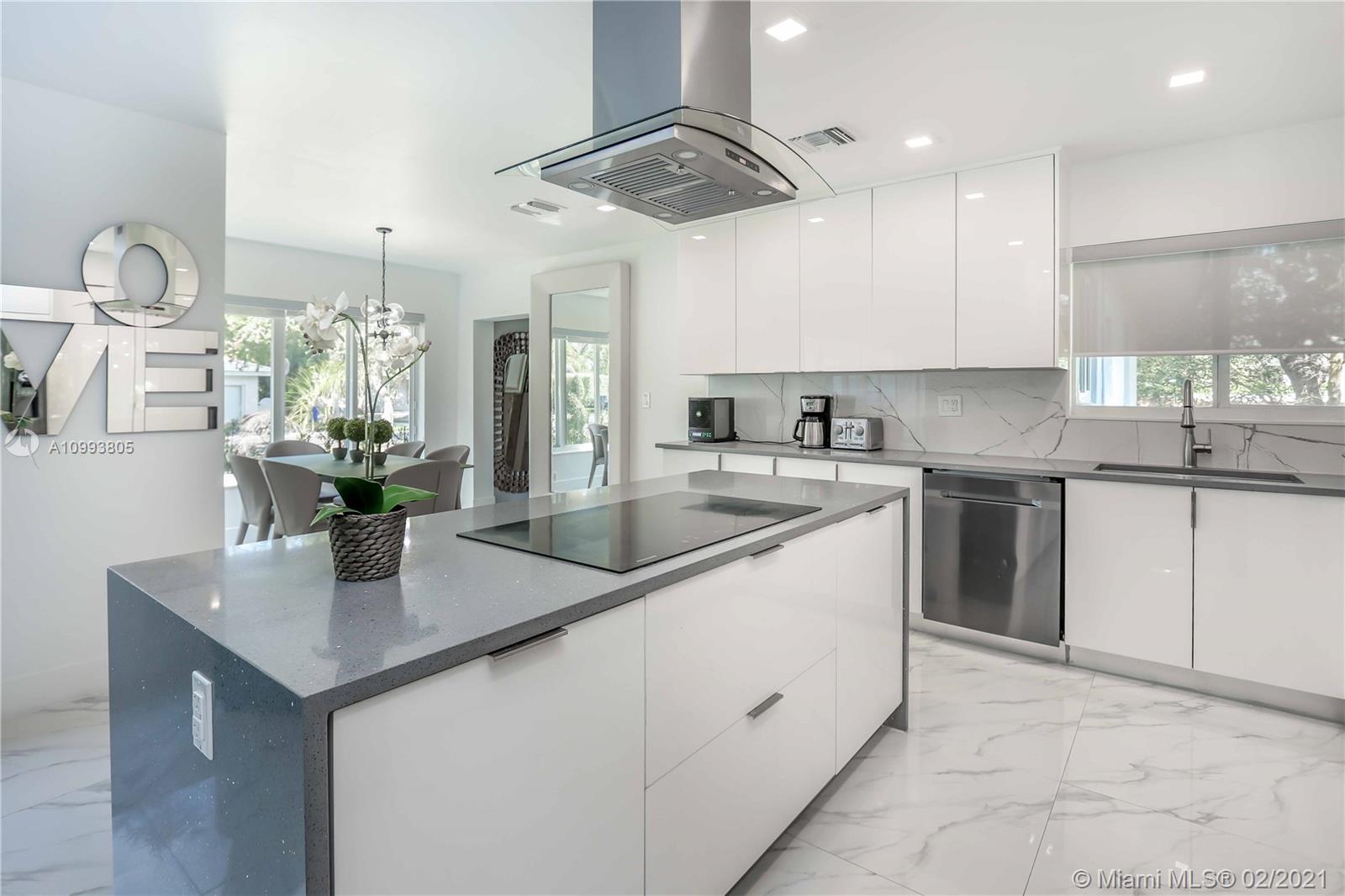 Great corner property, double lot, with over 15 thousand sq ft lot, this house features 4 Bedrooms, 3 Baths, updated kitchen and bathrooms, 32 x 32 porcelain tiles throughout, open concept split floorplan, kitchen with island, quartz countertop, new stainless steel Samsung appliances, white cabinetry, spacious laundry room, room for pool, circular driveway, fenced backyard, impact windows throughout, tankless water heater, roof redone in 2008, electrical redone in 2018 all new interior doors.
