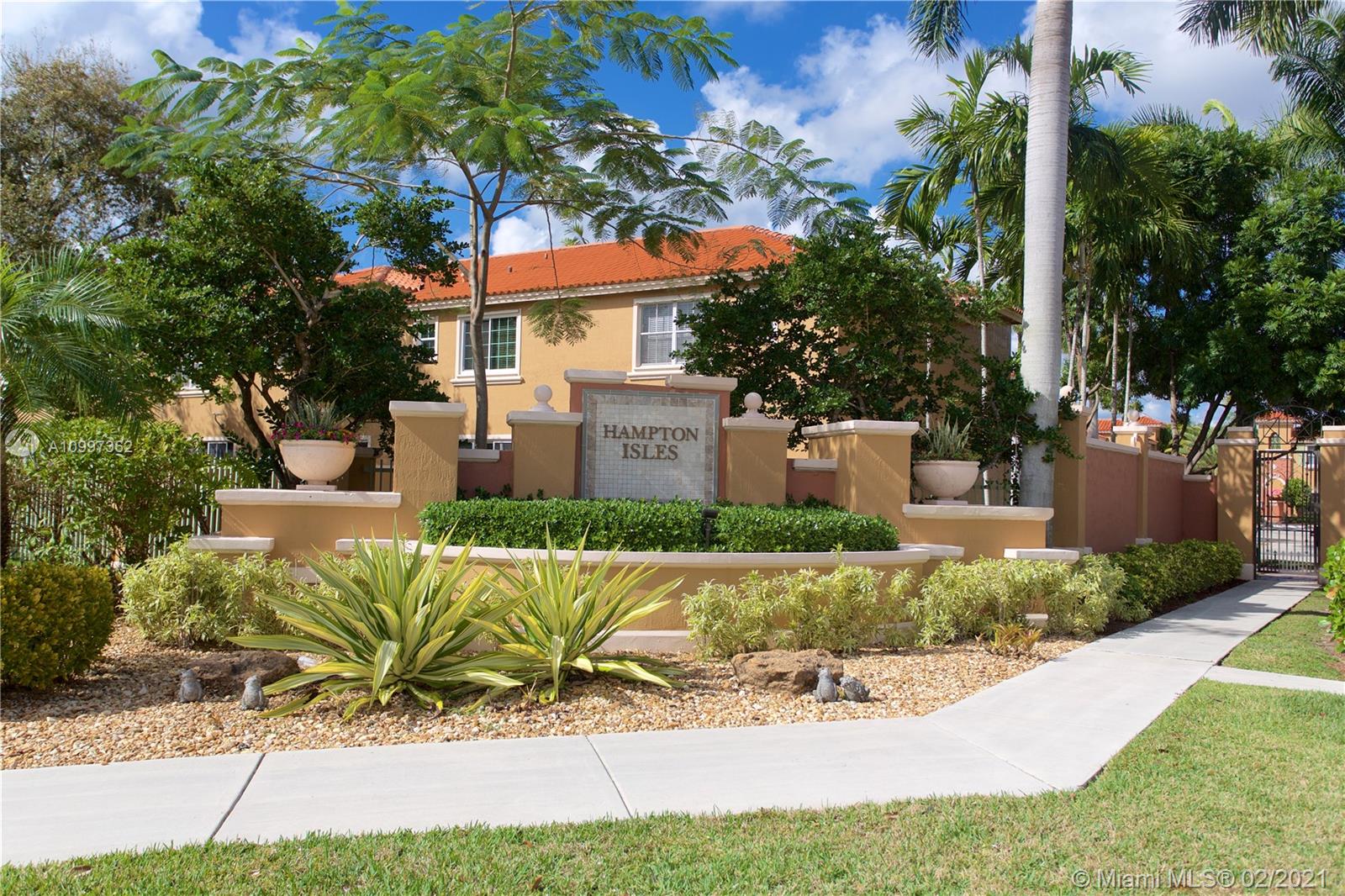 Sought-after Mediterranean style 2/2.5 townhouse in the quiet gated community of Hampton Isles. Upgrades include 2019 AC system, 2019 kitchen appliances, and beautifully remodeled master shower with glass frameless door. Large ceramic Italian tile downstairs and laminate flooring upstairs. Open concept kitchen with breakfast bar adjacent to dining room. Floor-to-ceiling hurricane-resistant French doors in the kitchen that lead to the private fenced back courtyard. Sparking community pool and walking distance to parks and the new Pines City Center. This one has it all!