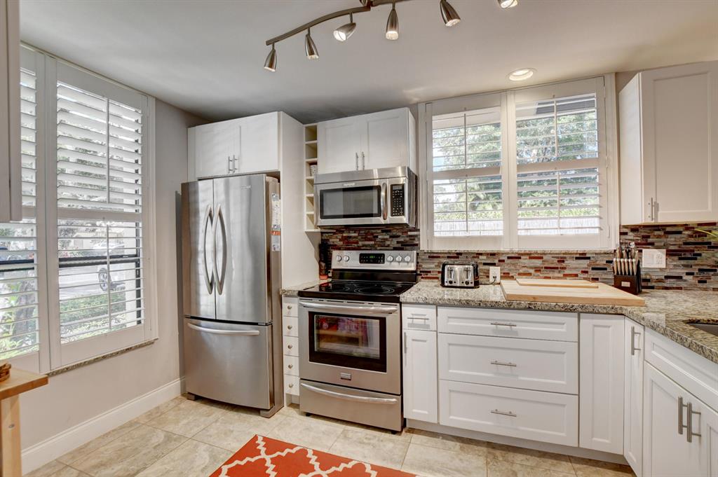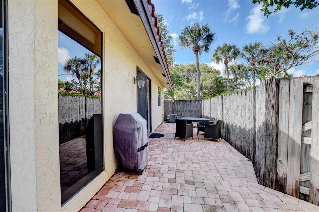 This Stunning 2/2 Corner Villa is located in the heart of Boca Raton at desirable Town Place neighborhood in Central Boca. This lovely and completely updated corner villa has a large wrap around fenced in patio, gorgeous updated kitchen with granite tops, custom backsplash, custom white wood cabinetry, stainless & steel appliances and plantation shutters. This charming and cozy villa is gorgeous throughout, from the beautiful tray ceiling in Living room, to ceramic tile throughout, upgraded master bathroom with modern dual sinks and cabinetry to upgraded 2nd bathroom. Master bedroom is spacious and has a very large walking closet , large 2nd bedroom. NEW AC in warranty (replaced in April 2019). Reserved parking directly outside, many guest parking spaces available. Access to best A Schools