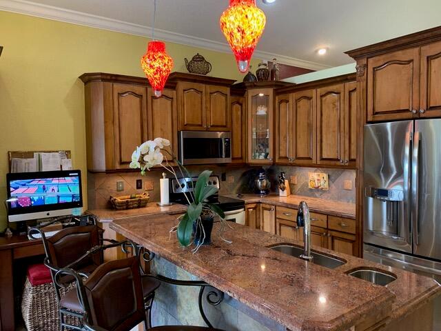Recessed LED Lighting, Custom Oversized 36'' Solid Maple Wooden Cabinetry with Molding, Under cabinet lighting, Island kitchen lighting, Generator Hook Up at meter, Surround sound wiring in Family Room, Maple workstation, Maple Entertainment Center, GE Profile updated stainless steel appliances with GE Profile 29'' Counter depth French 3 Door Refrigerator, 2'' Granite countertops with Ogee edge, low maintenance slate backsplash and slate 1/2 wall at island, slow close cabinets, hammered pulls and knobs, Bianco Kitchen sink and Bianco Kitchen pullout faucet , marble bathrooms with custom vanities, updated faucet hardware, updated lighting fixtures in bathrooms, solid glass 5/8'' custom shower door, sit in area in shower with niche, crown molding, 4.5'' wooden baseboards. wood trim casings a