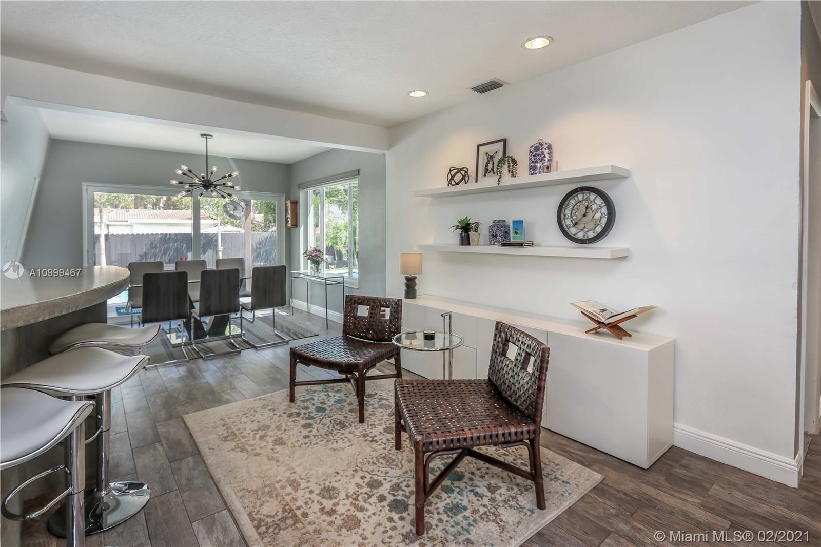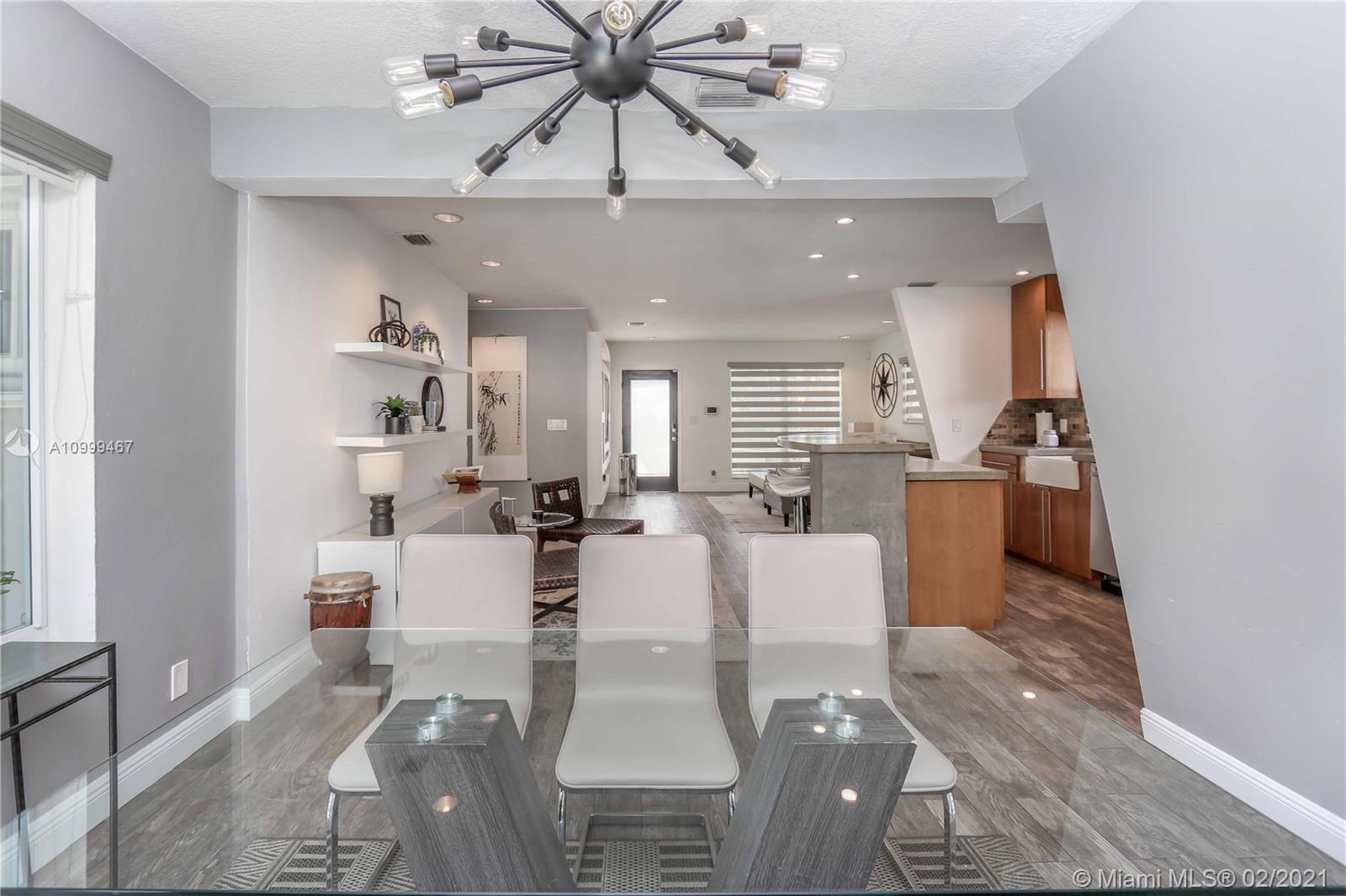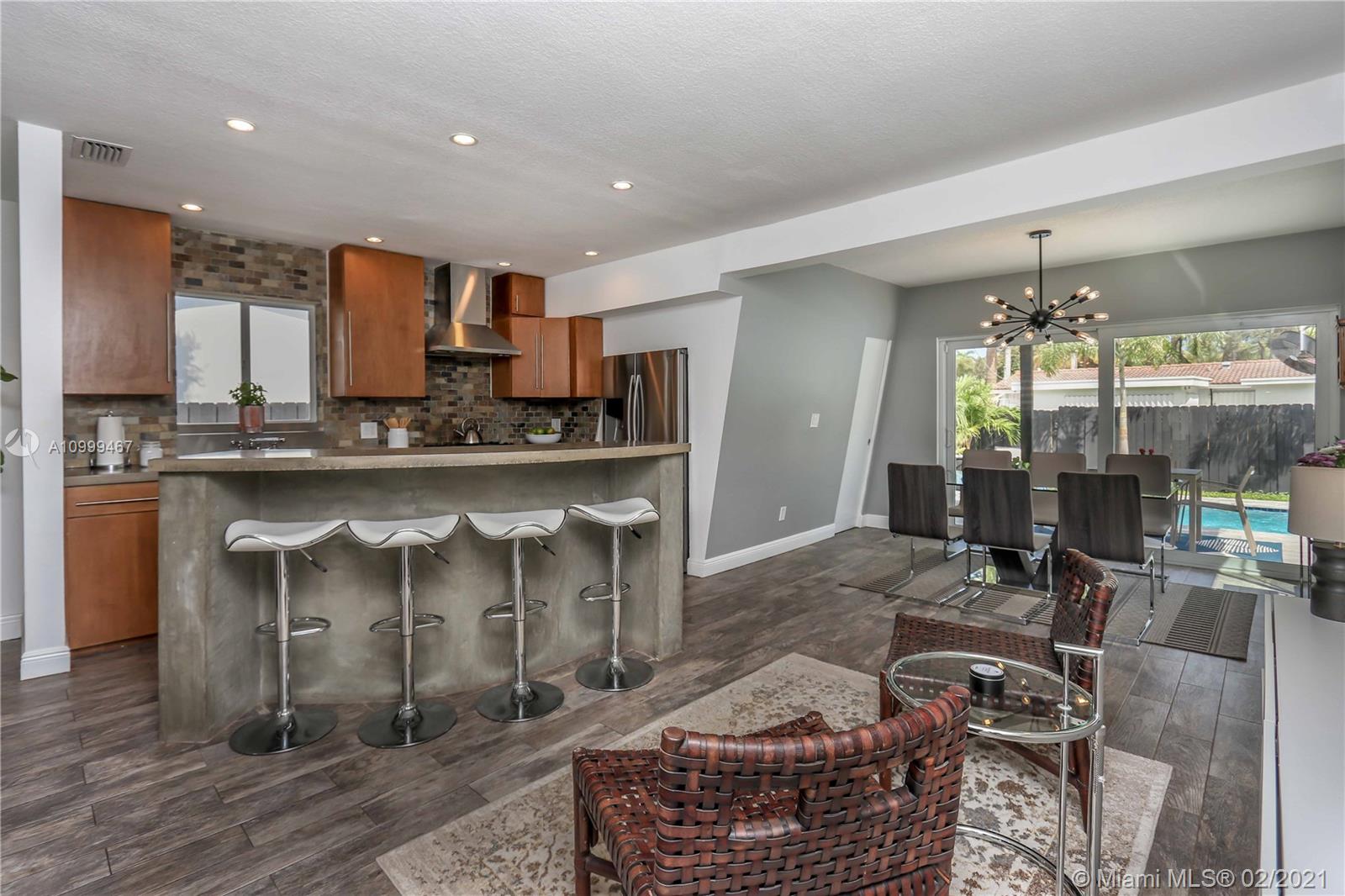 Contemporary 2 Bed/2 Bath residence with tropical landscaping and pool oasis. Featuring a circular drive, open porch, modern yet warm design elements. This superbly stylized layout continues with beautiful wood porcelain tile flooring, a sunlit living space and an open concept kitchen featuring custom island, concrete countertops, light cherry wood tone cabinetry, tile accents, ss appliances & gas stove leading to dining area. Oversized master bedroom/bath features a dual faucet sink with rainfall shower for a spa-like experience. An outdoor oasis awaits with a brand new saltwater pool perfect for entertaining. Features: Tankless Water Heater, Digital Nest Thermo, Pre-wired for ADT Camera System, Hurricane Impact Win/Shutters, Saltwater Pool, Deck, Landscaping & Lighting, Roof, AC, Shed.