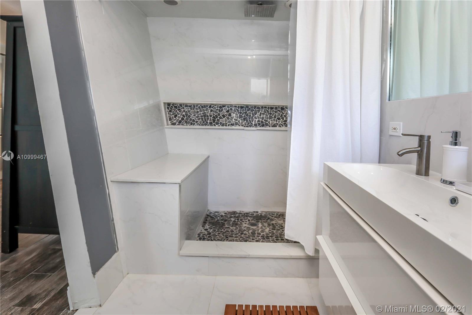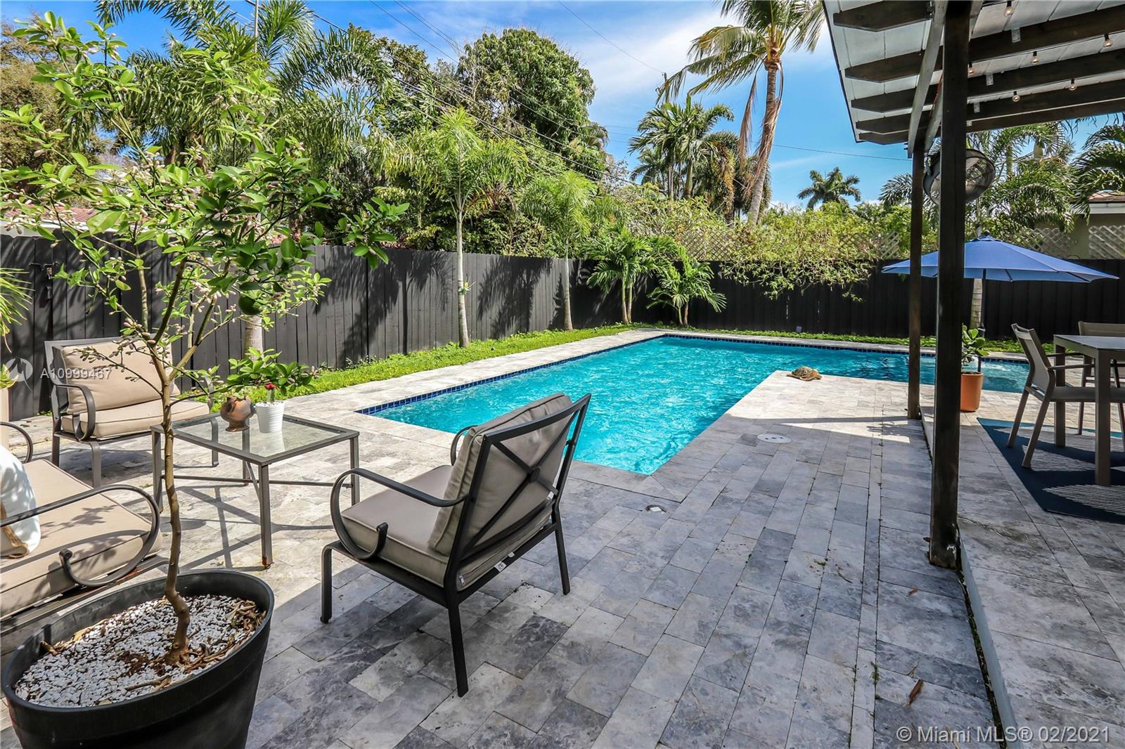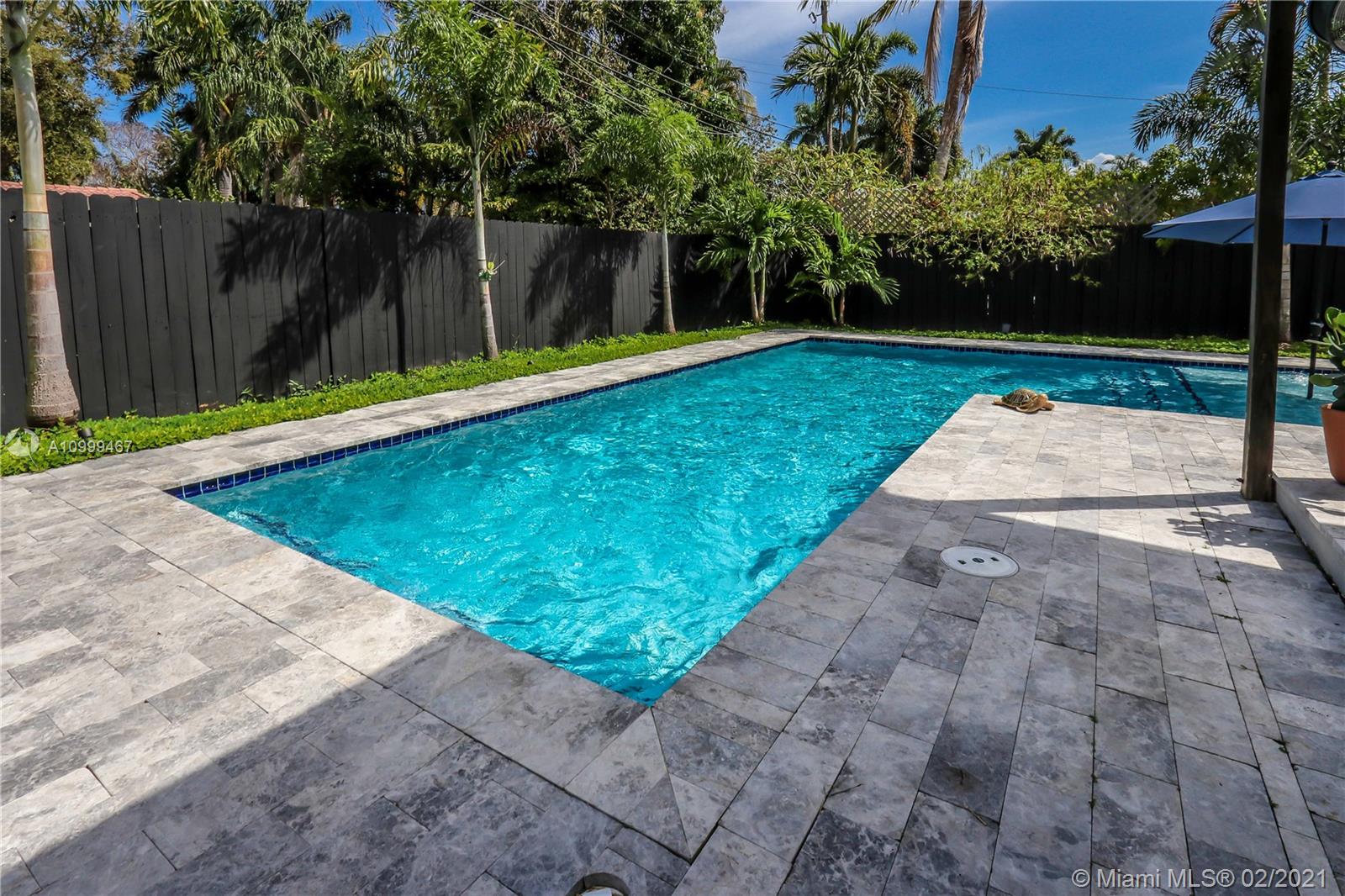 Contemporary 2 Bed/2 Bath residence with tropical landscaping and pool oasis. Featuring a circular drive, open porch, modern yet warm design elements. This superbly stylized layout continues with beautiful wood porcelain tile flooring, a sunlit living space and an open concept kitchen featuring custom island, concrete countertops, light cherry wood tone cabinetry, tile accents, ss appliances & gas stove leading to dining area. Oversized master bedroom/bath features a dual faucet sink with rainfall shower for a spa-like experience. An outdoor oasis awaits with a brand new saltwater pool perfect for entertaining. Features: Tankless Water Heater, Digital Nest Thermo, Pre-wired for ADT Camera System, Hurricane Impact Win/Shutters, Saltwater Pool, Deck, Landscaping & Lighting, Roof, AC, Shed.