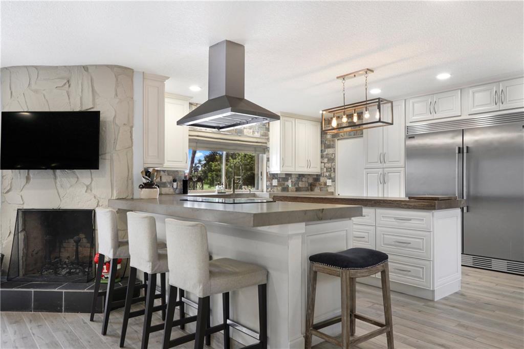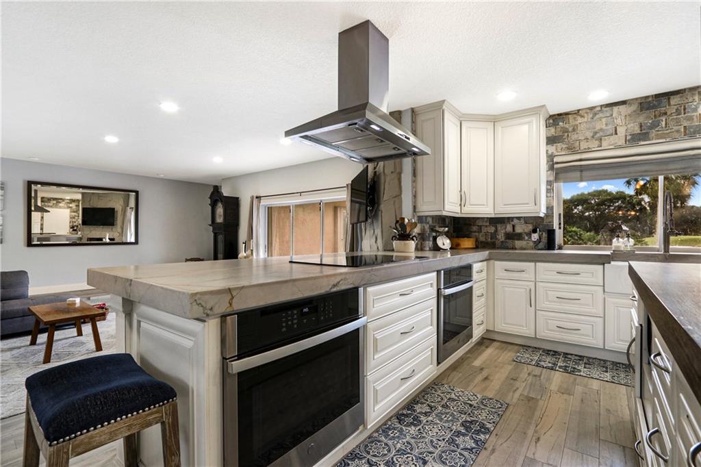 Exquisitely designed custom 5BR/3BA pool home with large paved patio on oversized waterfront lot and golf course view! Floorplan includes a playroom, den/gym, living room, and family room with built-in wet bar and cabana bath! Chef's dream with fully renovated kitchen open to the dining and living rooms featuring 2 Bluetooth ovens, range hood with superior ventilation, commercial size fridge/freezer, dual drawer dishwasher, farmhouse sink, quartz countertops, snack bar plus large island with walnut quartzite. New flooring throughout entire home! Great space for entertaining & lots of natural light via indoor atrium. Wood burning fireplace. Remodeled master bath is like a spa retreat with oversized whirlpool tub and sauna! You must see this home to truly appreciate it! Shown By Appt Only.