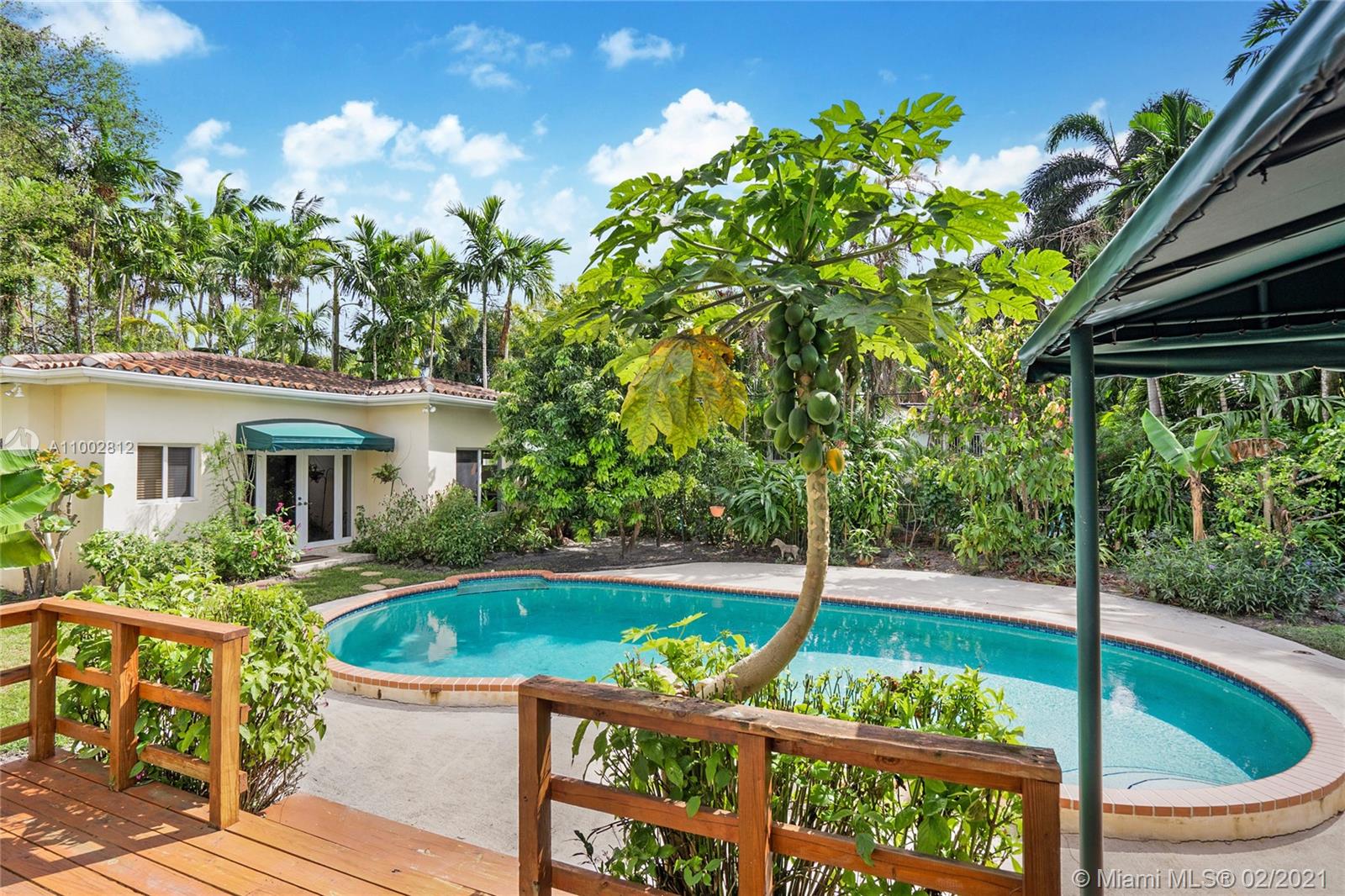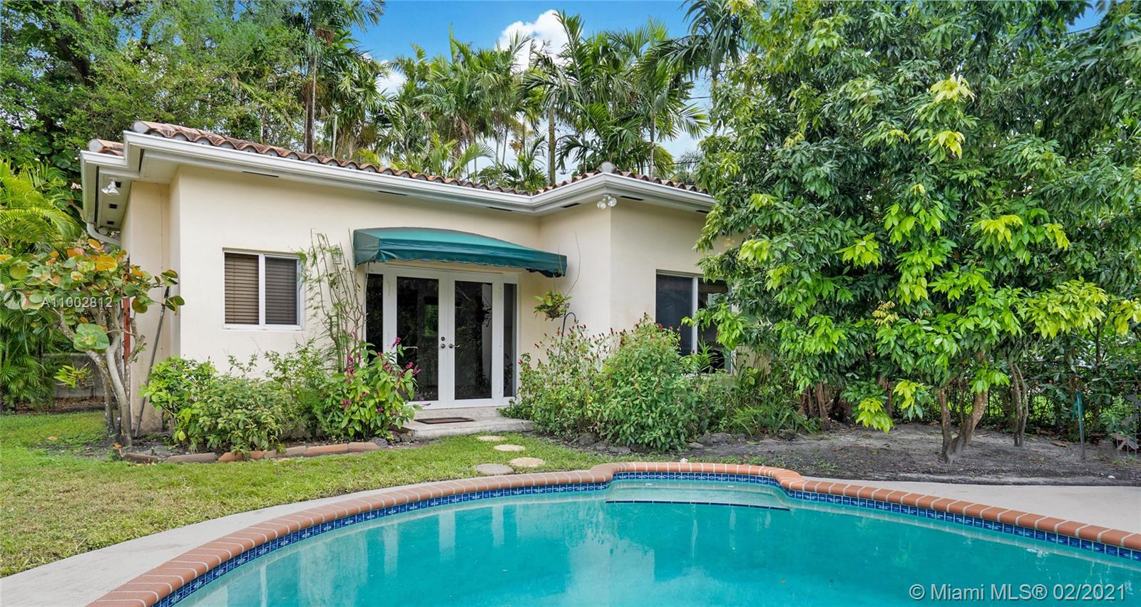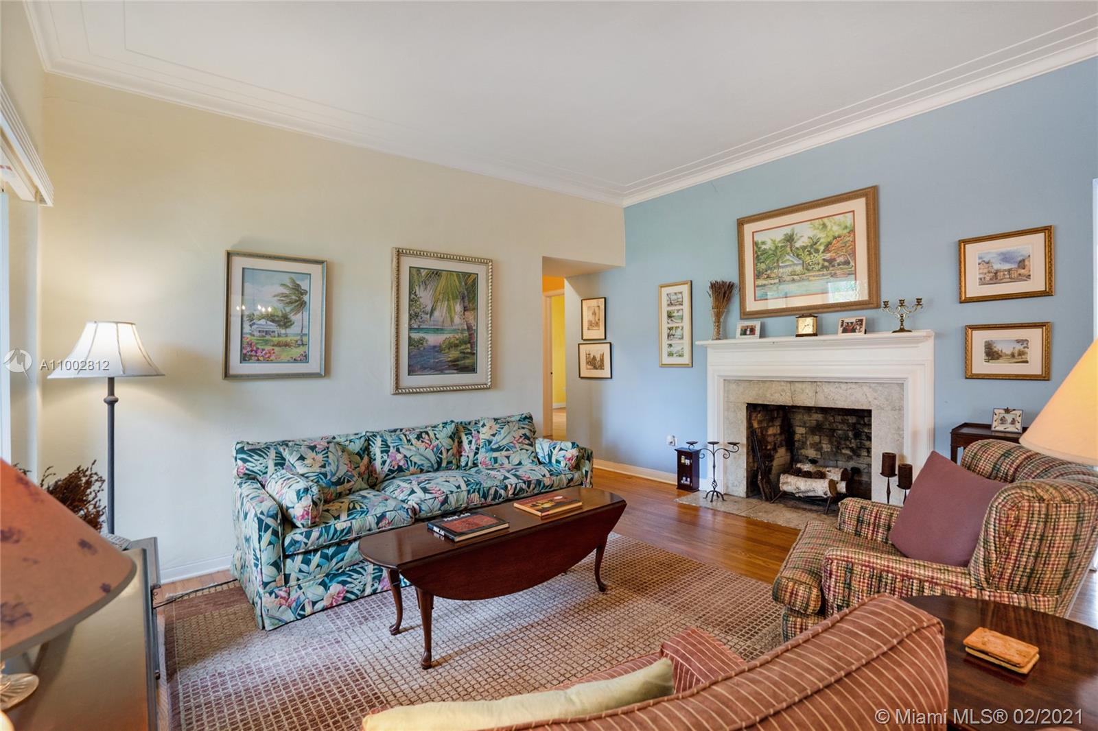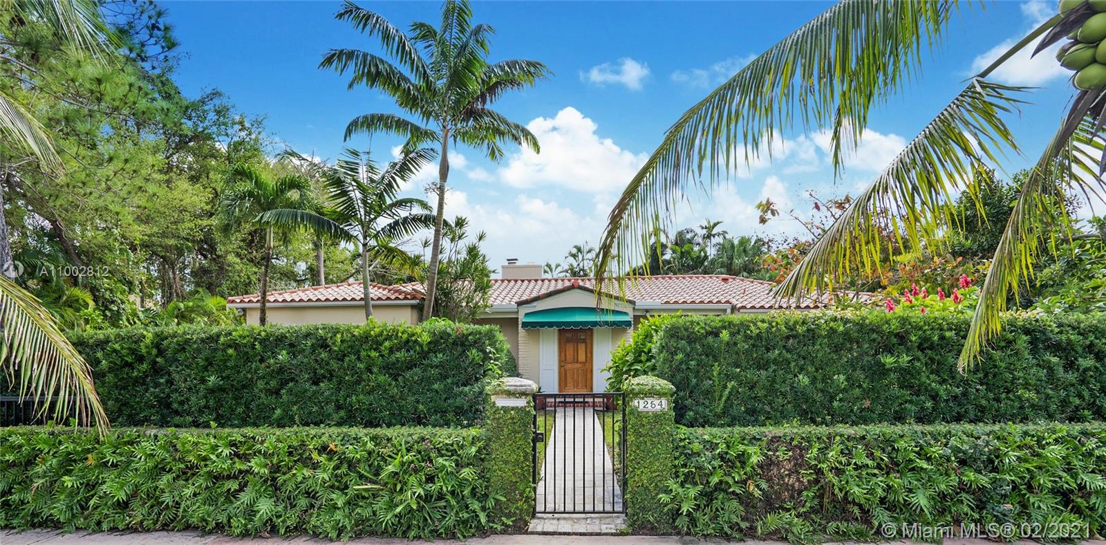 Located in a Prime Coral Gables location, behind a privacy wall, this 4 bd, 3 bath residence w/ cottage is on a quiet, low traffic street. The 12,000 sq. ft. lot is laden w/ exotic plants & fruit trees. Garden vistas from every rm. Charming details are exemplified by hardwood floors, fireplace in living rm & gabled ceiling in fam rm. Modern features incl Impact windows/doors/barrel tile roof. Large updated kitchen w/ granite countertops/island/ breakfast bar/eat in area/home office ideal for a family. Home offers a split plan: Master on west side features Bay window/window seat/ample closets. 3 bdrms & 2 baths on east side. The 592 sq ft cottage features high ceilings, saturnia flooring, large liv area/Murphy bed/full bath/kitchen & office space. All cast iron pipes have been replaced.