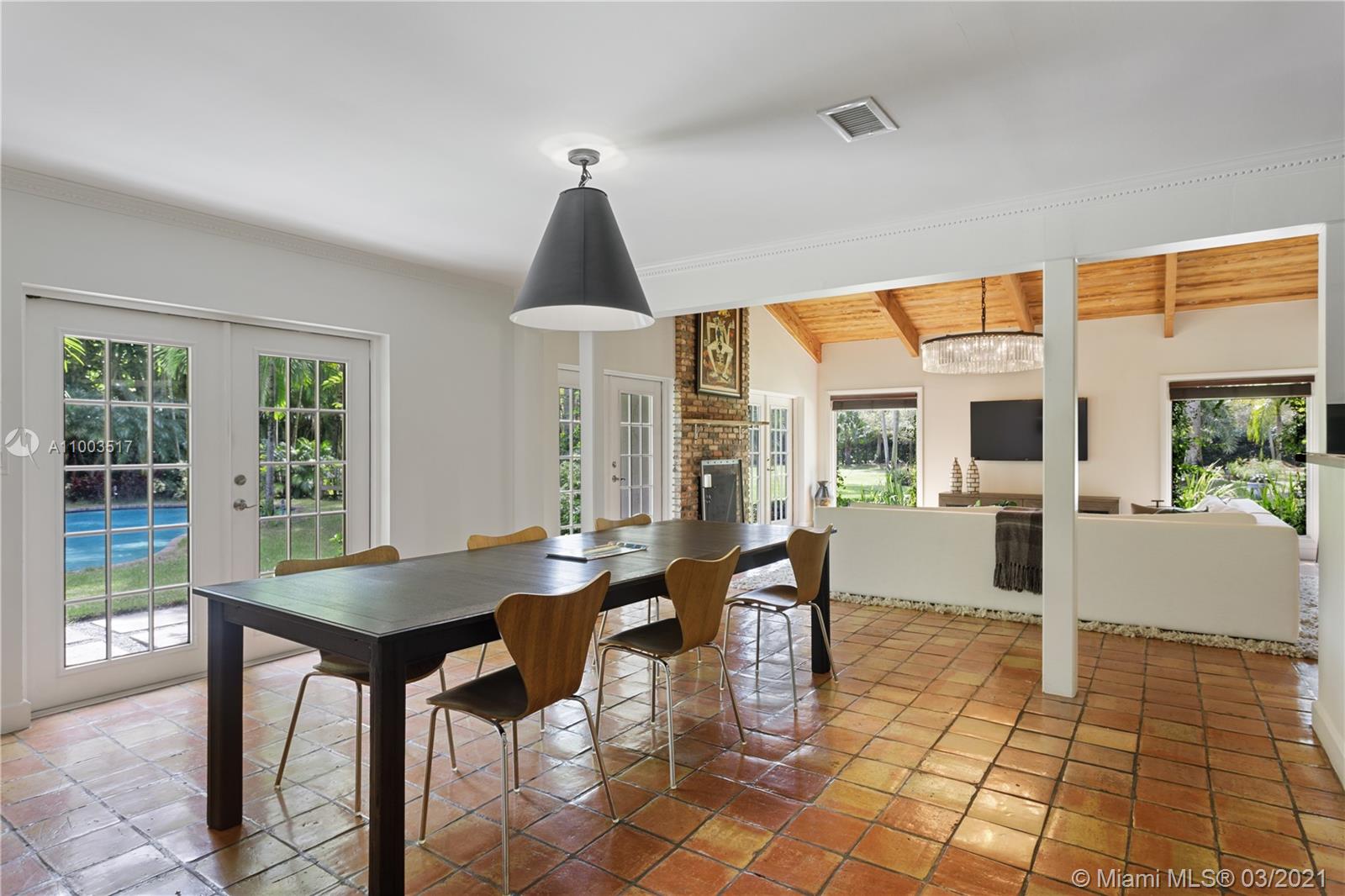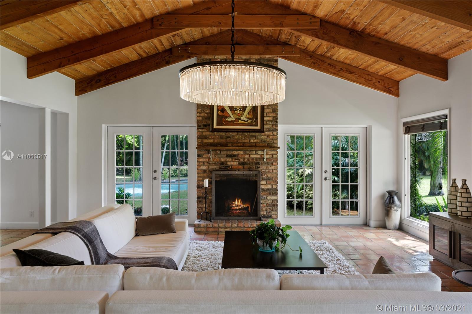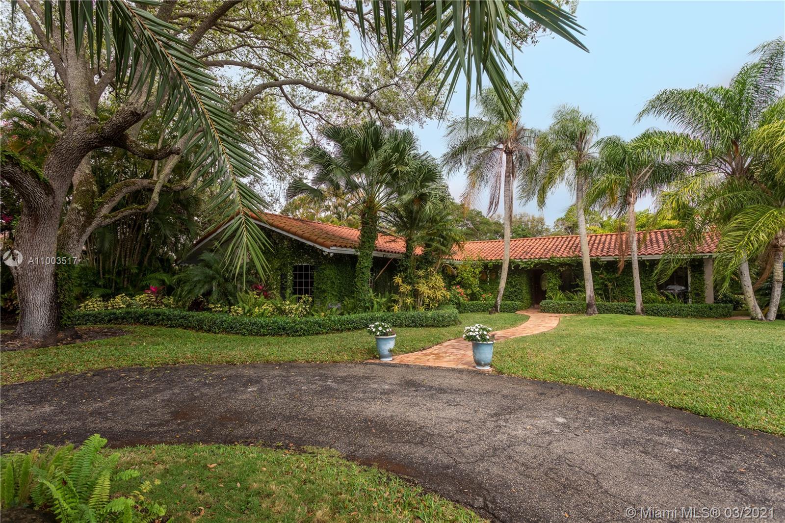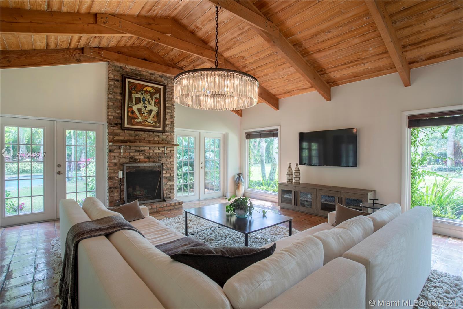 Beautiful Pinecrest ranch style pool home surrounded by lush tropical fruit trees on huge lot (52,000+ sq ft). Five full bedrooms plus an office or den or both, you choose. Master suite is enormous with sunken tub, separate shower, large walk-in closet and dressing room. Features a formal living room with a working fireplace, formal dining room plus a light airy Florida/family room with skylights. Vaulted ceilings with exposed wood beams and plenty of natural light in every room. Other features include a large circular driveway, an electric gated entrance for privacy, a hot tub just outside the master bathroom. Inside the Pinecrest elementary school district.