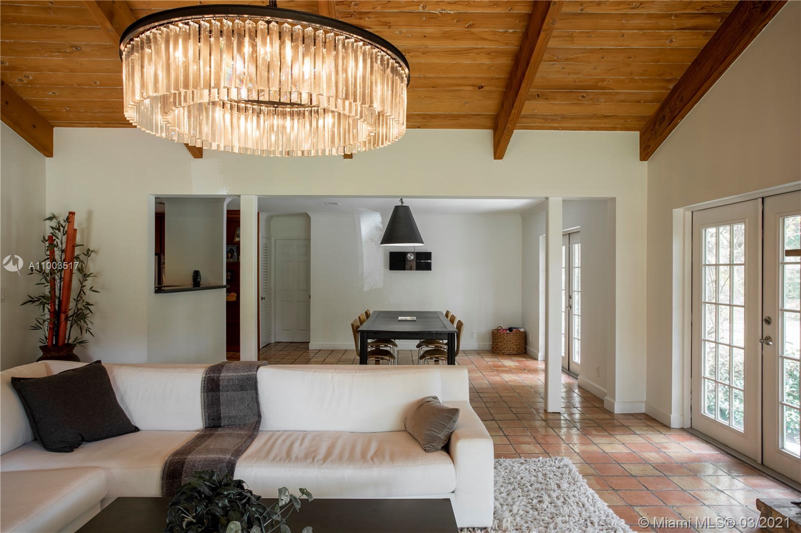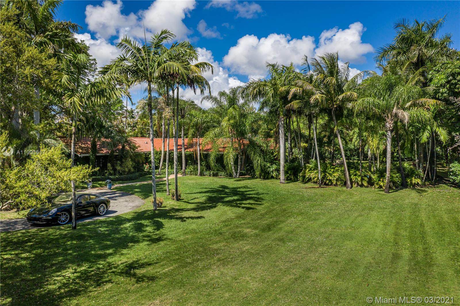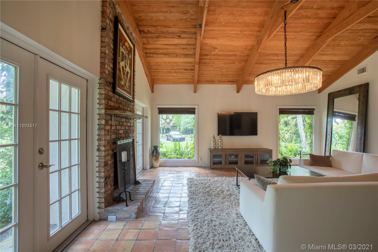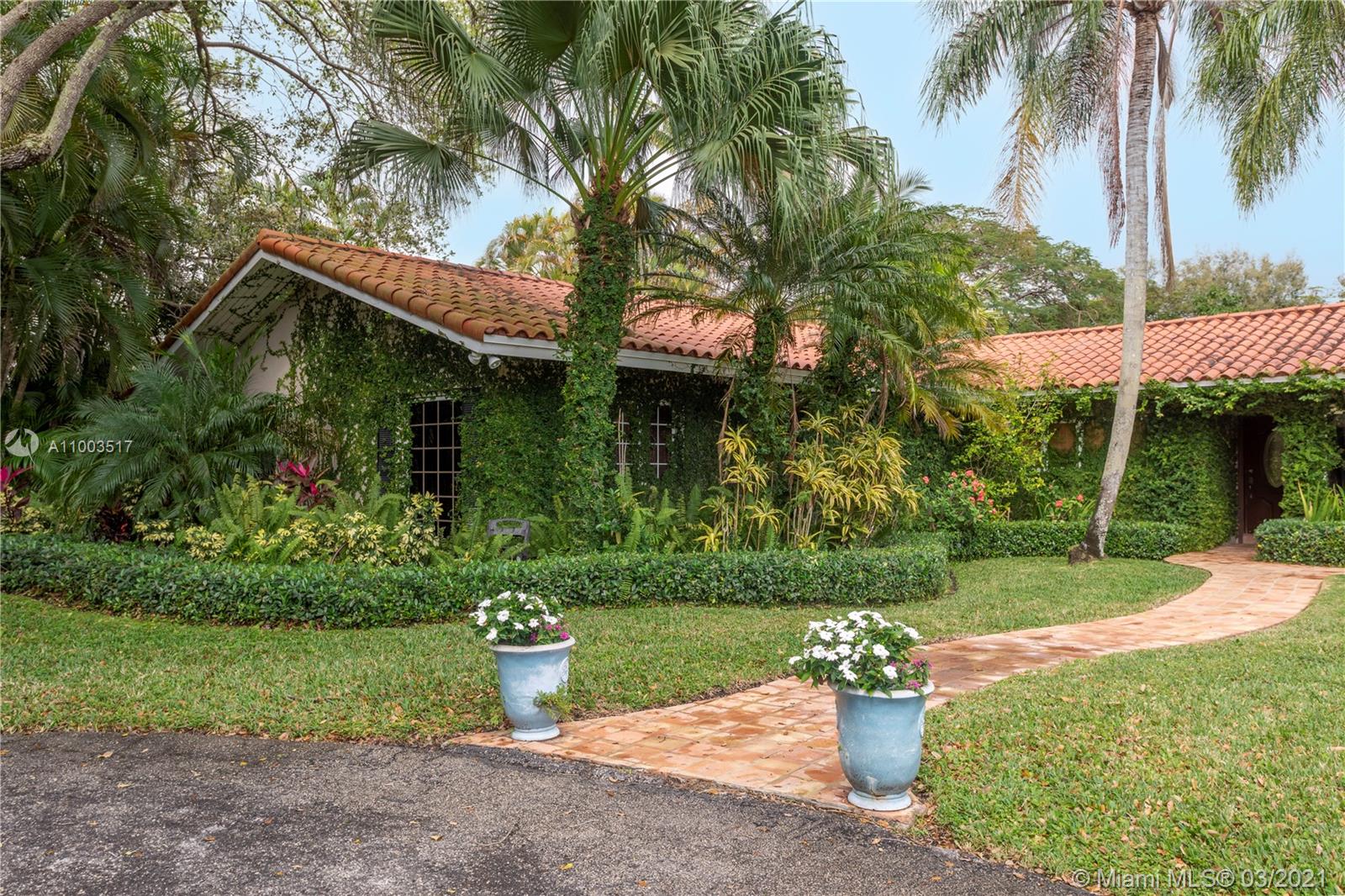 Beautiful Pinecrest ranch style pool home surrounded by lush tropical fruit trees on huge lot (52,000+ sq ft). Five full bedrooms plus an office or den or both, you choose. Master suite is enormous with sunken tub, separate shower, large walk-in closet and dressing room. Features a formal living room with a working fireplace, formal dining room plus a light airy Florida/family room with skylights. Vaulted ceilings with exposed wood beams and plenty of natural light in every room. Other features include a large circular driveway, an electric gated entrance for privacy, a hot tub just outside the master bathroom. Inside the Pinecrest elementary school district.