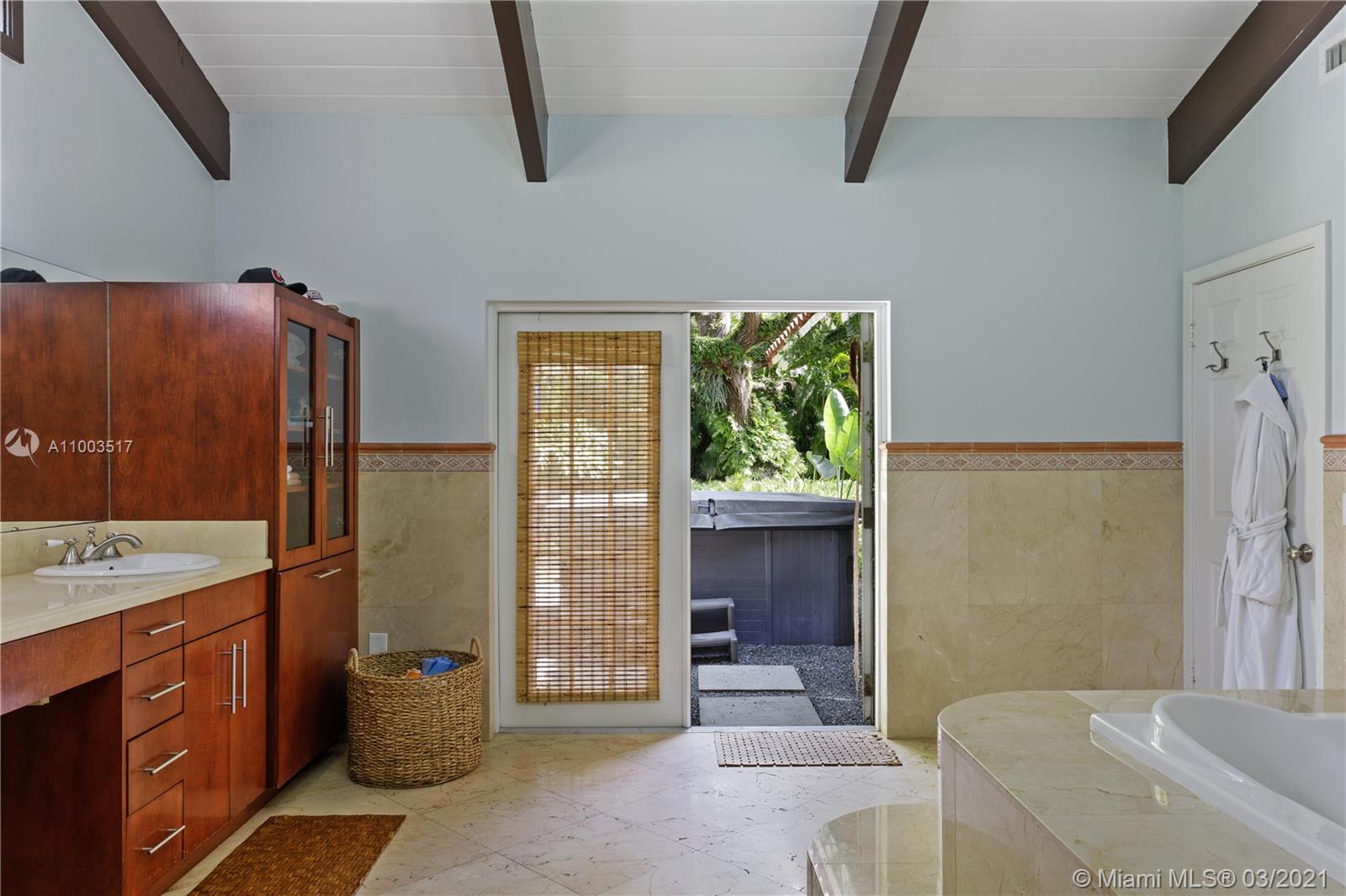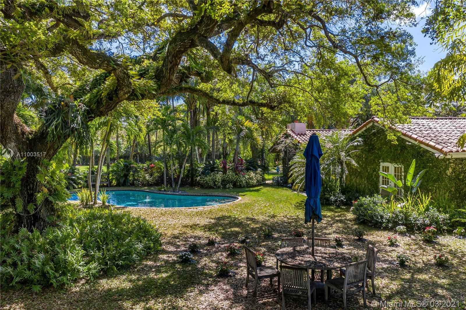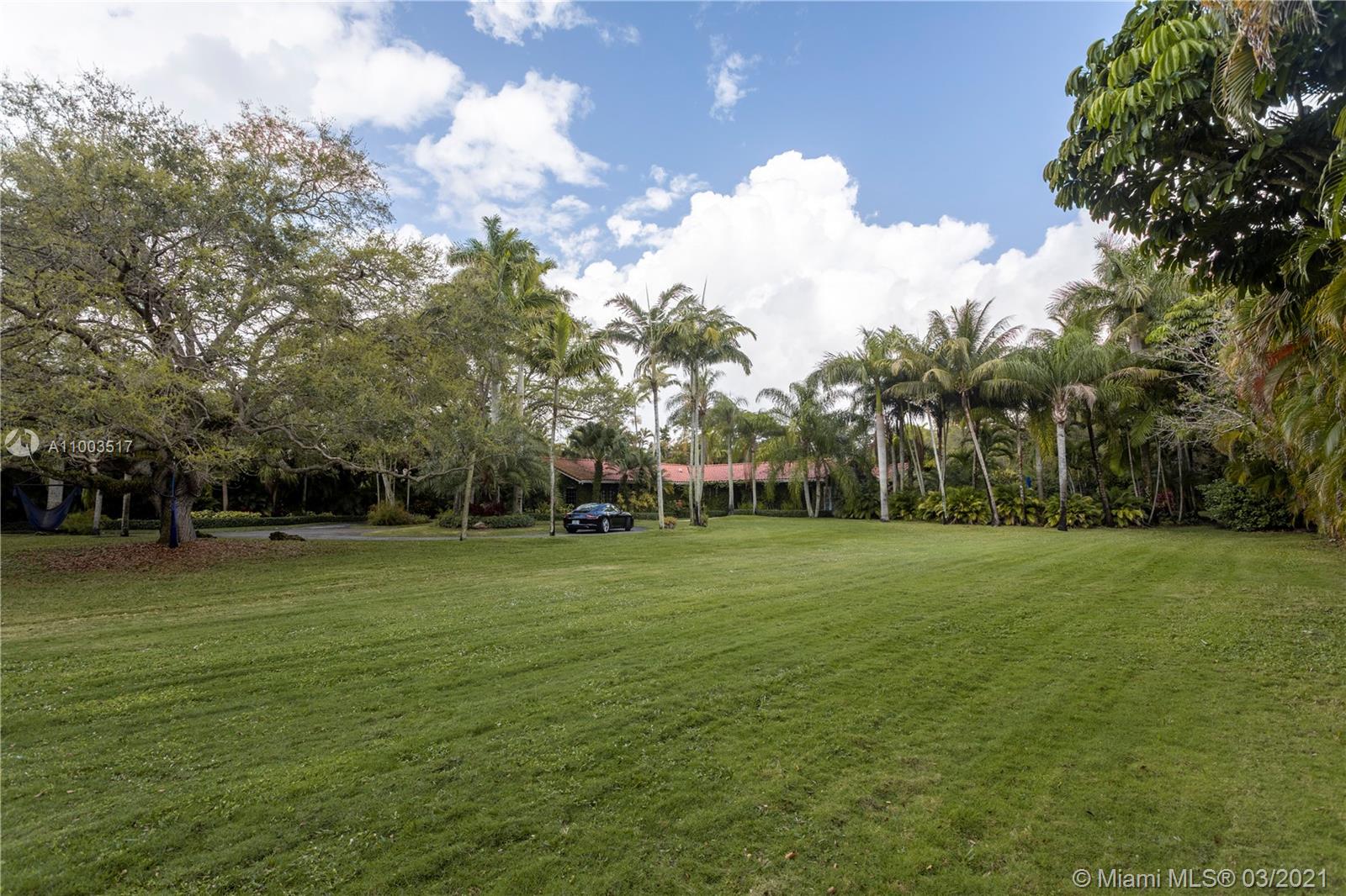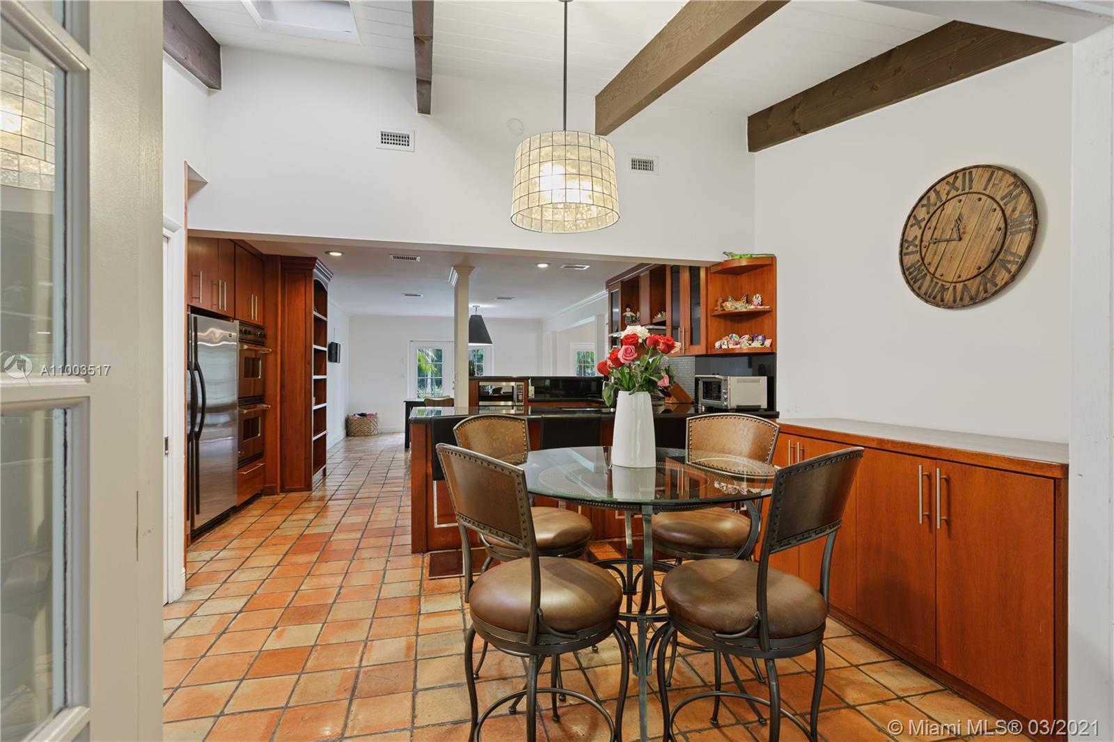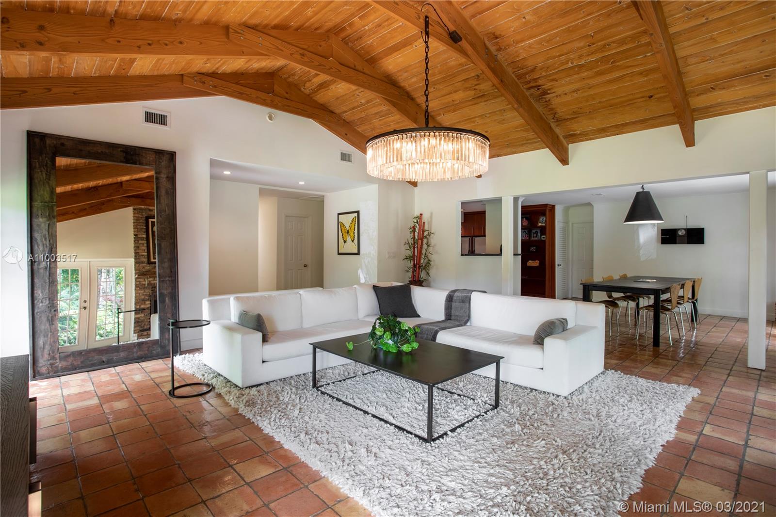 Beautiful Pinecrest ranch style pool home surrounded by lush tropical fruit trees on huge lot (52,000+ sq ft). Five full bedrooms plus an office or den or both, you choose. Master suite is enormous with sunken tub, separate shower, large walk-in closet and dressing room. Features a formal living room with a working fireplace, formal dining room plus a light airy Florida/family room with skylights. Vaulted ceilings with exposed wood beams and plenty of natural light in every room. Other features include a large circular driveway, an electric gated entrance for privacy, a hot tub just outside the master bathroom. Inside the Pinecrest elementary school district.