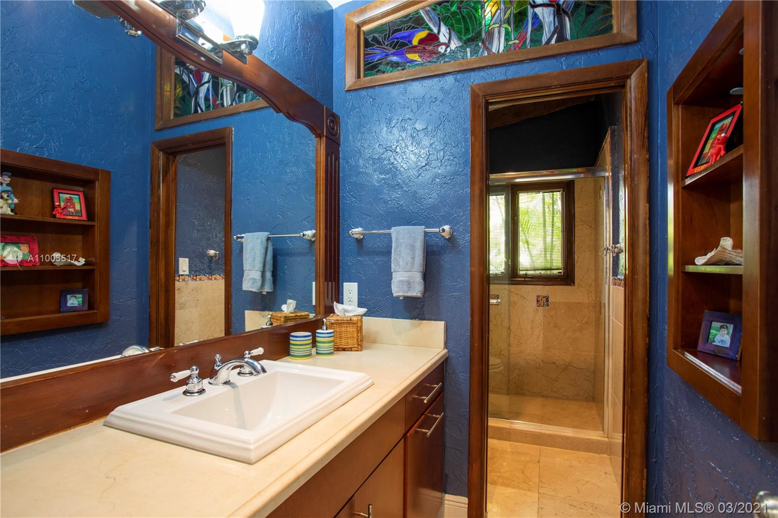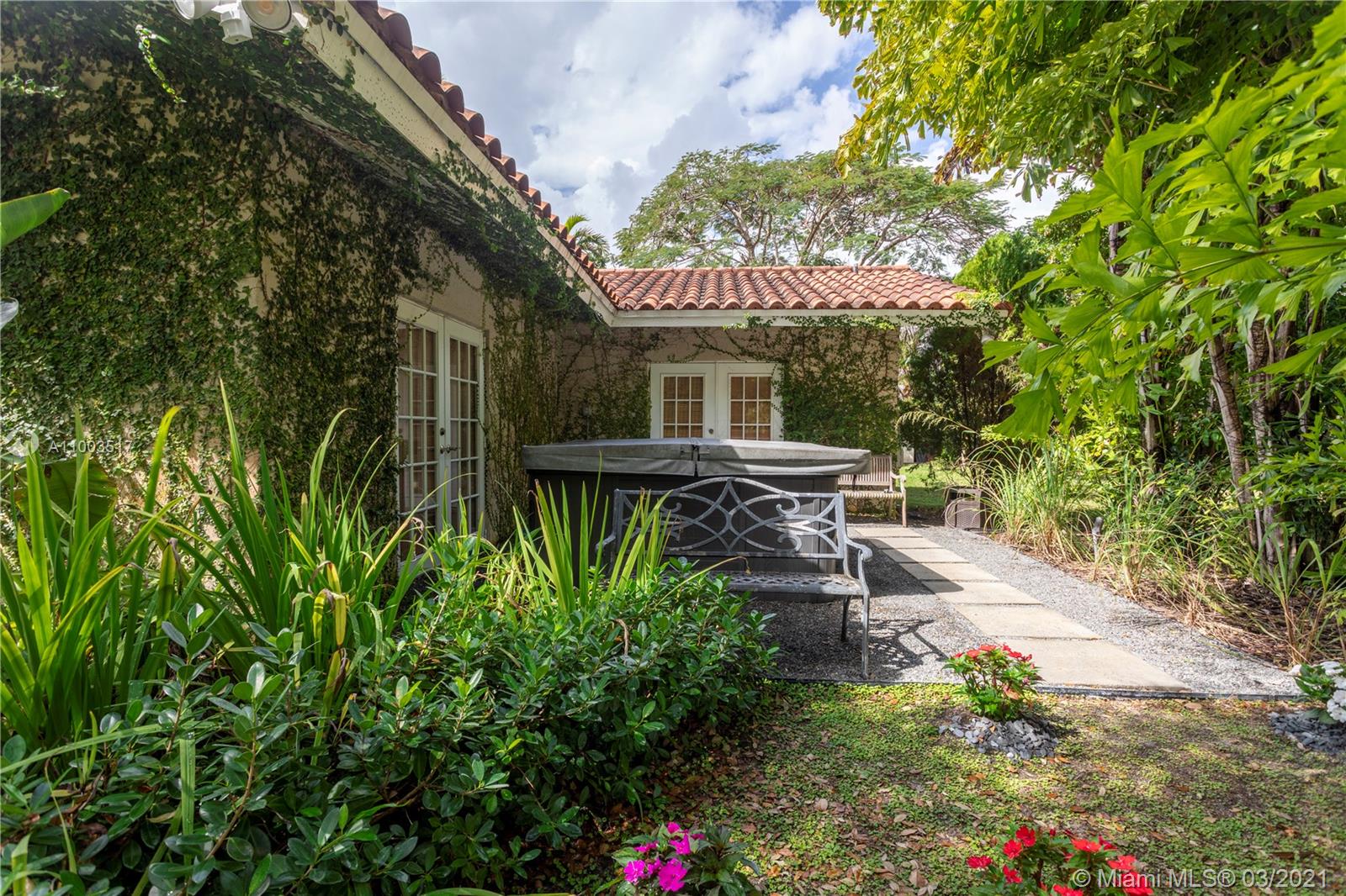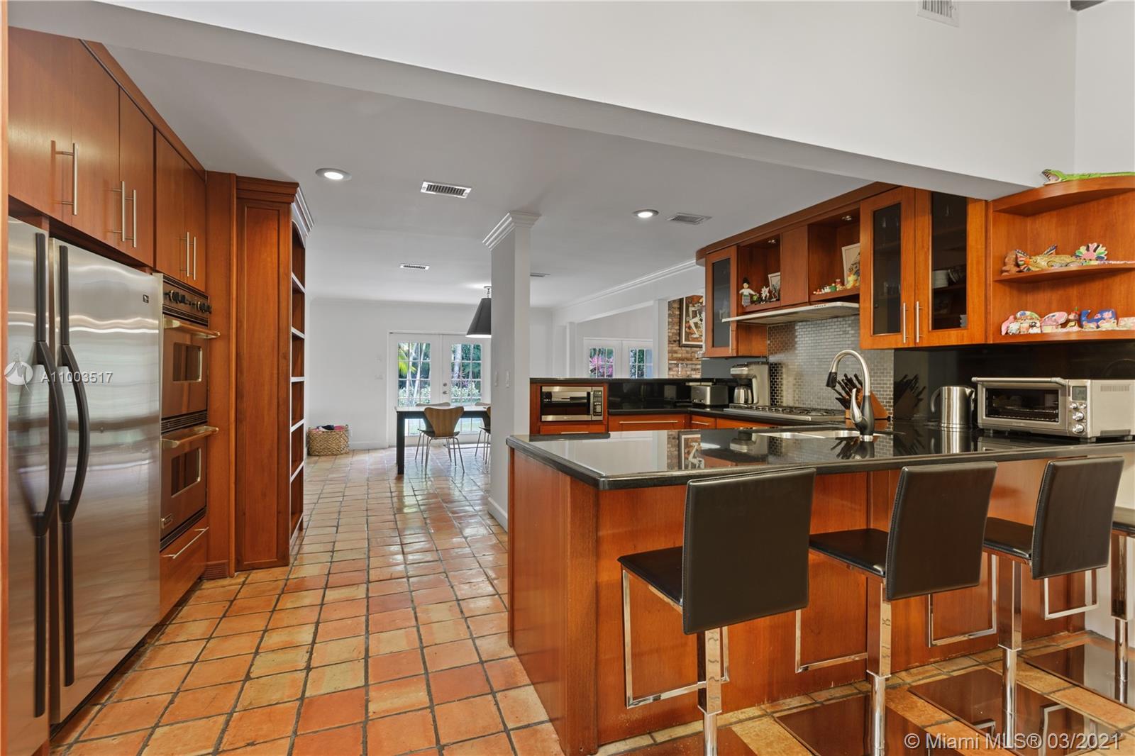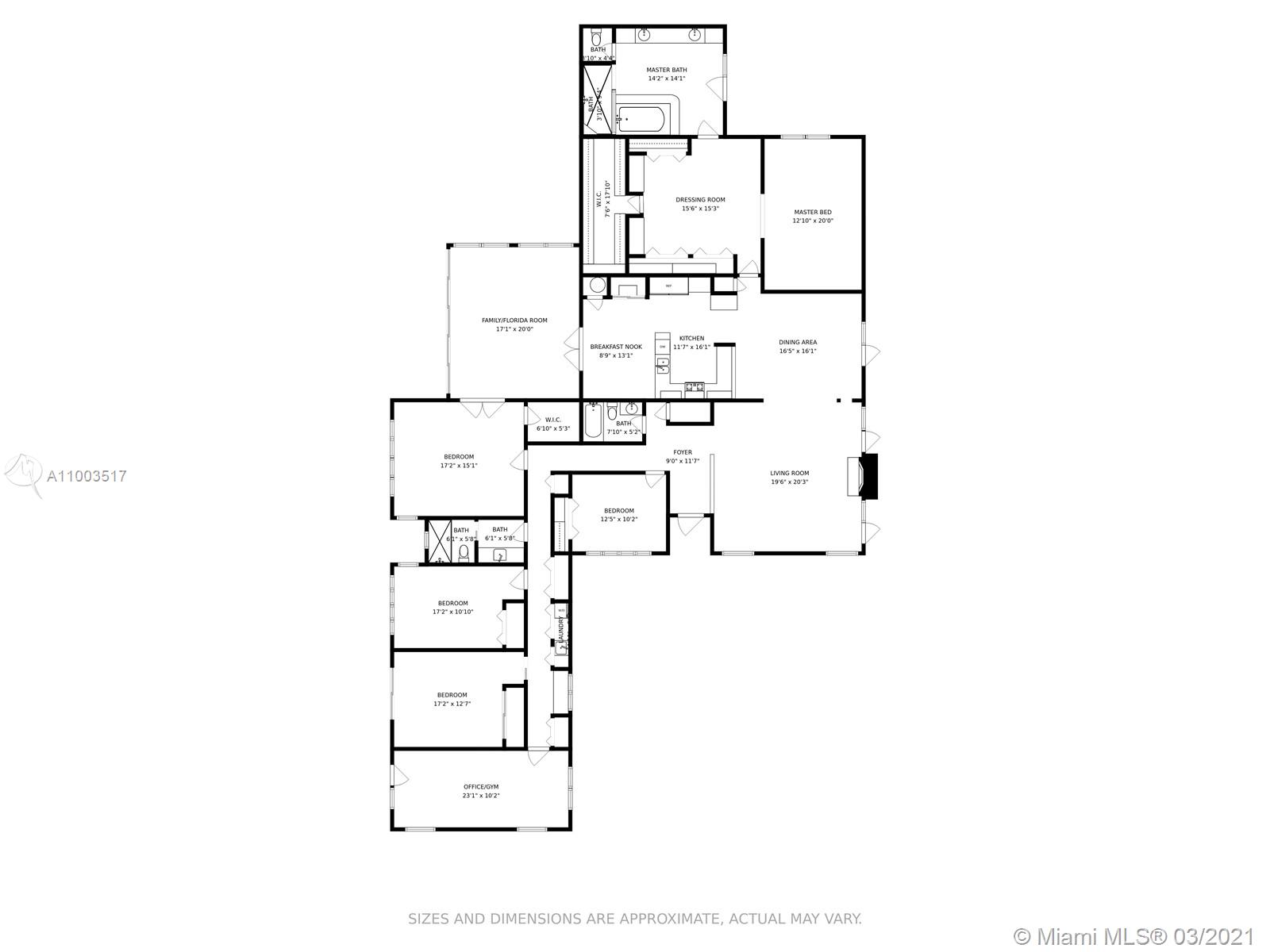 Beautiful Pinecrest ranch style pool home surrounded by lush tropical fruit trees on huge lot (52,000+ sq ft). Five full bedrooms plus an office or den or both, you choose. Master suite is enormous with sunken tub, separate shower, large walk-in closet and dressing room. Features a formal living room with a working fireplace, formal dining room plus a light airy Florida/family room with skylights. Vaulted ceilings with exposed wood beams and plenty of natural light in every room. Other features include a large circular driveway, an electric gated entrance for privacy, a hot tub just outside the master bathroom. Inside the Pinecrest elementary school district.