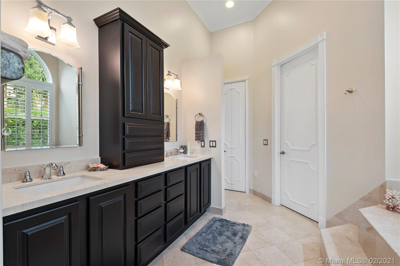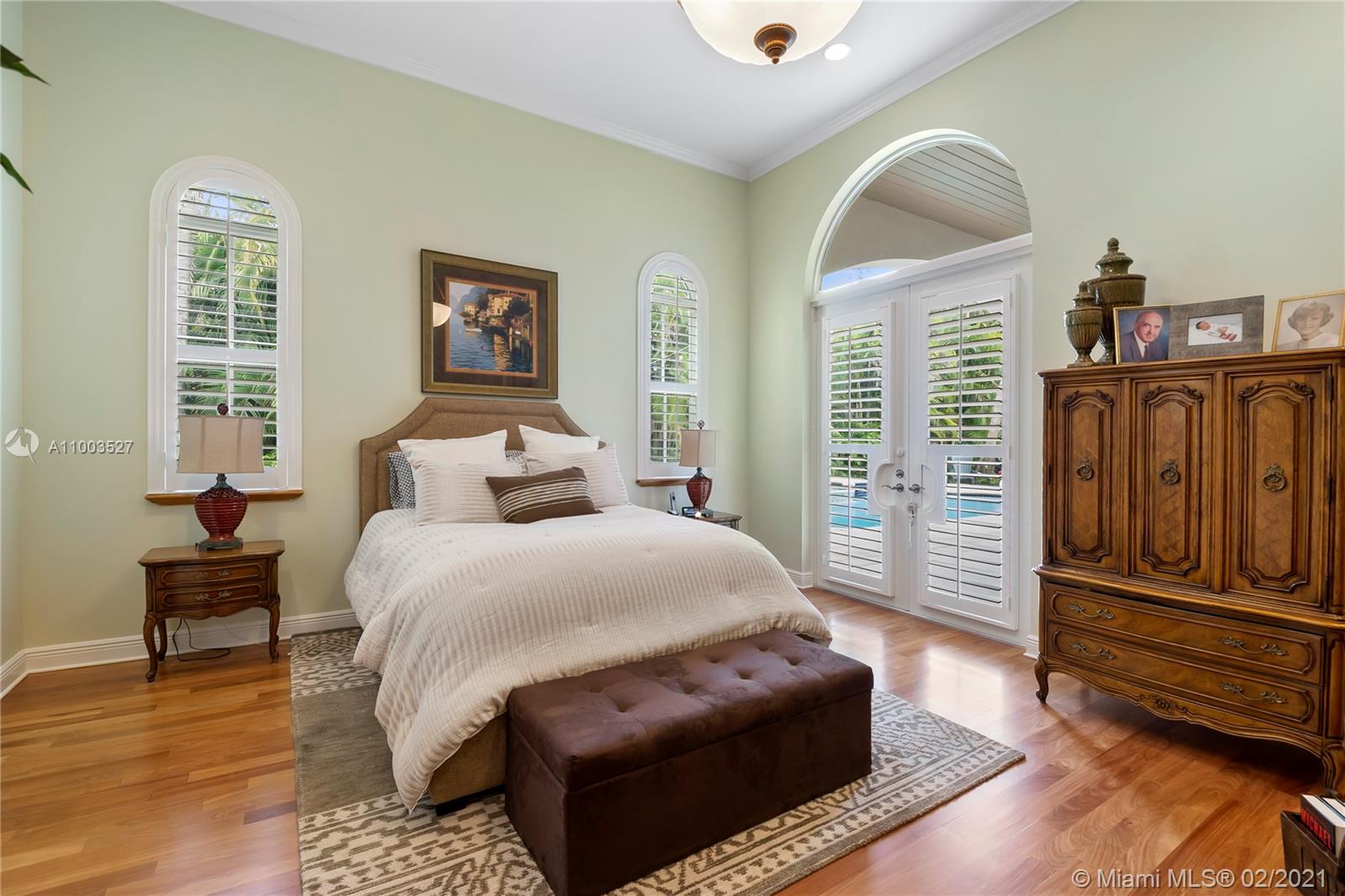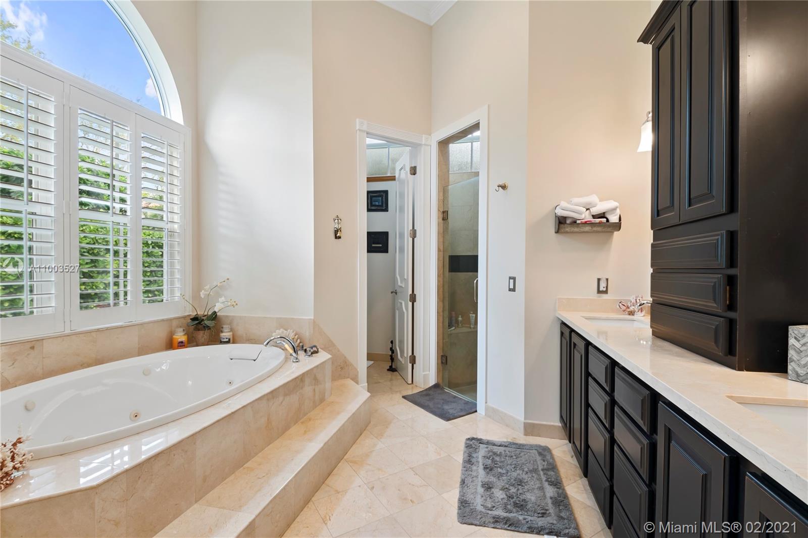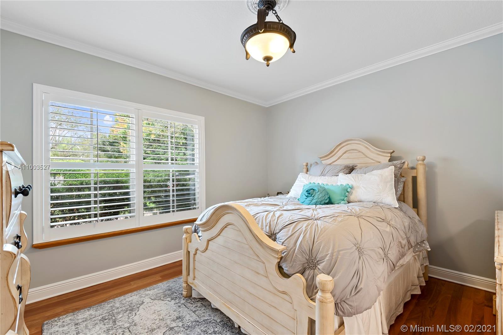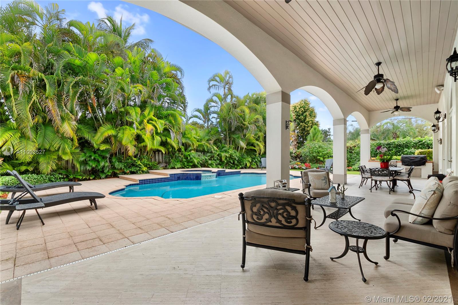 Pinecrest gated estate! This 5 bedroom, 4 bath home has it all---impact windows and doors, high ceilings fill the house with natural light, plantation shutters, large open kitchen with breakfast nook, formal living room, formal dining room with wet bar, new roof, new ac units, split plan with guest 1/1, spacious master suite with sitting area, huge walk-in closet and spa like bath, wonderful patio with summer kitchen and pool area on lush tropical lot. Indoor laundry room, 2 car garage.
