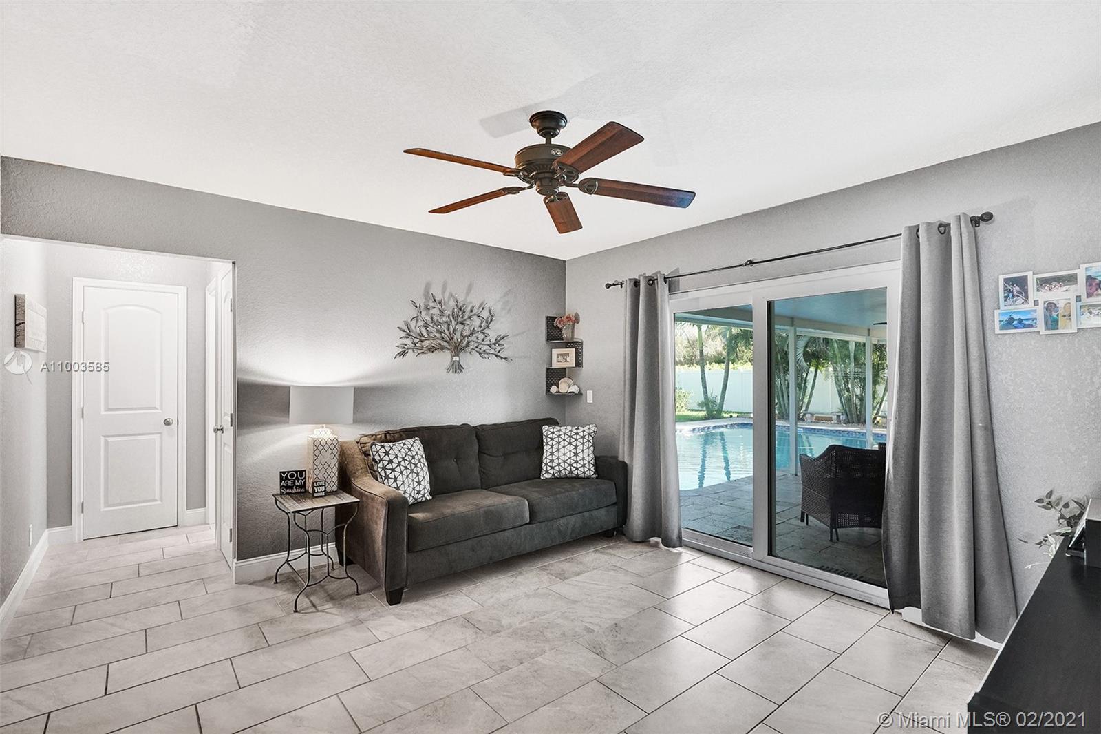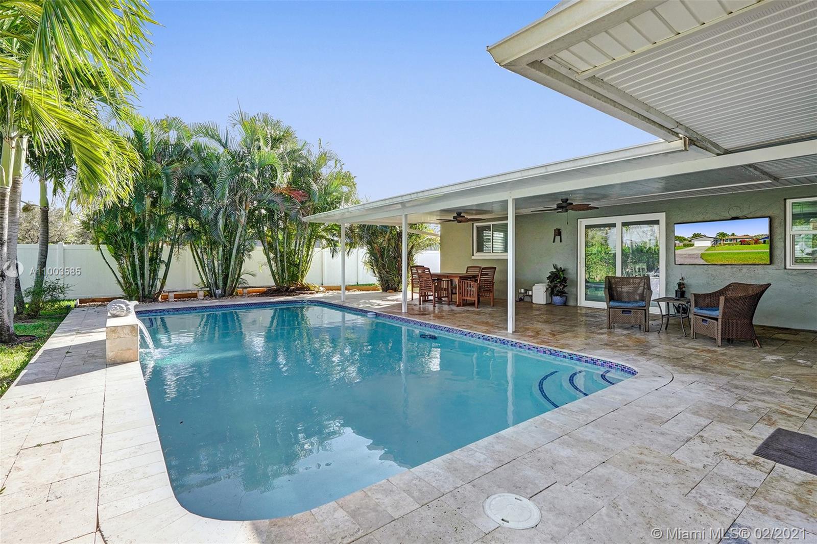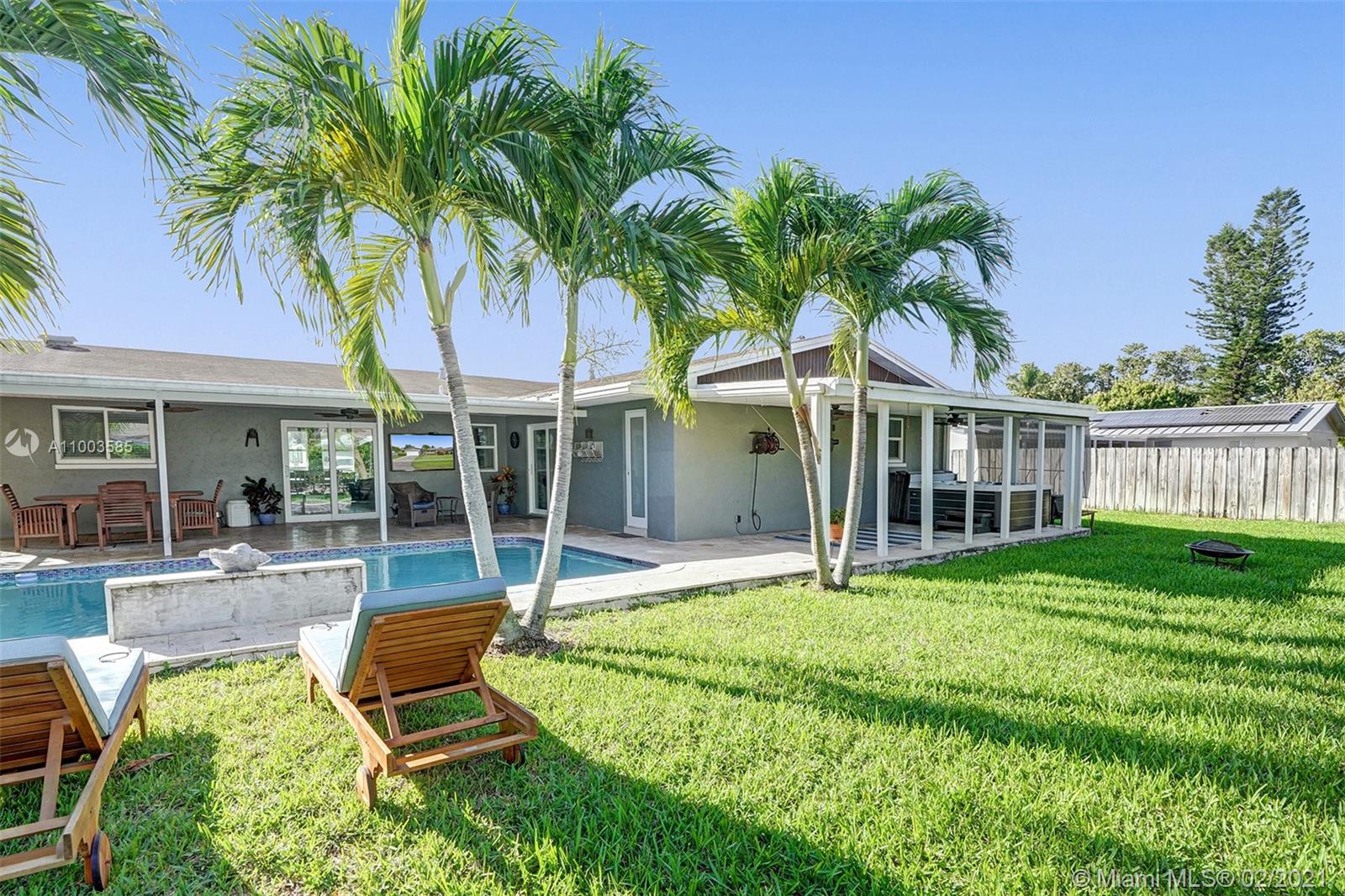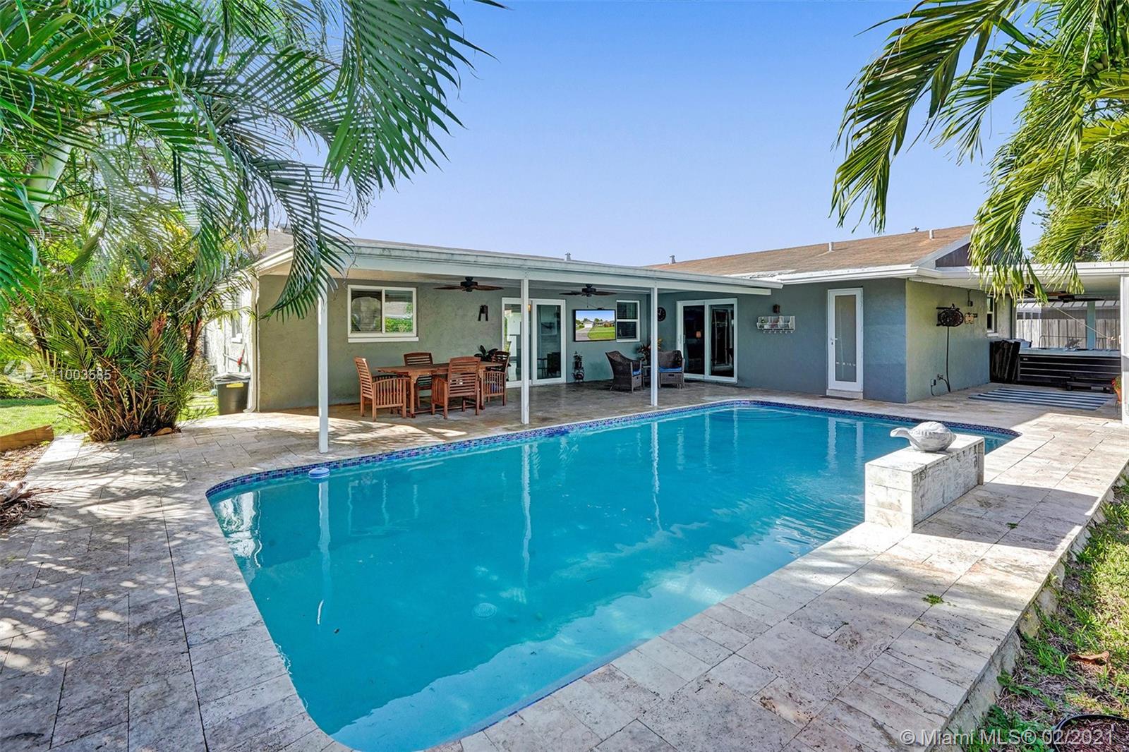 Come fall in love with this stunning 3 Bedroom 2 bathroom plus a large bonus room that can be used as a 4th room or a 2nd entertaining area. This gorgeous pool home is nestled on an oversized ¼ acre private lot that is settled on a beautiful & peaceful cul-de-sac street. This home features a bright & spacious split-floorplan with an impressive open-concept kitchen perfectly completed with crown moldings, exotic stone countertops, and room for a dinette. The backyard feels like a tropical paradise with lovely palm trees, marble-stone deck, resort-style pool w/ waterfall, and a brand-new hot tub that will have you feeling like you’re in heaven! Newly completed renovations include Impact Windows & Doors, A/C, Patio Roof, Pool & pump Hot tub, Kitchen & Baths, bring your boat, RV, trucks No HOA