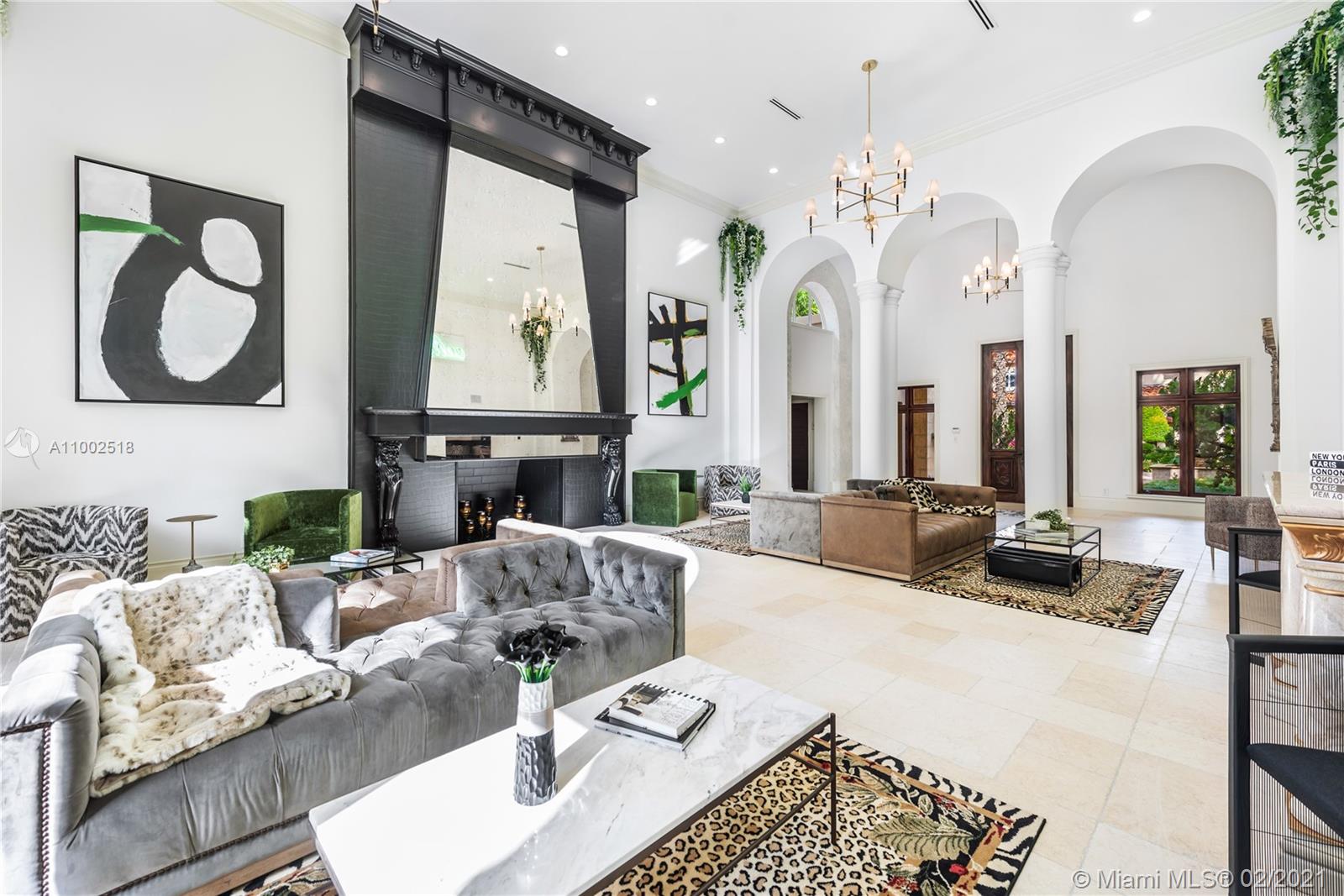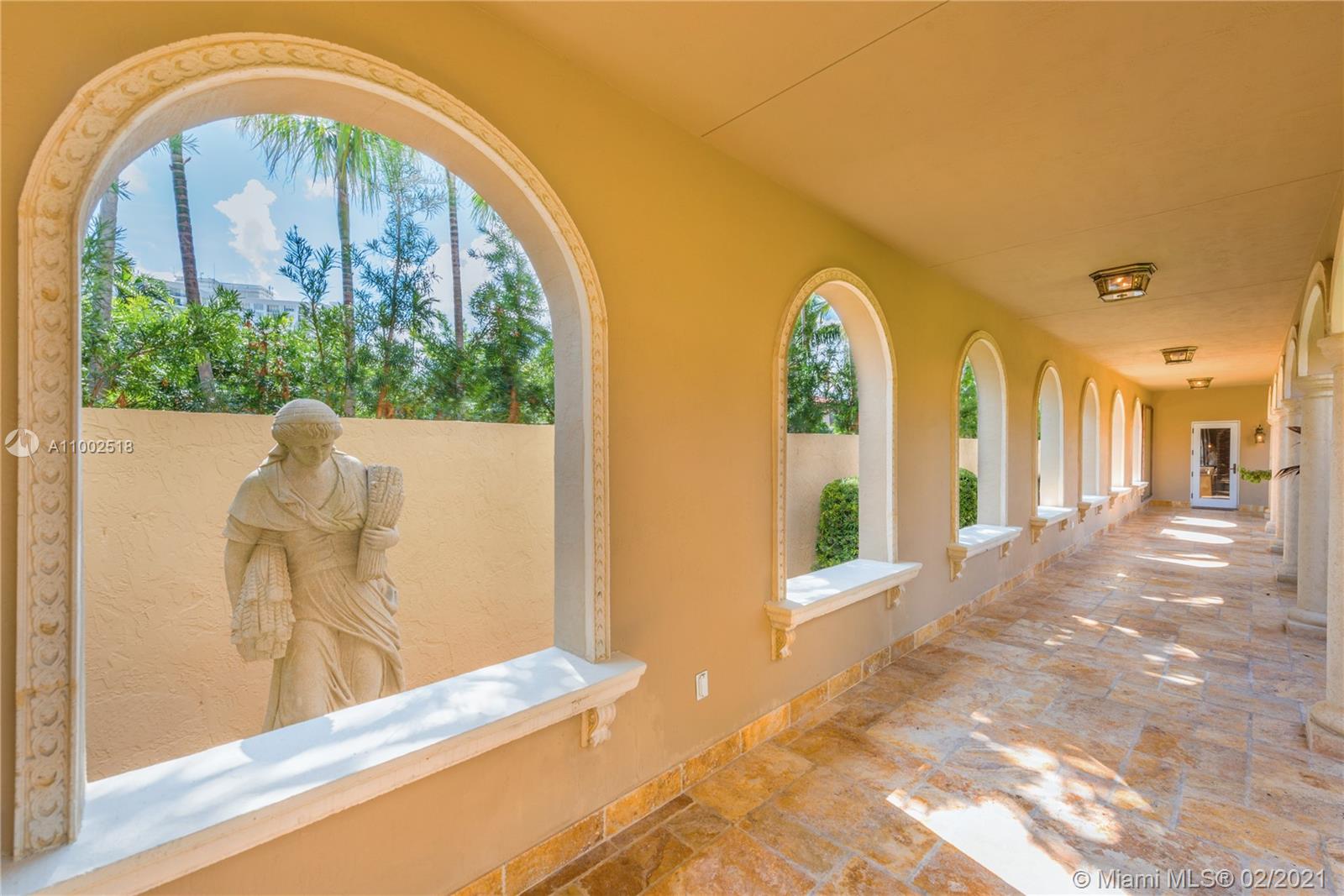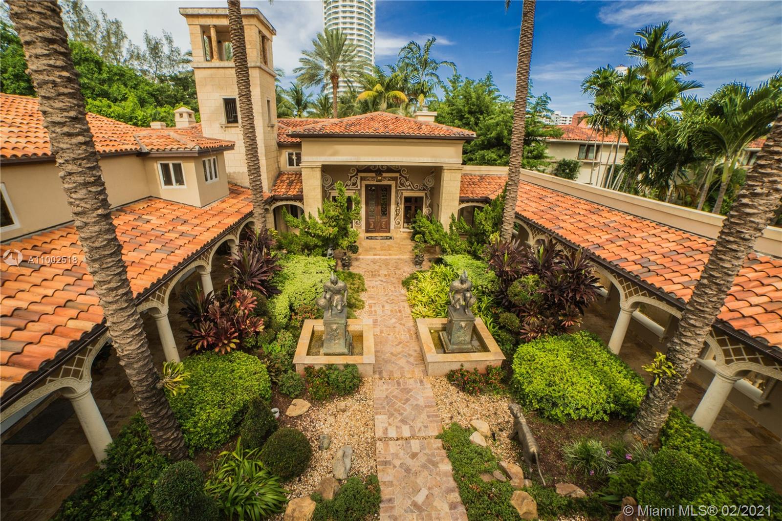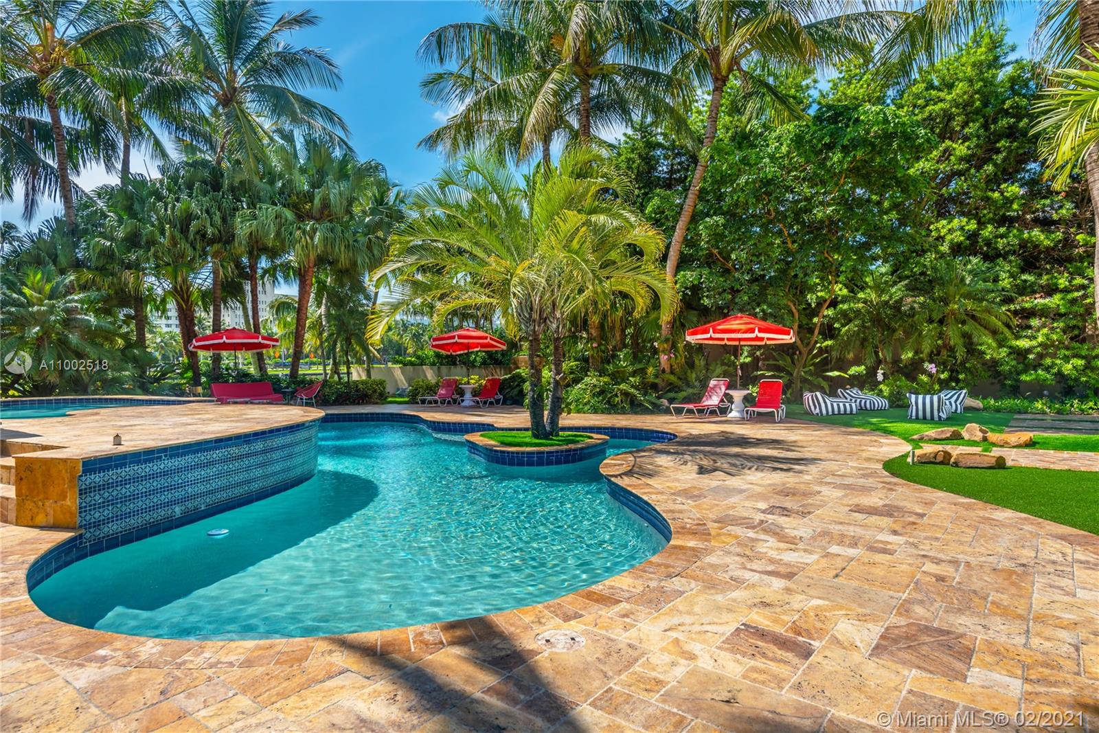 One of a kind estate on a 39,000 sq ft lot. Beautiful open courtyard. A recently renovated grand estate offering exquisite mahogany wood details, 25' fireplace, game room, 2 separate private guest houses, staff room, office, gourmet kitchen w/island, impressive large master suite, terraces, loggias, fountains, resort style pool, gazebo, summer kitchen, and outstanding grounds. 10 bedrooms, 10 bathrooms, 3 half baths. A total of 4 kitchens throughout the property. Excellent dockage for large 100ft+ yacht plus additional boat lift and jet ski lift. Equipped with natural gas generator to power the complete home. Luxury abounds throughout this extraordinary waterfront estate. Impressive views to the historical founainebleau hotel. No neighbors to your left side.