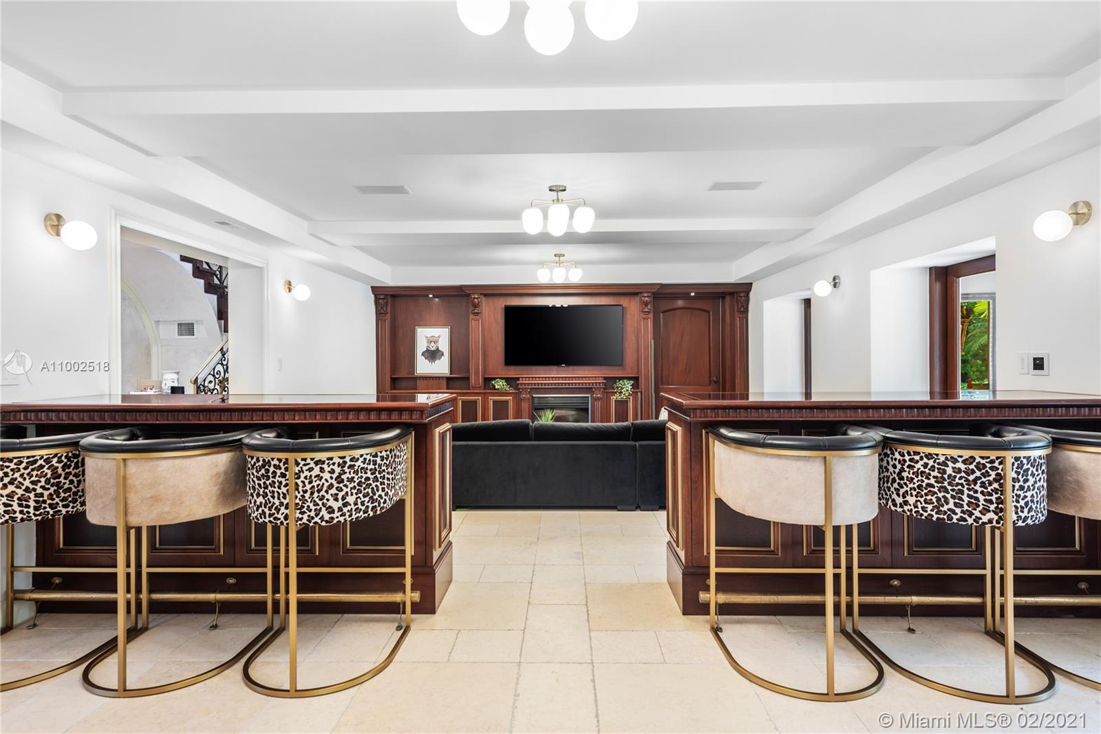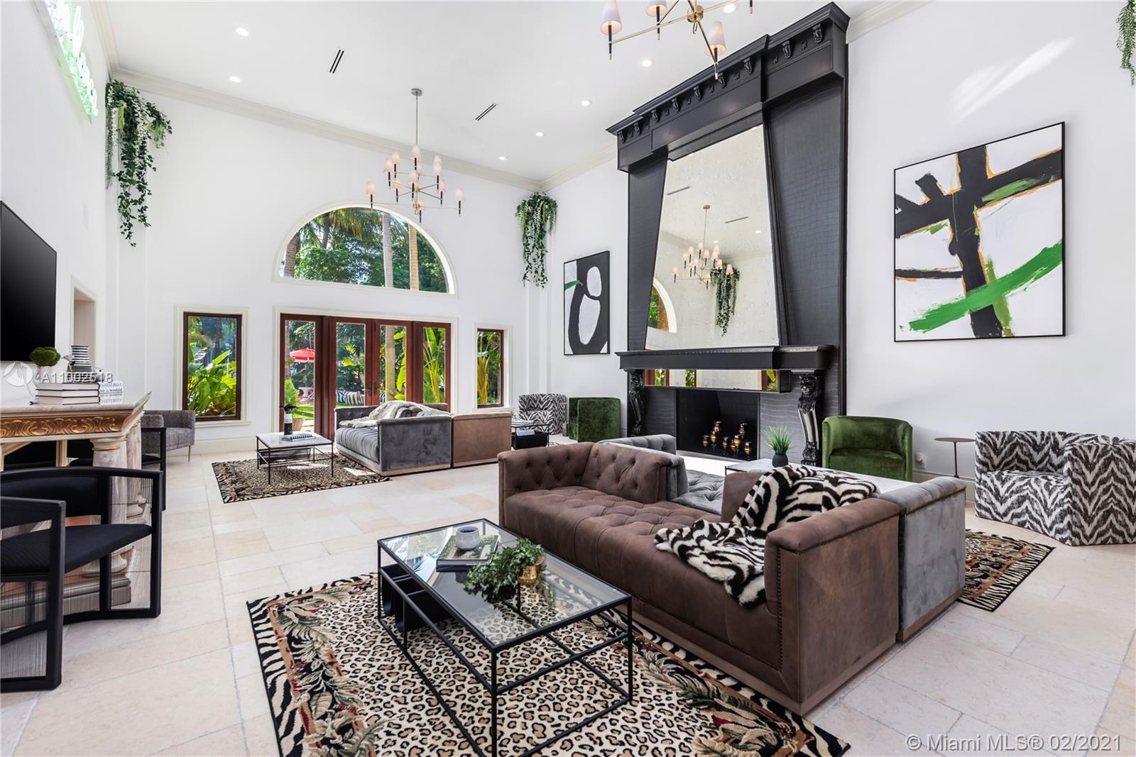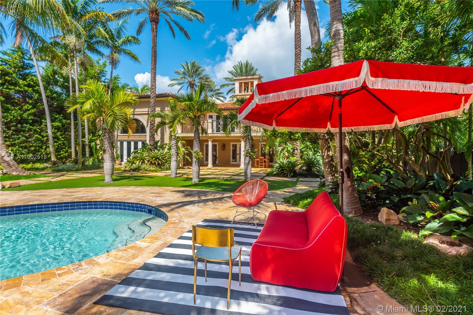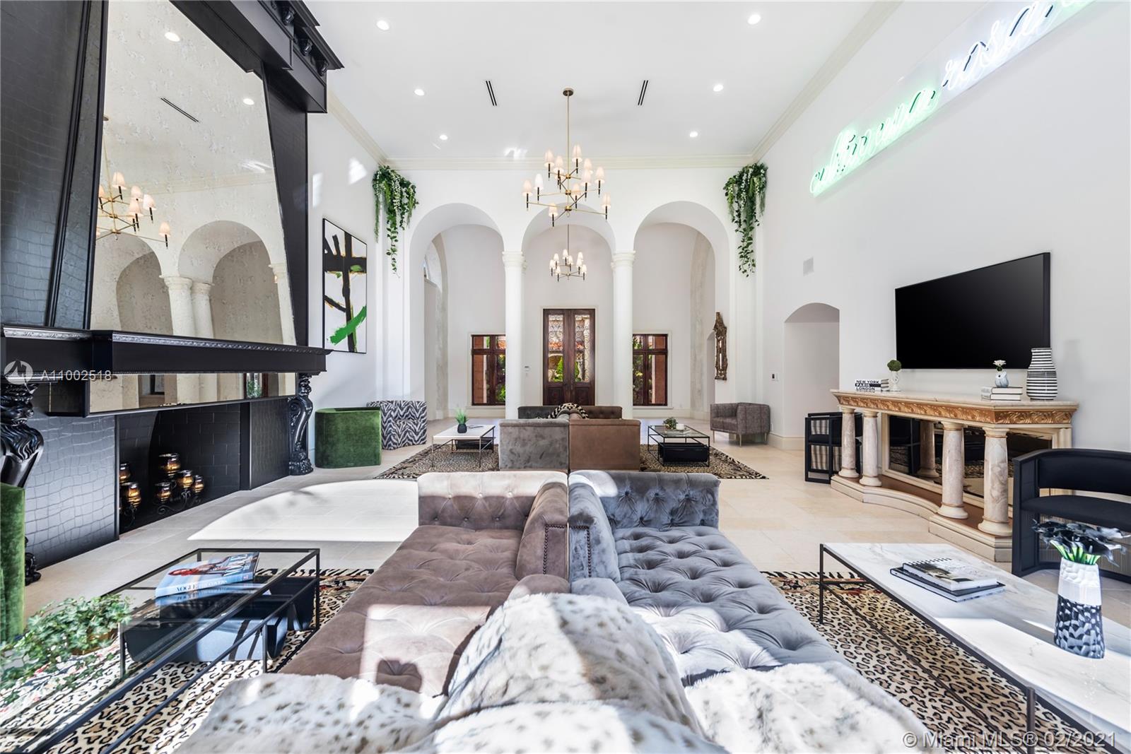 One of a kind estate on a 39,000 sq ft lot. Beautiful open courtyard. A recently renovated grand estate offering exquisite mahogany wood details, 25' fireplace, game room, 2 separate private guest houses, staff room, office, gourmet kitchen w/island, impressive large master suite, terraces, loggias, fountains, resort style pool, gazebo, summer kitchen, and outstanding grounds. 10 bedrooms, 10 bathrooms, 3 half baths. A total of 4 kitchens throughout the property. Excellent dockage for large 100ft+ yacht plus additional boat lift and jet ski lift. Equipped with natural gas generator to power the complete home. Luxury abounds throughout this extraordinary waterfront estate. Impressive views to the historical founainebleau hotel. No neighbors to your left side.