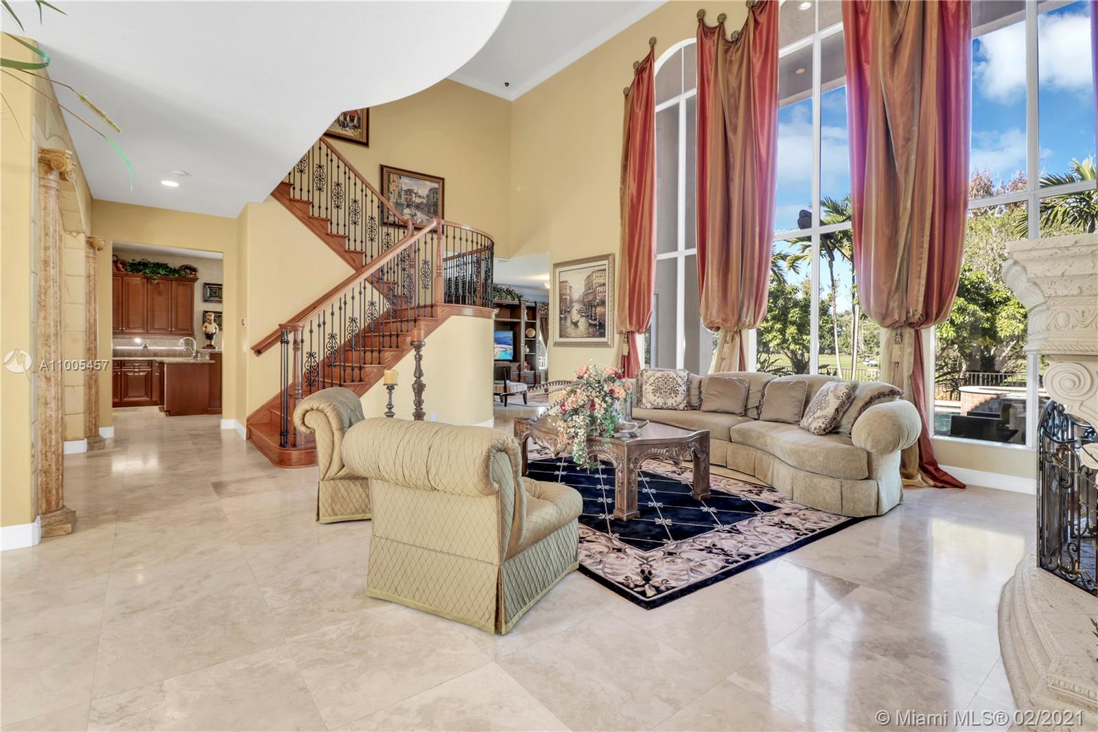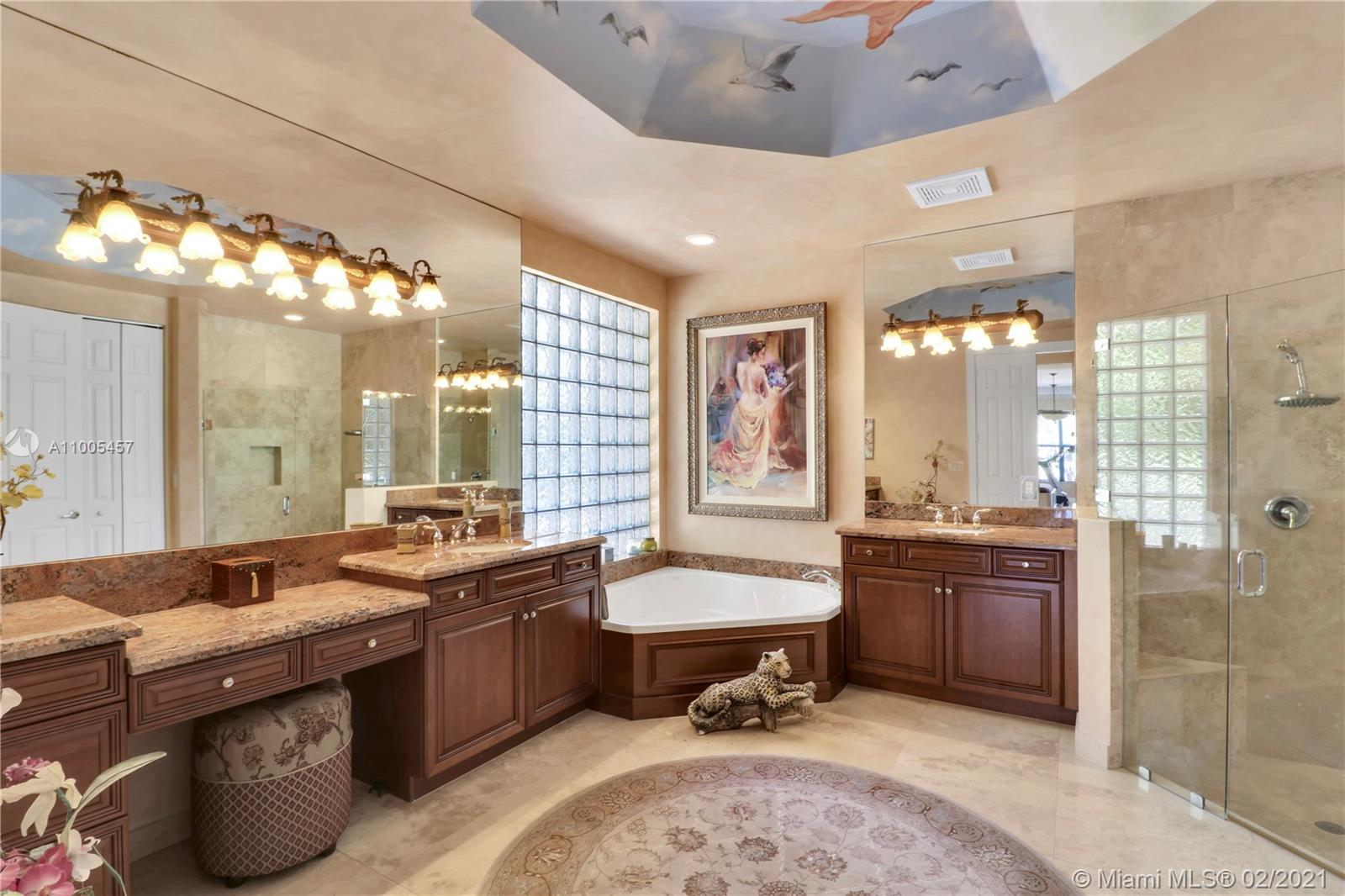 Luxurious 6 Bedroom(6th bedroom used as office)5 Bath with amazing golf-course view, spa/pool home in exclusive double-gated Enclave section of Grand Palms golf resort. Downstairs offers: master bedroom w/2 closets, spa-like master bath, office, dining room, kitchen, laundry room, walk-in pantry, custom bar, family room, & two 2 car garages w/ custom cabinets. Upstairs: Jack-and-Jill bath adjoined to 2 bedrooms, plus two bedrooms with en-suite baths, upstairs loft with custom bar. Marble & real wood floors throughout. Upgrades include: Subzero & Thermador appliances, glass-etched front double door, custom curtains/blinds, impact windows, custom fireplace & faux-painting, $5K venetian plastered guest bath, professionally decorated by Susan Rich. Sold FURNISHED. New paint exterior in 2020.