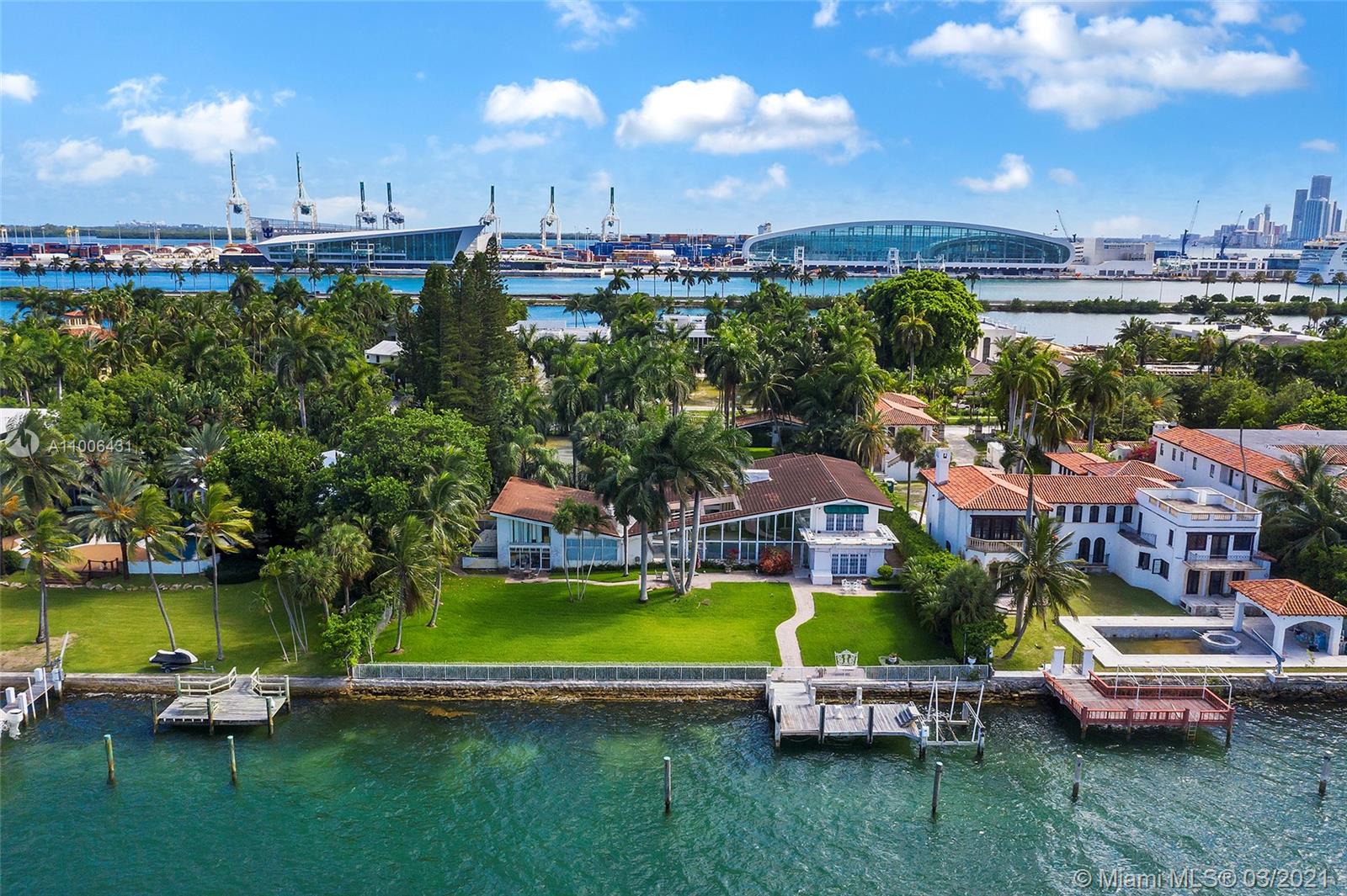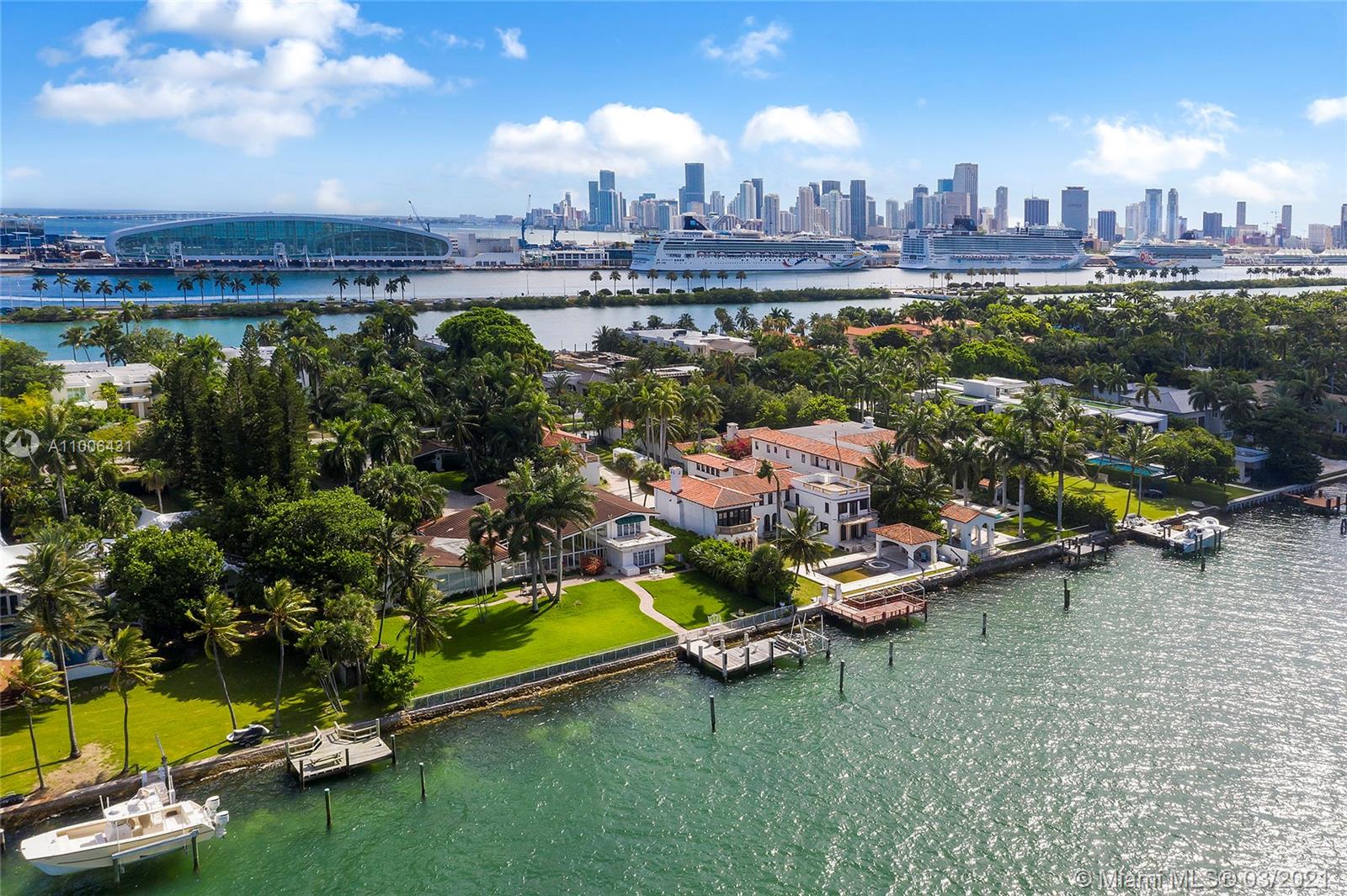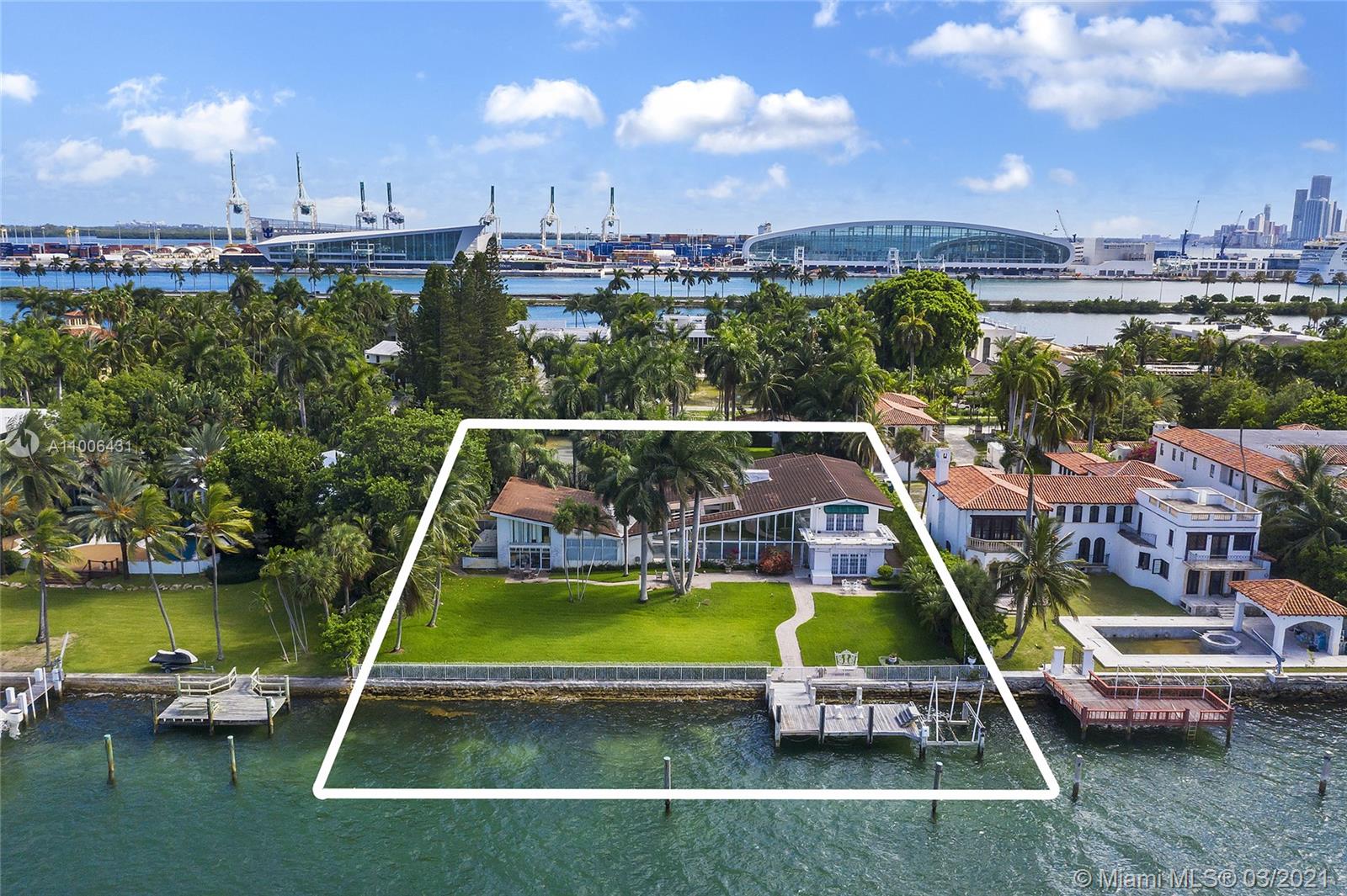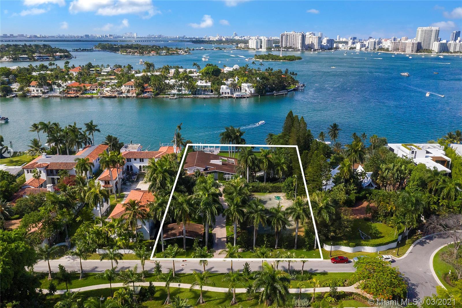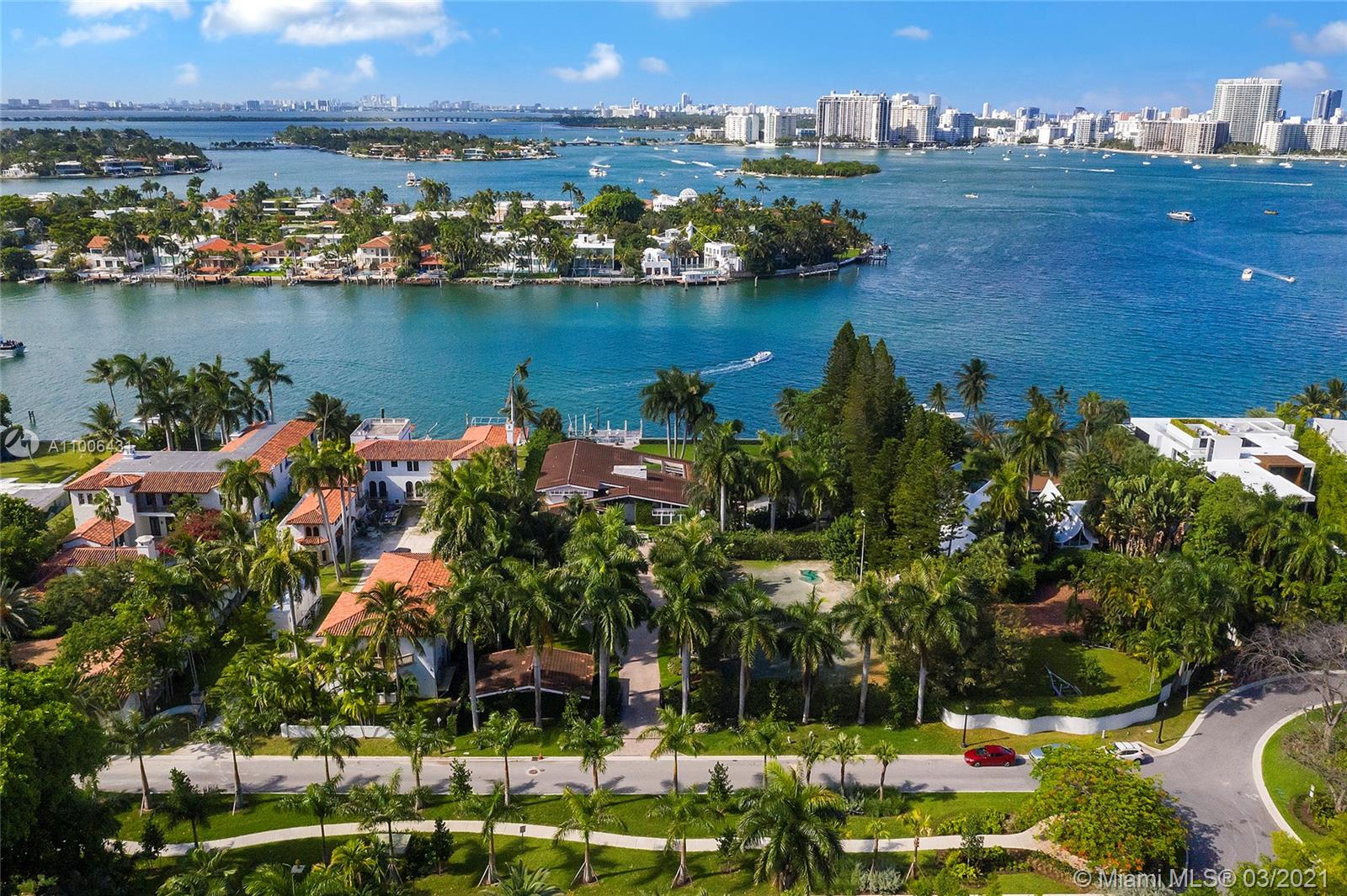 A rare opportunity on the Estate section of guard-gated Palm Island with 150’ linear wide Biscayne Bay waterfront. The unique 45,000 SF waterfront property ready to build up to 22,500 SF home, with plenty of privacy. Existing dockage capable of accommodating large vessels. A true gem waiting to be rediscovered, with hard to find lighted Tennis Court & separate Guest House. Views facing North towards Star Island & Miami Beach. Enjoy all of Palm Island's amenities including tennis & basketball courts, playground and 24 hour police security, centrally located with easy access to all of Greater Miami’s main attractions. Owner willing to Develop & deliver a finished new construction home for an asking price of $34M.