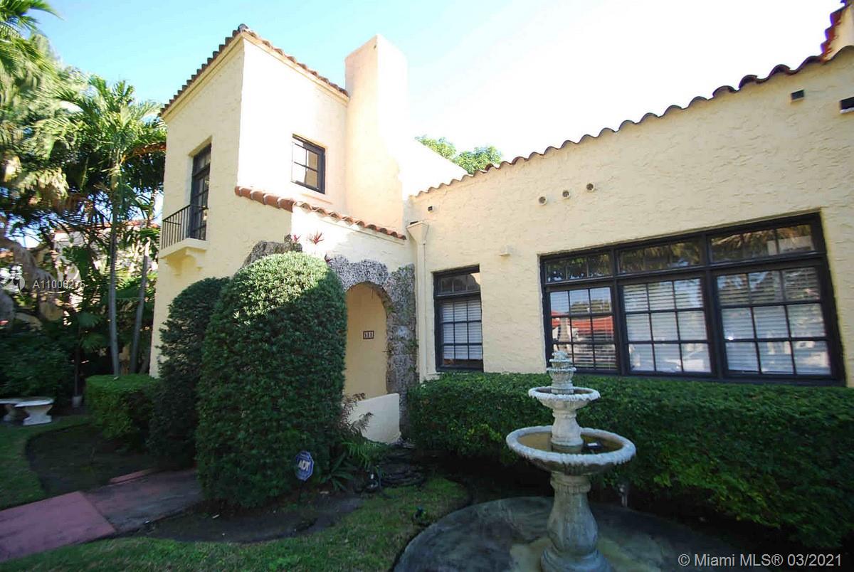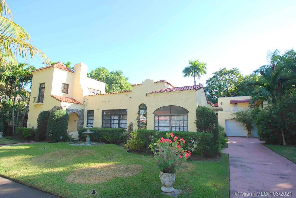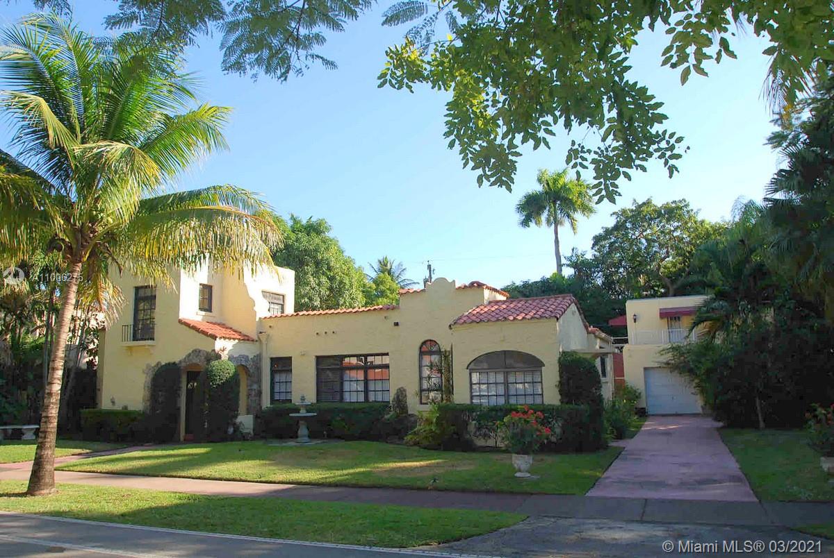 Charming Old Spanish home sits pretty on elegant and picturesque tree-lined Alhambra Circle. A coral rock covered entry leads to a foyer. Beyond is the living room, sunroom and a formal dining, spacious kitchen with eat-in area and bar or pantry. The main house has two bedrooms on the first floor, including the principal suite, and the third bedroom upstairs. Most of the home has pine wood floors. A separate, original structure has two living areas: a studio with a bath on the second floor, a two-bedroom, one bath unit on the first floor plus a full two-car garage with laundry. Romantic pool surrounded by mature trees and beautiful garden, fountains.