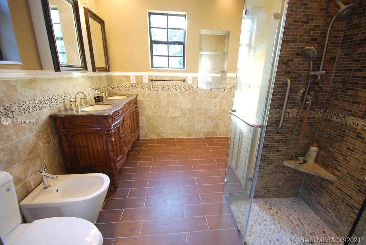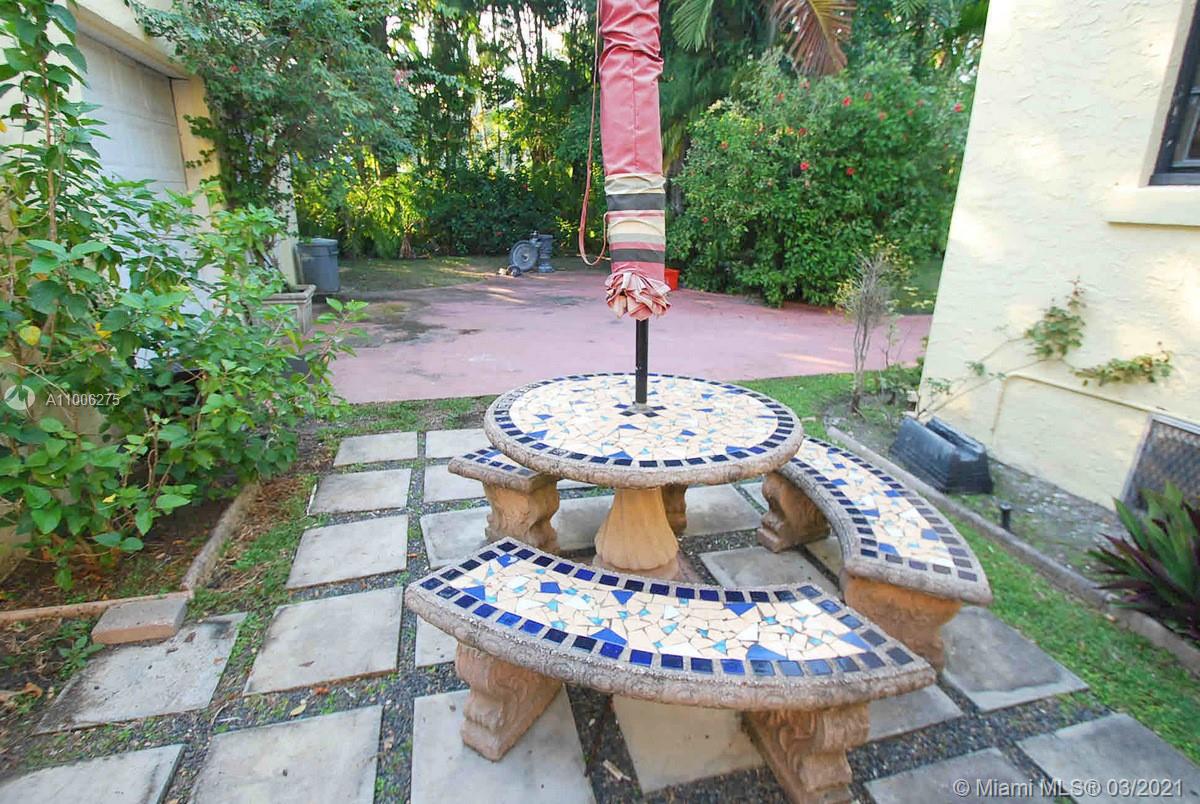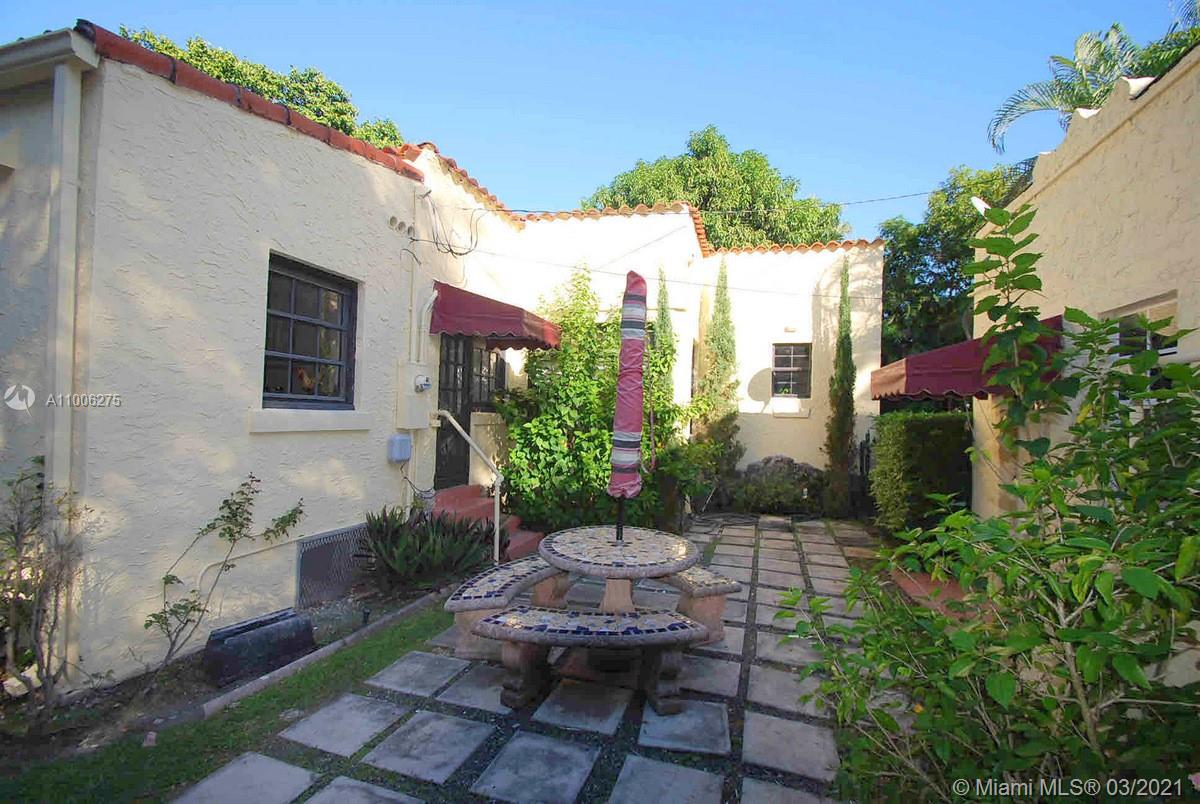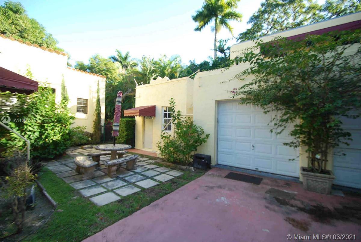 Charming Old Spanish home sits pretty on elegant and picturesque tree-lined Alhambra Circle. A coral rock covered entry leads to a foyer. Beyond is the living room, sunroom and a formal dining, spacious kitchen with eat-in area and bar or pantry. The main house has two bedrooms on the first floor, including the principal suite, and the third bedroom upstairs. Most of the home has pine wood floors. A separate, original structure has two living areas: a studio with a bath on the second floor, a two-bedroom, one bath unit on the first floor plus a full two-car garage with laundry. Romantic pool surrounded by mature trees and beautiful garden, fountains.