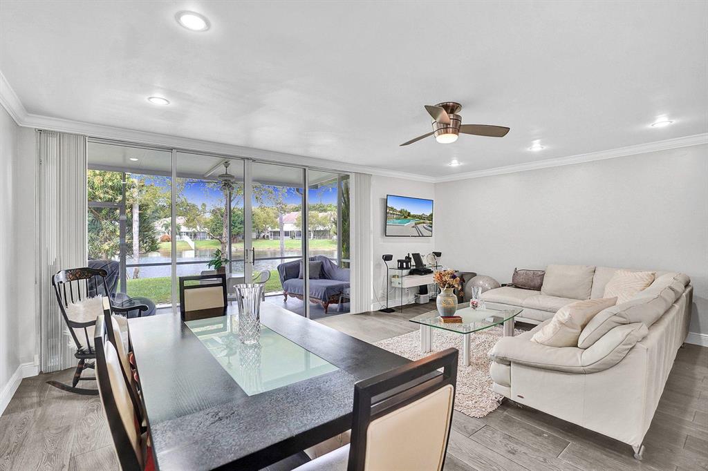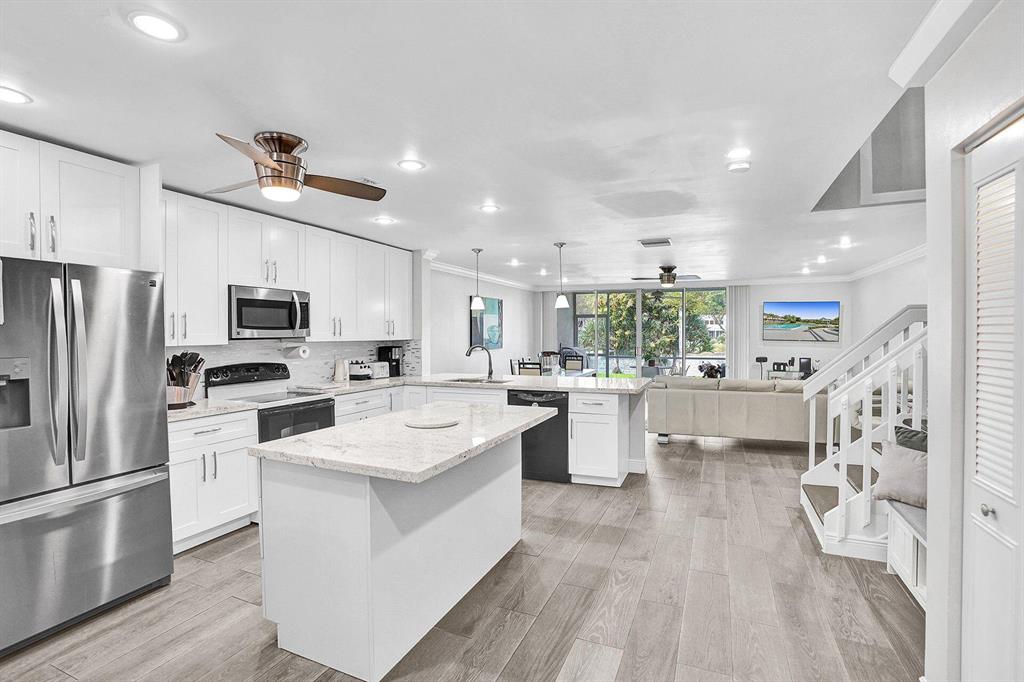 Stunning lakefront Townhouse in central Boca Raton. This renovated, open and bright lakefront Townhome in Boca Park has a half bath downstairs and 3/2 upstairs. Kitchen tastefully renovated with granite counters and granite Island. SS French Door refrigerator. Crown molding throughout and painted. All bathrooms renovated. Recess lighting - (no popcorn ceilings up or down), wood looking tile throughout downstairs. Upstairs flooring is wood looking plank vinyl (waterproof). Tile in upstairs laundry matches downstairs tile. Master has two walk-in closets. Newer Accordion Shutters throughout with exception of slider that has panels. Beautiful lake view from spacious covered screened patio. Located steps from tennis courts and short walk to community pool & cabana.