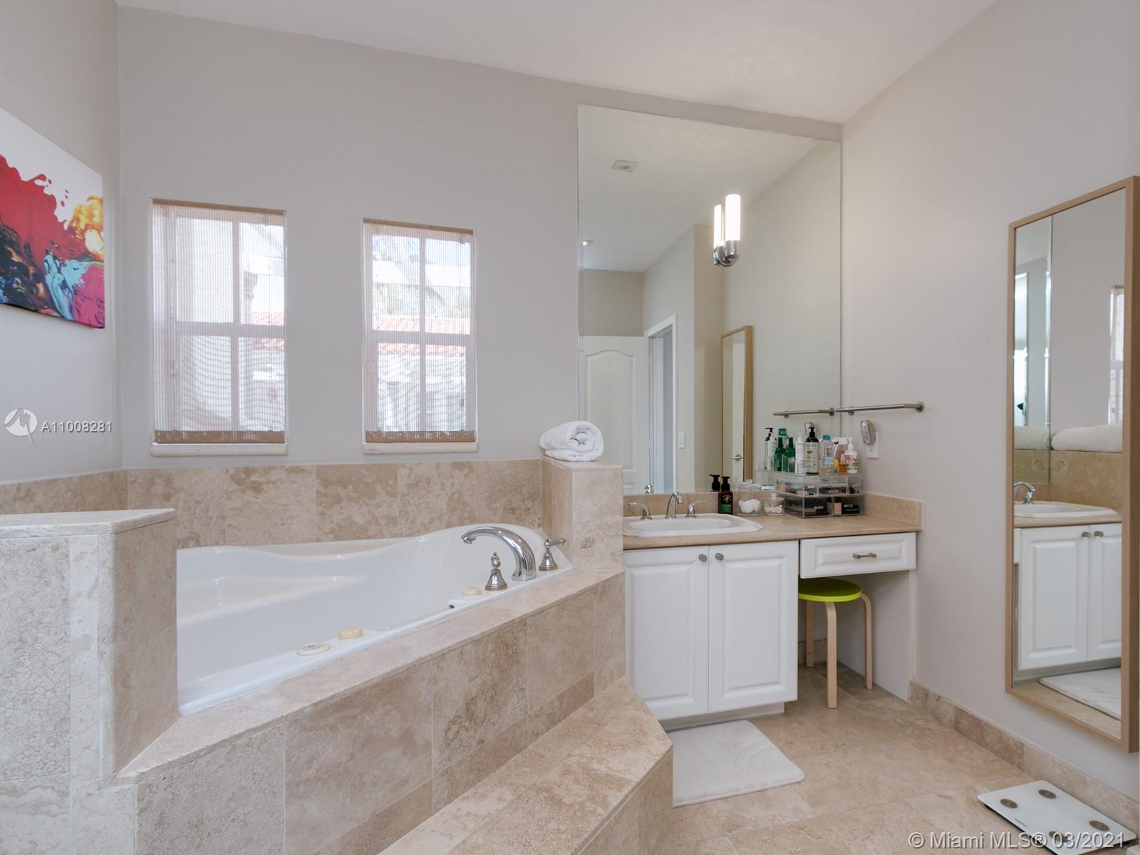 A small condo of only ~65 units gives it a private feeling with a Positano-style architecture. Marble floors all around with wood on each bedroom (all upstairs). The home was upgraded with design lighting, built-in curtains, stainless steel appliances, and accordion shutters. Very large master bedroom with double-height ceilings, a walk-in closet, and an additional built-in closet for him. Very pet-friendly and conveniently located for a family in front of Veterans Park.