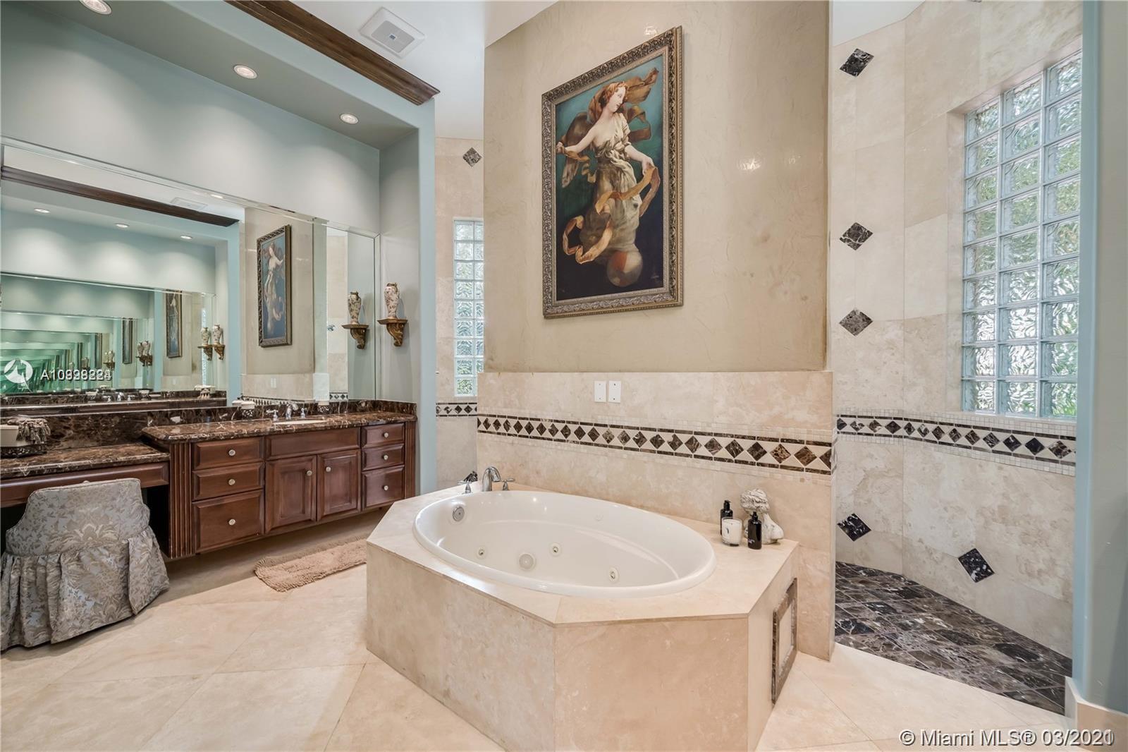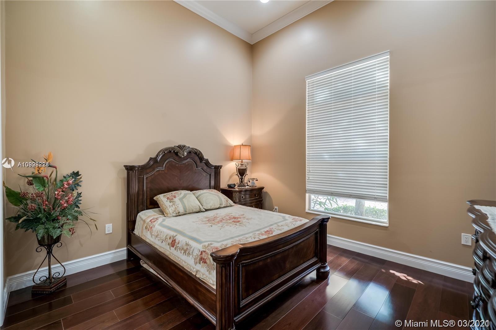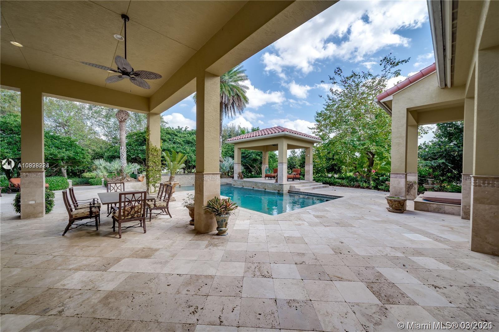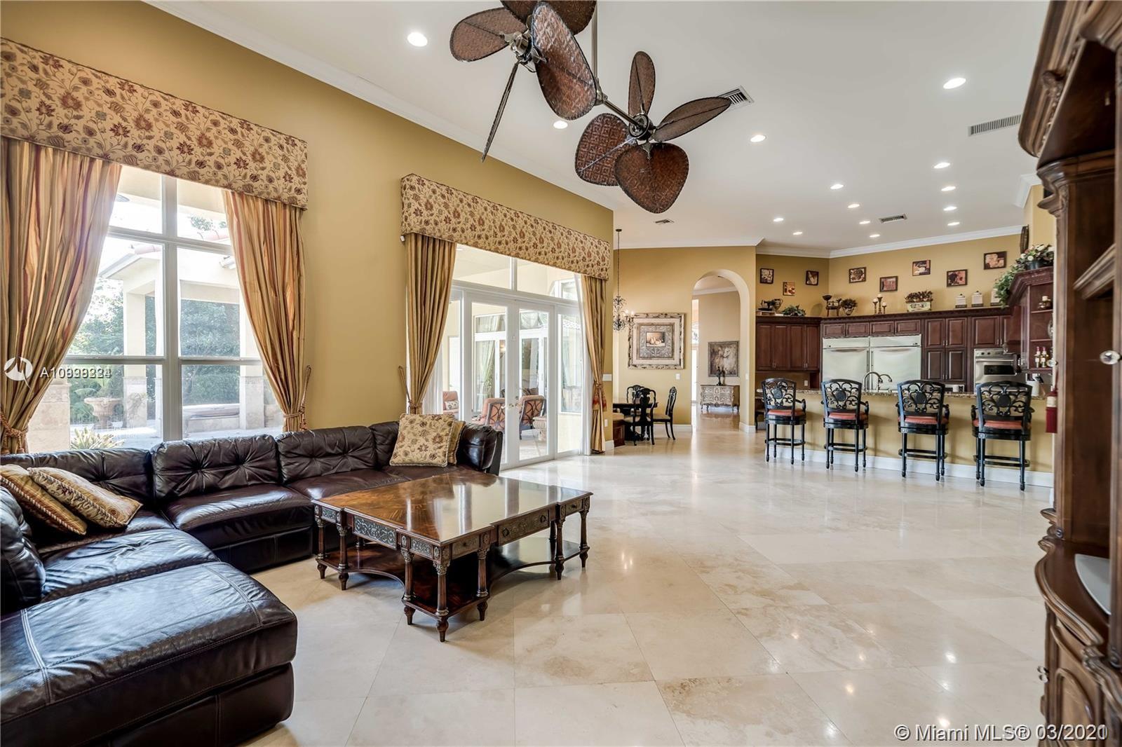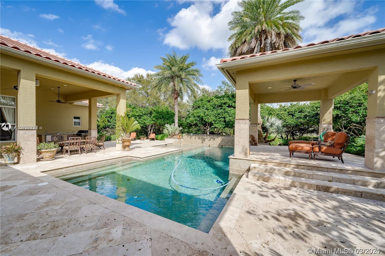 Enjoy class and elegance in this custom built triple split 6/5.5 + an office in the exclusive gated community of Paradise Pines. Soaring Ceilings and exquisite marble floors in all living areas, and wood in all bedrooms. Expansive master suite w/sitting area, two walk-in closets, and grand master bath w/roman spa shower. Gourmet kitchen featuring Viking gas stove, double over overlooking the sprawling family room. Tuscan pool w/cascading waterfalls, marble gazebo, summer kitchen, and spa. Impact windows, Porte-Cochere, and the list goes on.