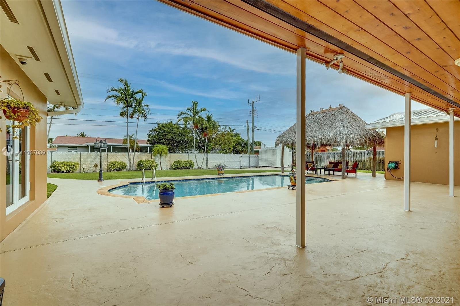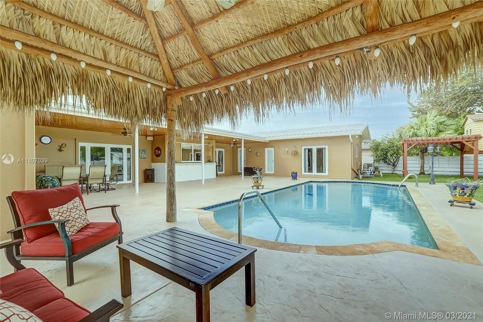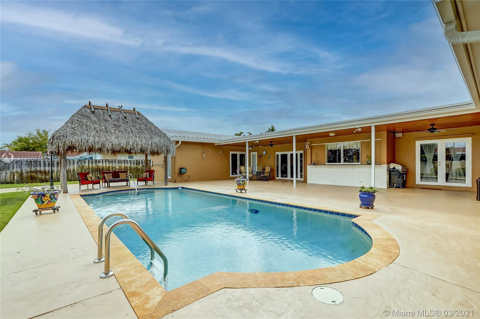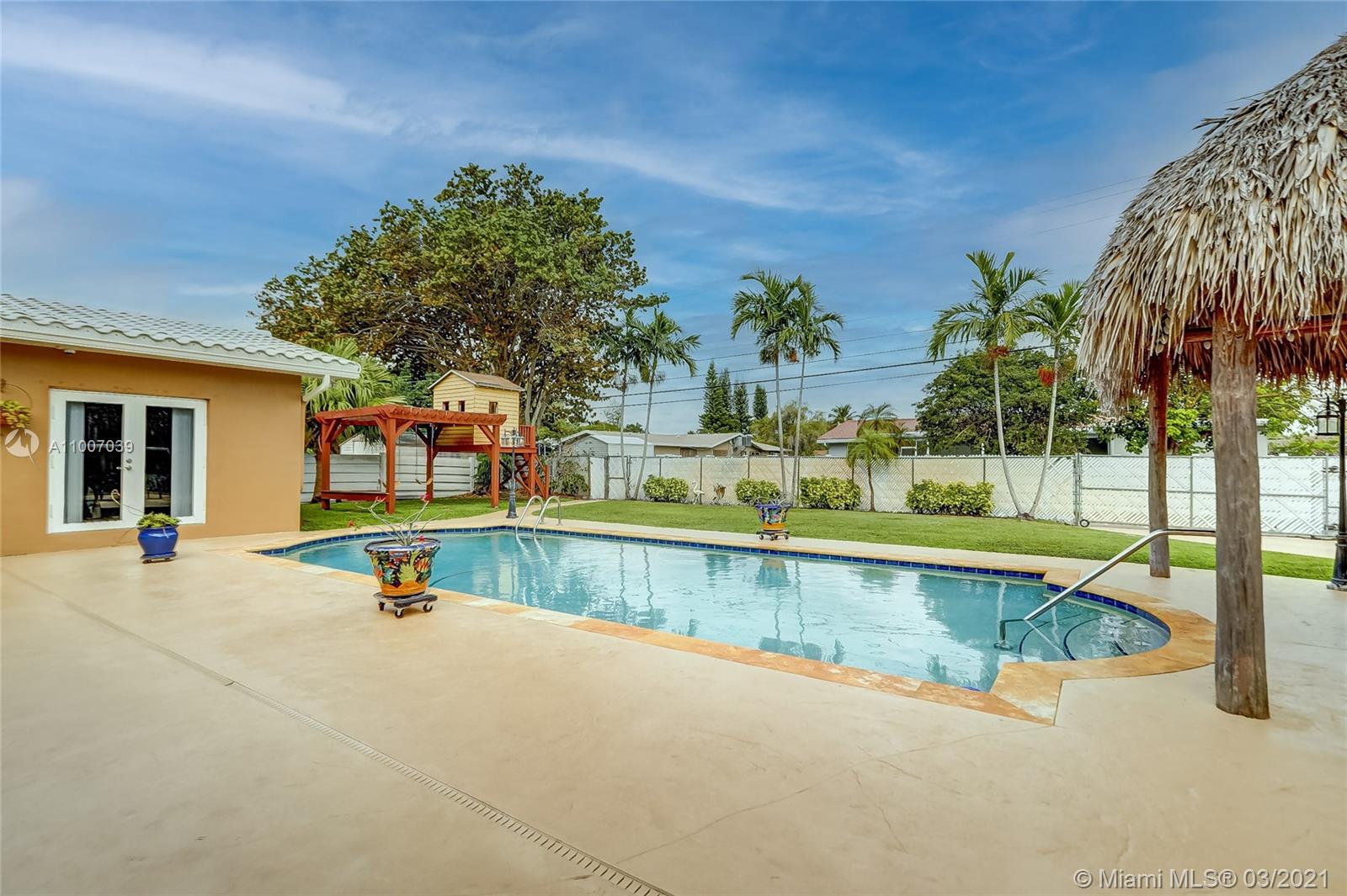 *Double Lot, Great for Entertaining w/ yard, pool, tiki hut* Spacious single-story home w/ split floorplan & 2 master suites. NEW Porcelain tile (2020), Kitchen remodeled in 2004 with granite countertops, saltwater pool redone in 2015. 5th bedroom used as office. 1 master perfect for in-law quarter with a sitting area and separate entrance from the backyard. Both Master baths redone. New hot-water tank (2020) Roof (2002), PVC & Copper Plumbing, NO HOA. Some impact Windows + Accordion Shutter + Panels. Great central location near I95, Turnpike. Inspection Done.