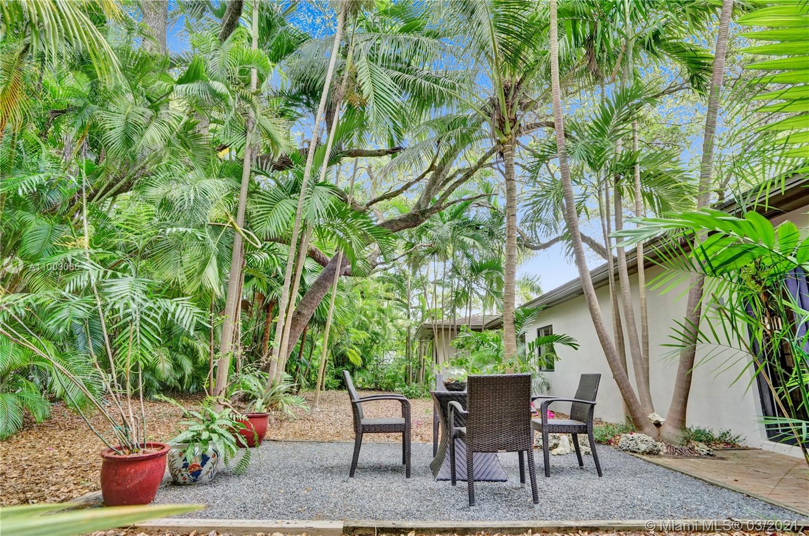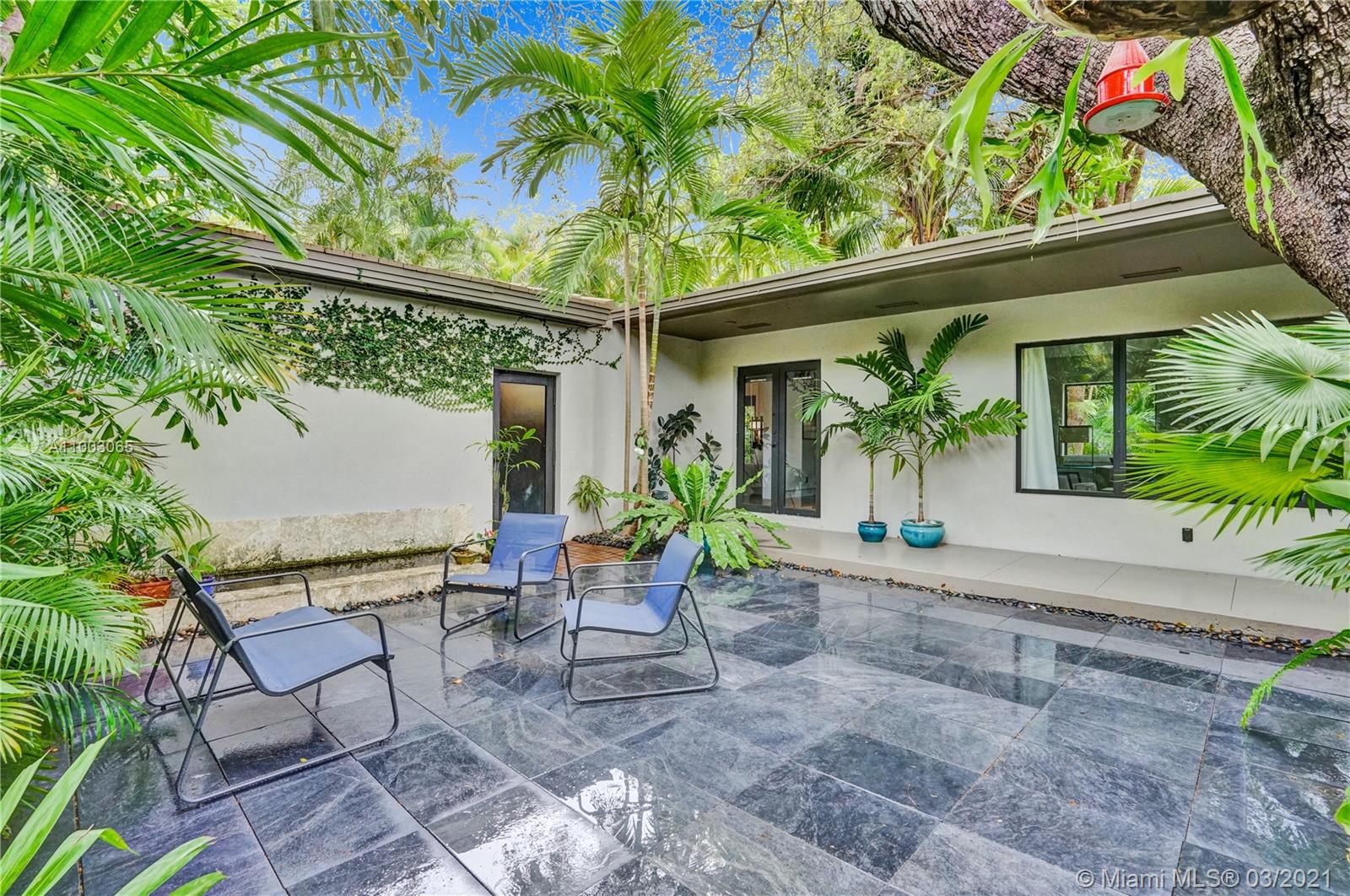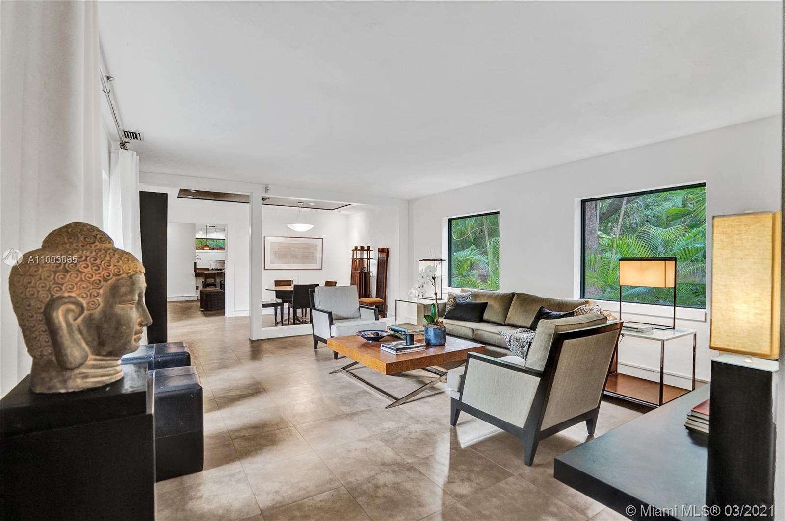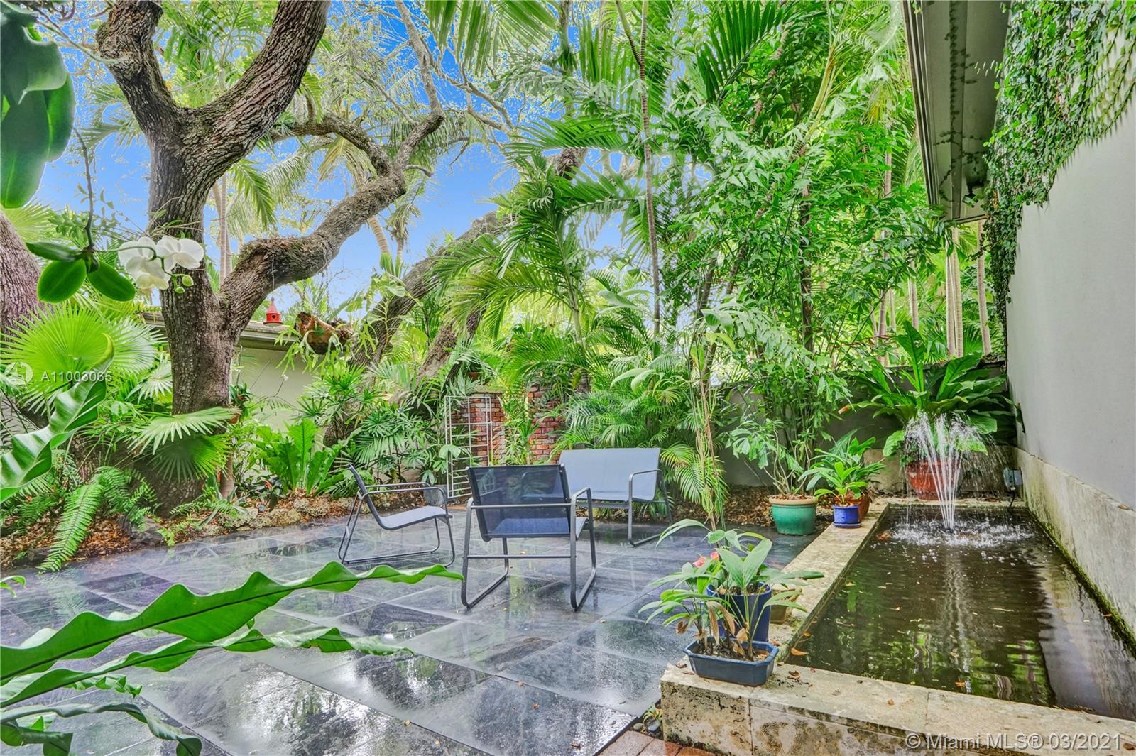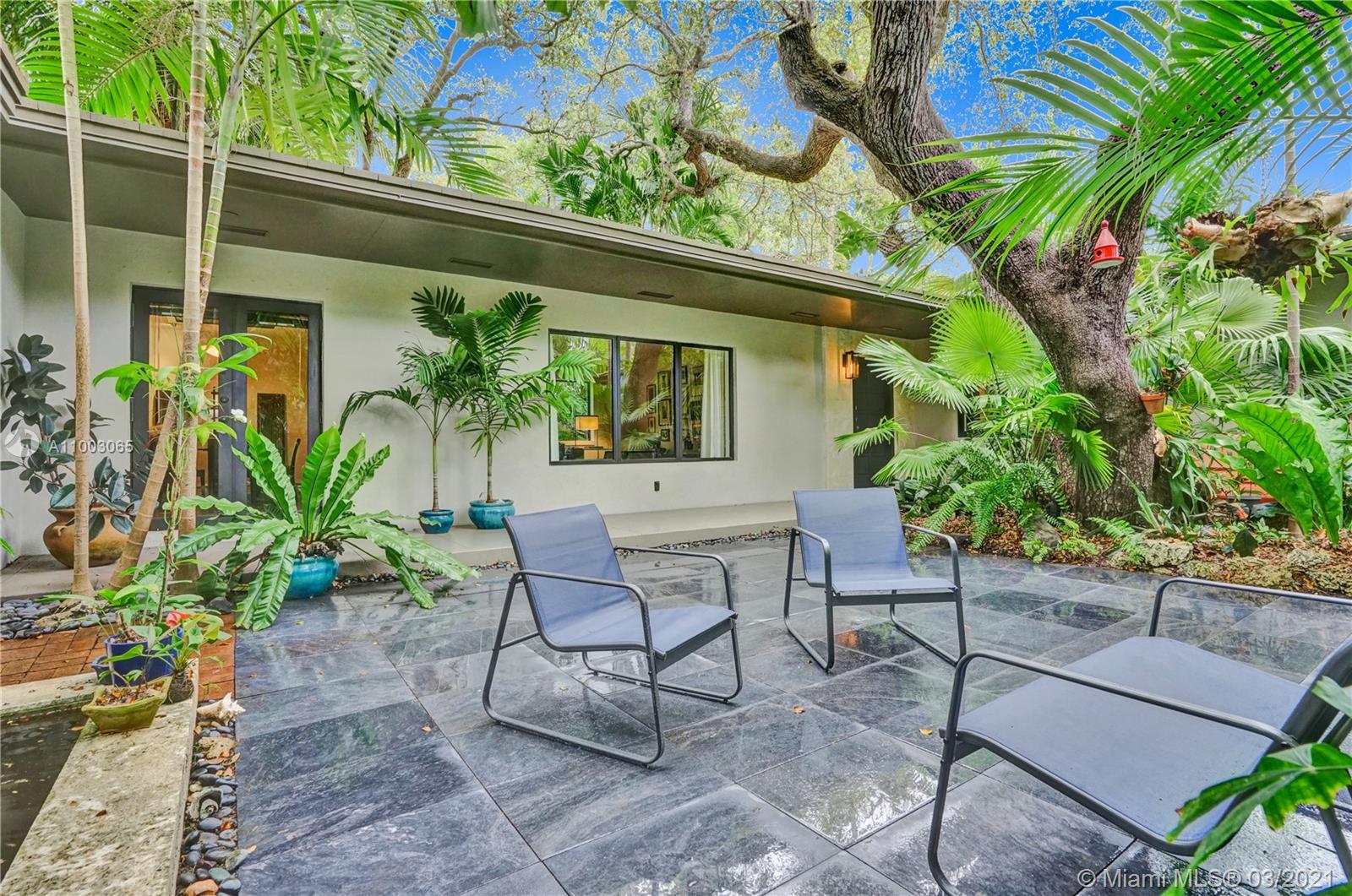 Coral Gables spectacular! 4/3 bed+office/2 baths renovated and expanded with style by architect owner. Entrance courtyard with koi pond, perfect for outdoor dining or yoga under a canopy of mature oak trees and palms. Formal living/dining rooms, equipped kitchen with s/s appliances, open concept island + family room and two-car garage. Sleek designer finishes in neutral and earth hues, porcelain tile/terrazzo floors. Escape to a wooded backyard, an oasis of nature to relax/entertain, with space for expansion or pool. Located in exclusive family friendly neighborhood of Sunrise Harbor, the home is built on coastal ridge high ground, no flood insurance required. You’ll love two parks or bicycling along the Commodore Trail. A+ schools. Your own gated compound, you'll never want to leave!
