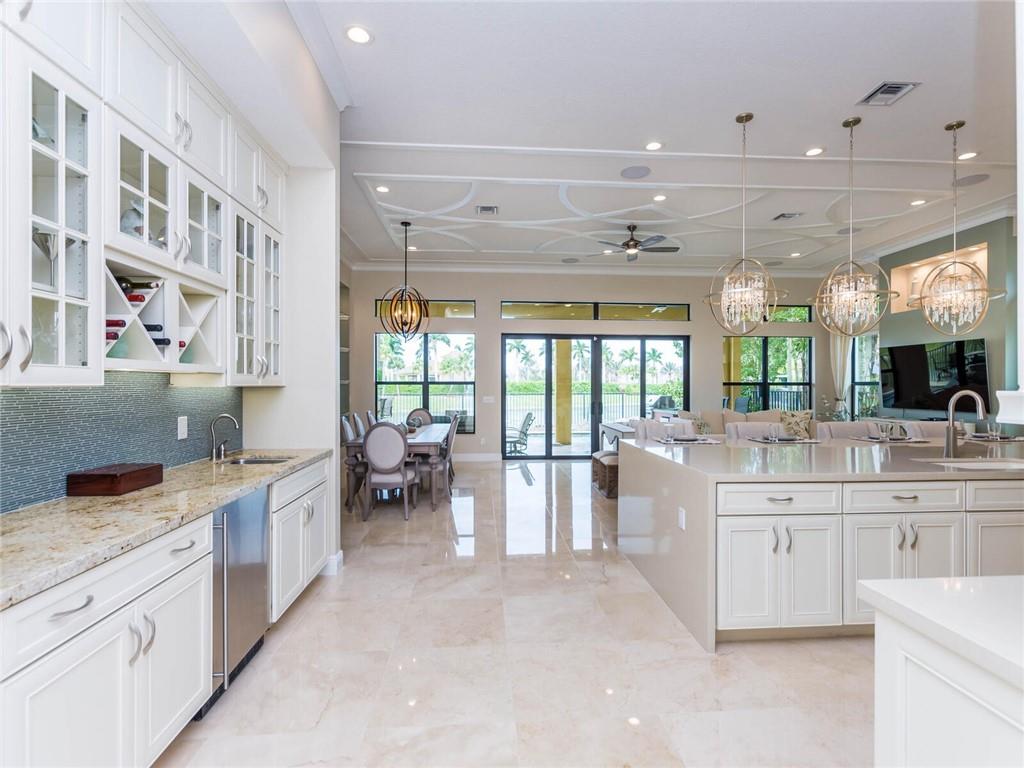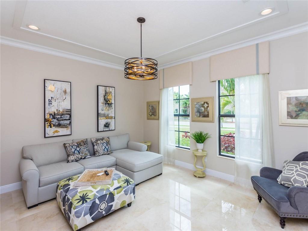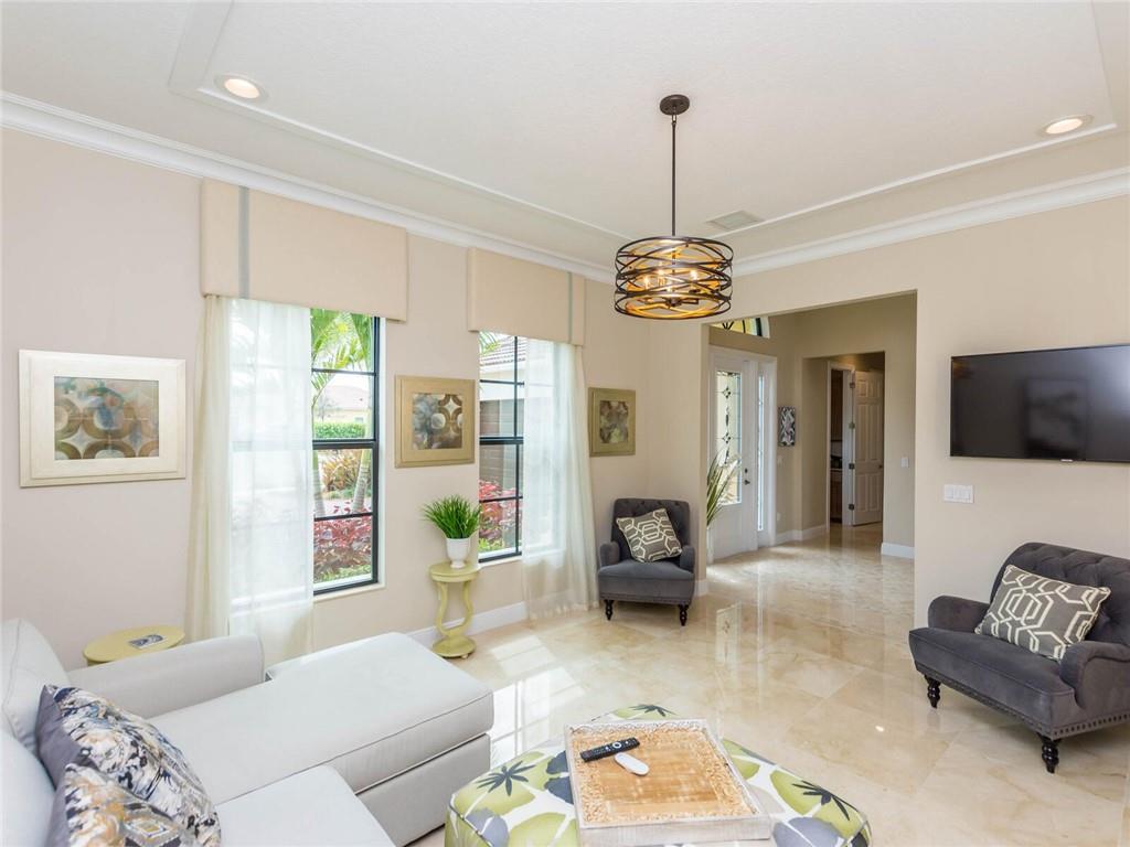Resort style living @ the Four Seasons Luxury 55+ community-This amazing designer former model home 2BR/2BA + Den /2.5 car garage with spectacular lake view, features over $280K designer upgrades and structural options and is being offered fully furnished. Custom upgrades : Gourmet kitchen w/ oversized center island, wet bar, quartz counters , custom cabinets; marble floors in living areas & baths, custom tray ceilings, crown molding, smart technology, impact windows & doors, plus much more see attached owner upgrades. Spacious master bedroom suite with sitting area and oversized bath. Extended patio with lounging pool, travertine pavers, outdoor kitchen & bar(patio area in process of being screened in). Four Seasons has many amenities such as a fitness center, pool, tennis and much more.
