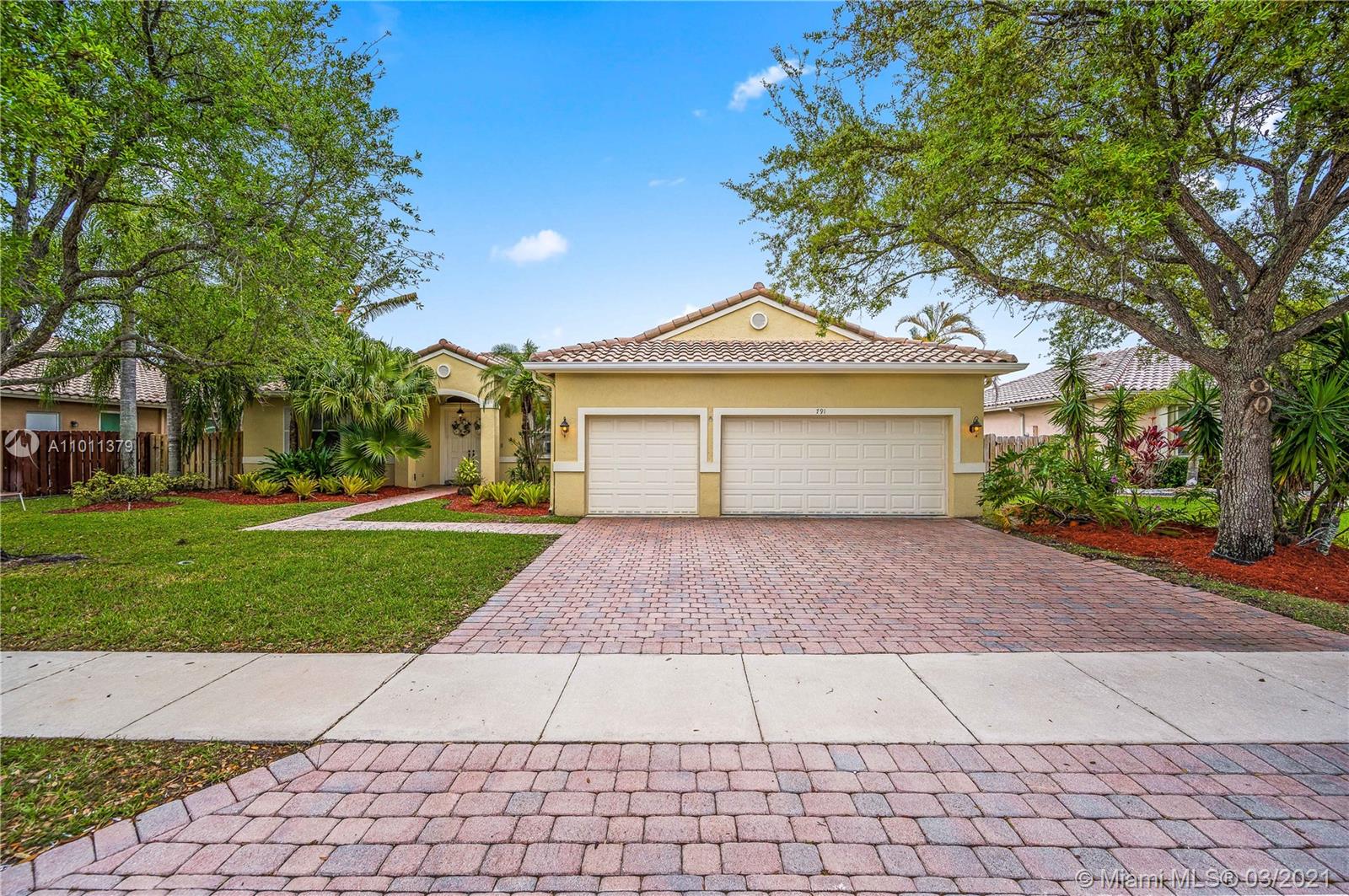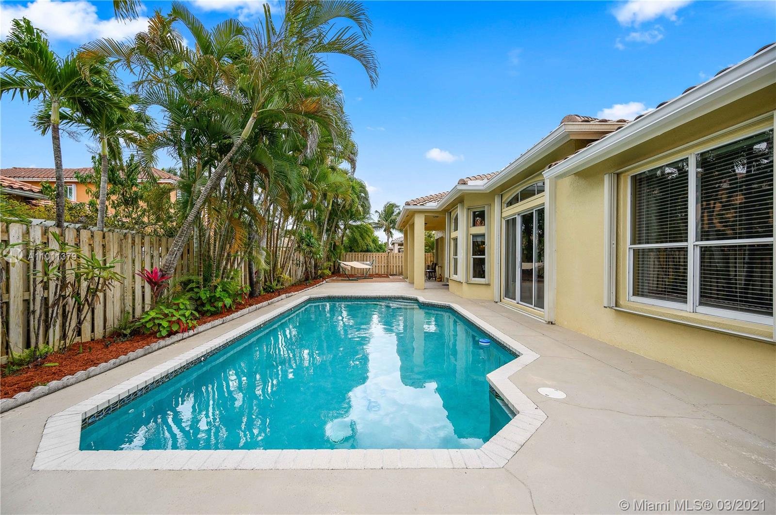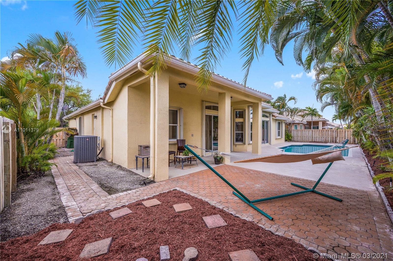ENCANTADA's finest! This exquisite Mediterranean style one-story home that features 4 bedrooms, 3 baths, and 3 car garage. Relax in your Lush tropically landscaped yard with a 15' x 30' pool and covered patio. This home includes accordion-style hurricane shutters, barrel concrete tile roof, tall ceilings, stainless steel appliances; the open kitchen features white cabinets and white Corian countertops. Enjoy your meals overlooking the pool in your cozy breakfast nook that opens to the family room. The master bedroom has 2 large walk-in closets, the home has tile throughout, and the bedrooms have laminate wood flooring—laundry room w/ sink. Enjoy Tennis, Gym, resort-style pool, kid play areas, and community room. AC 2018, Roof 2000. Lot is 85' X 110'. HOA $138 a month paid quarterly.