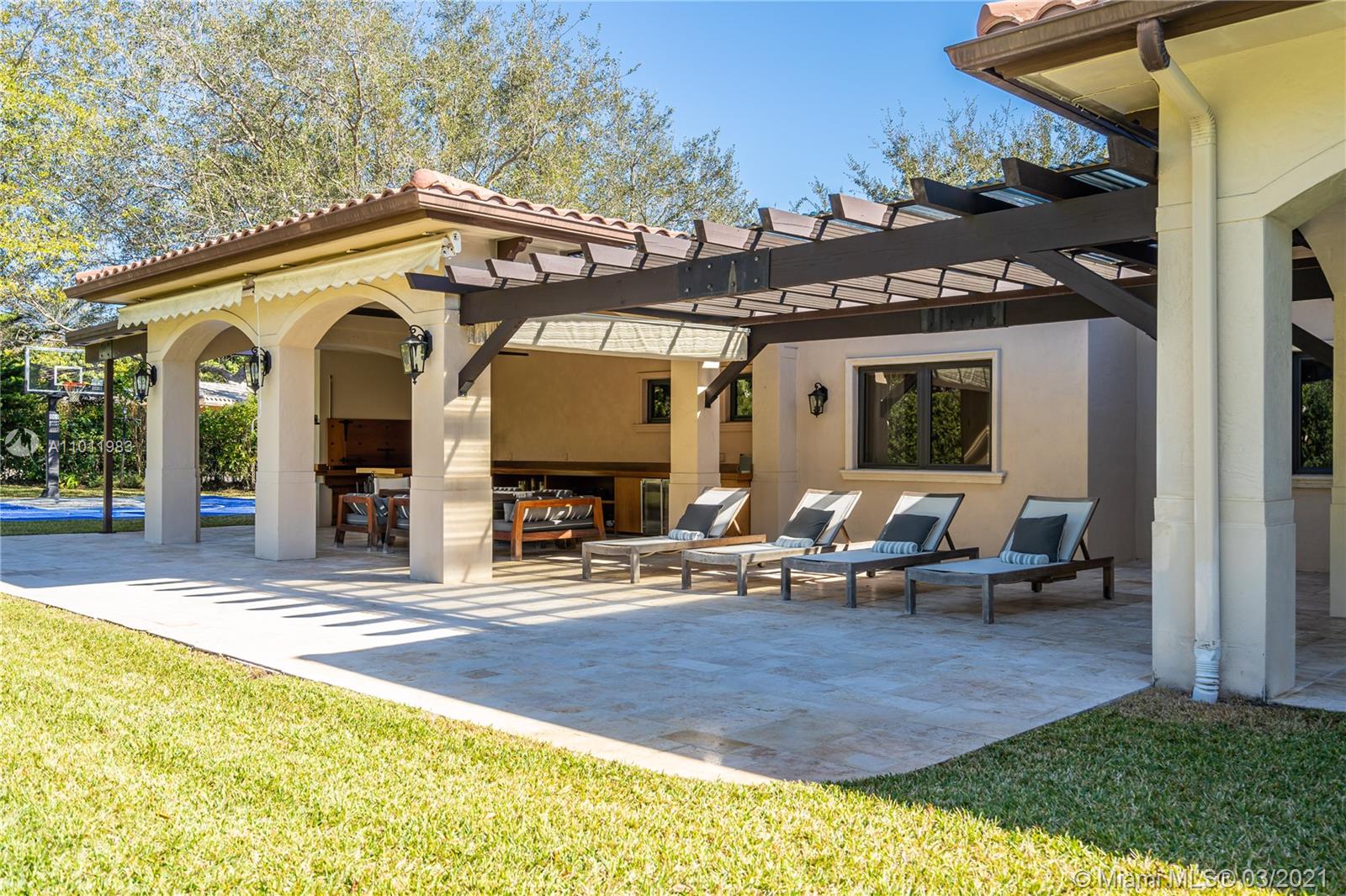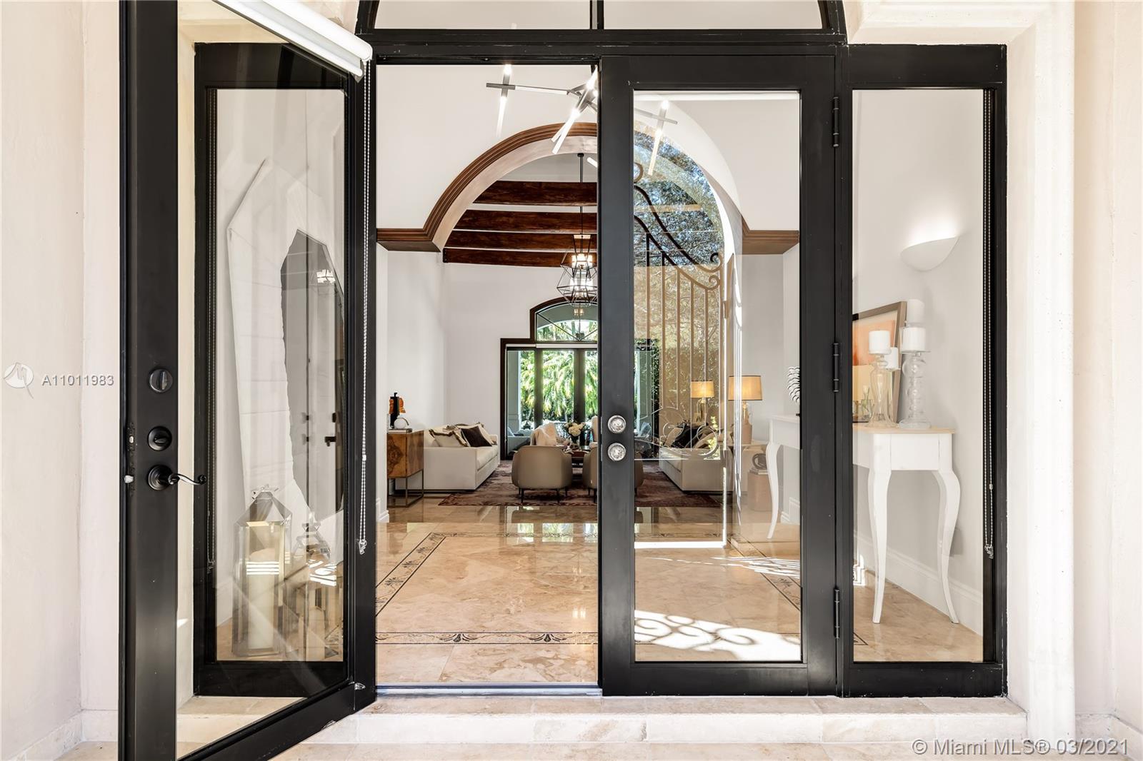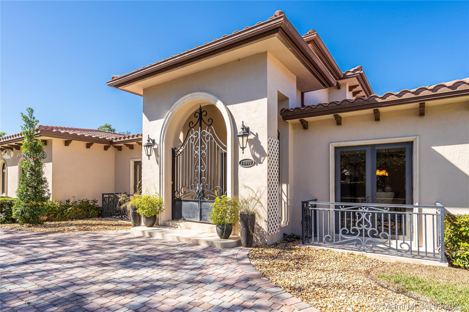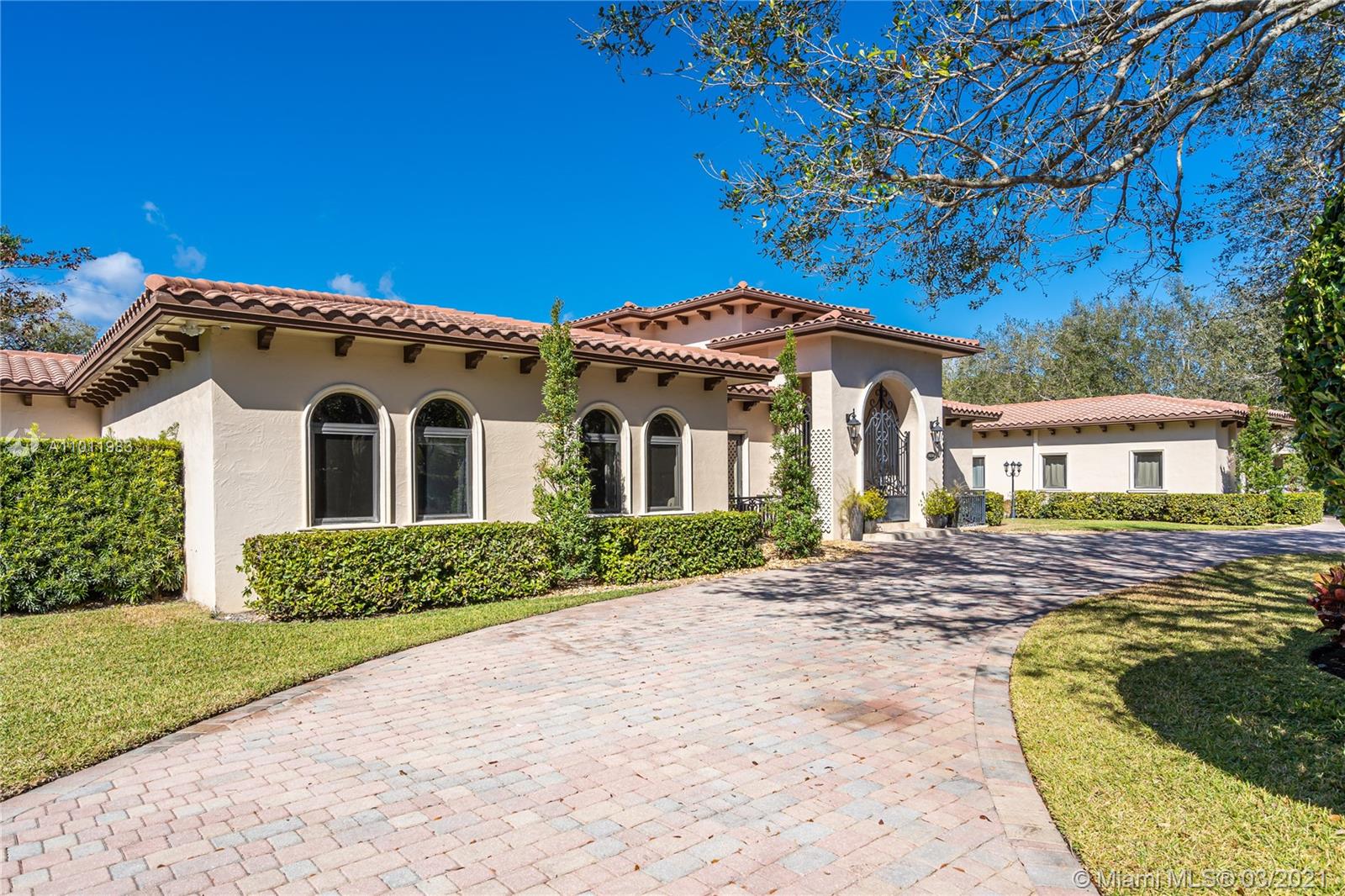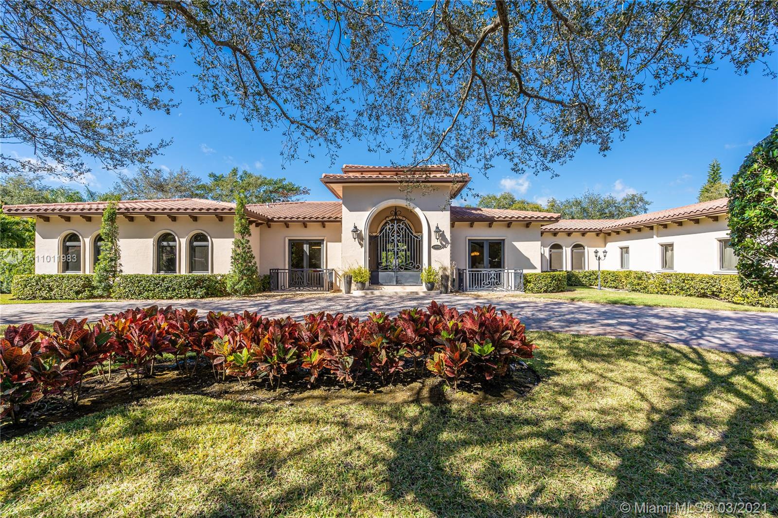 Stunning gated Mediterranean Estate tucked away on a pretty and serene street in the heart of Pinecrest. Imposing entry with cathedral ceiling, marble floors throughout, high impact windows & doors. Formal living and dining rooms, gourmet kitchen opens to Family room overlooking back patio. 6Bd, 6Bath plus additional office. Lavish Master bedroom and bath offers his and hers walk-in closets, whirlpool bathtub and sauna. 750 bottle A/C wine cellar room. Expansive terrace with one-of-a-kind Argentinian BBQ. Pool, Spa and Basketball Court. Security cameras and air-conditioned 3 car Garage. Few blocks away from Pinecrest Gardens and top public & private schools.