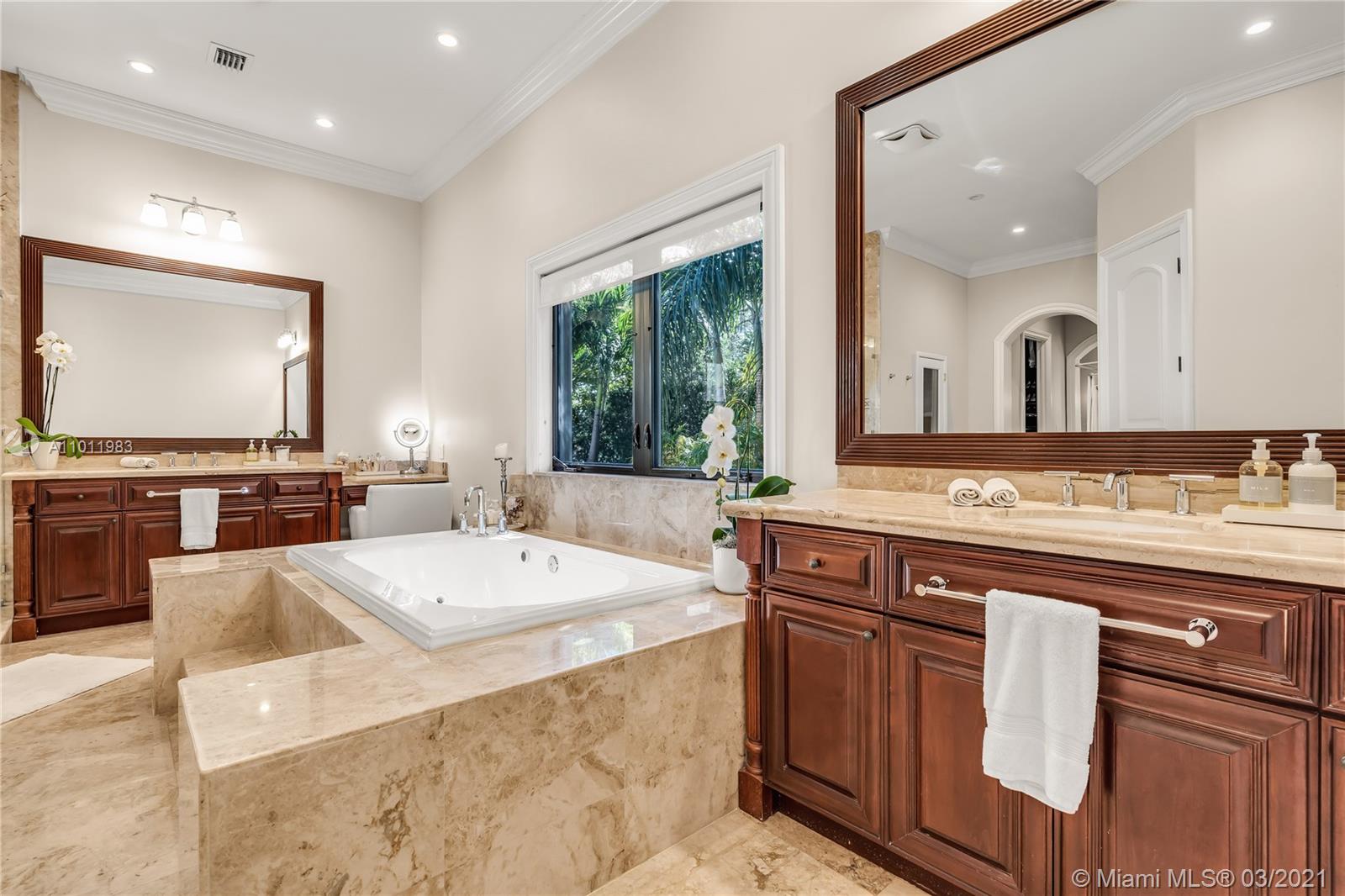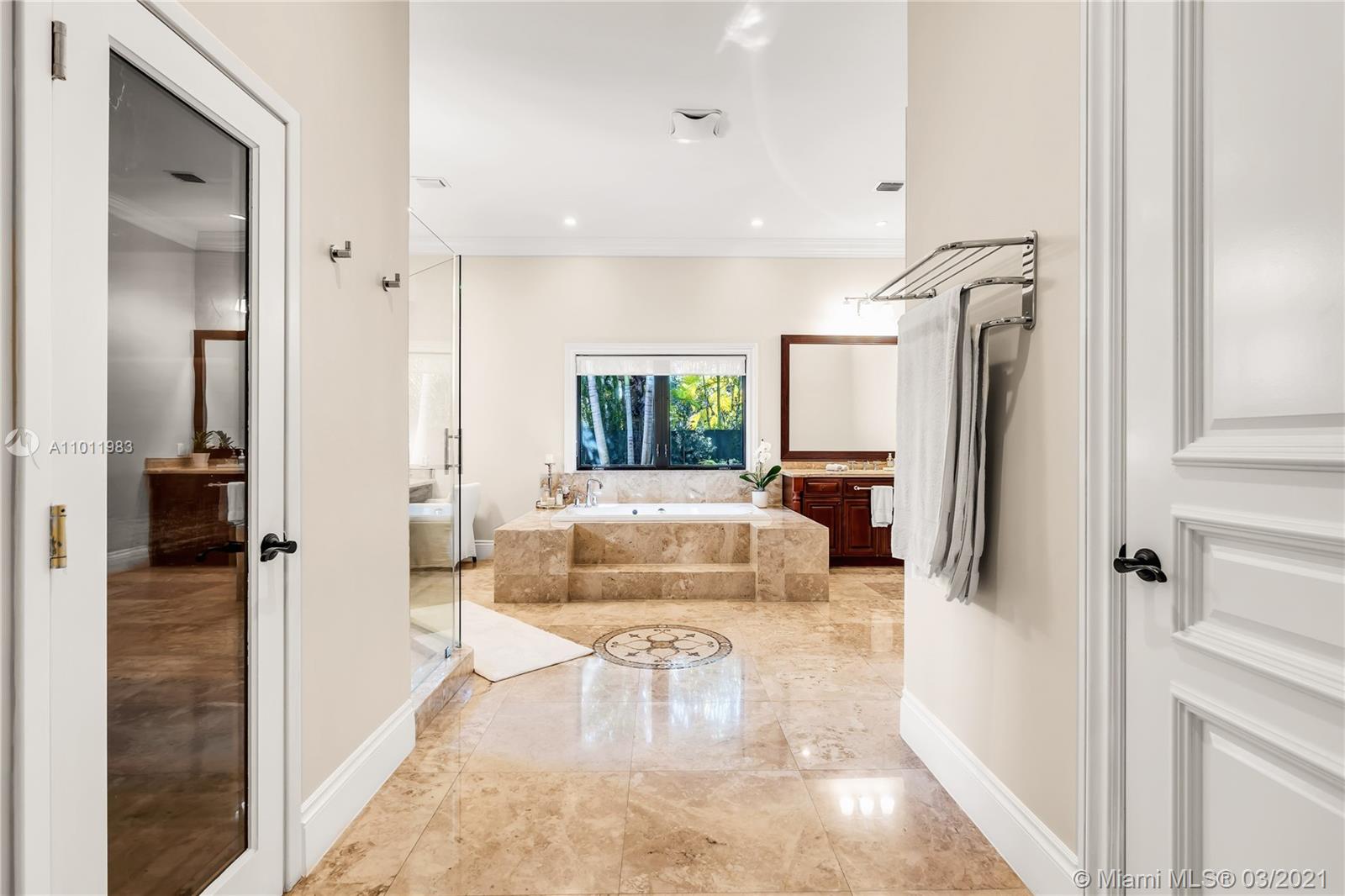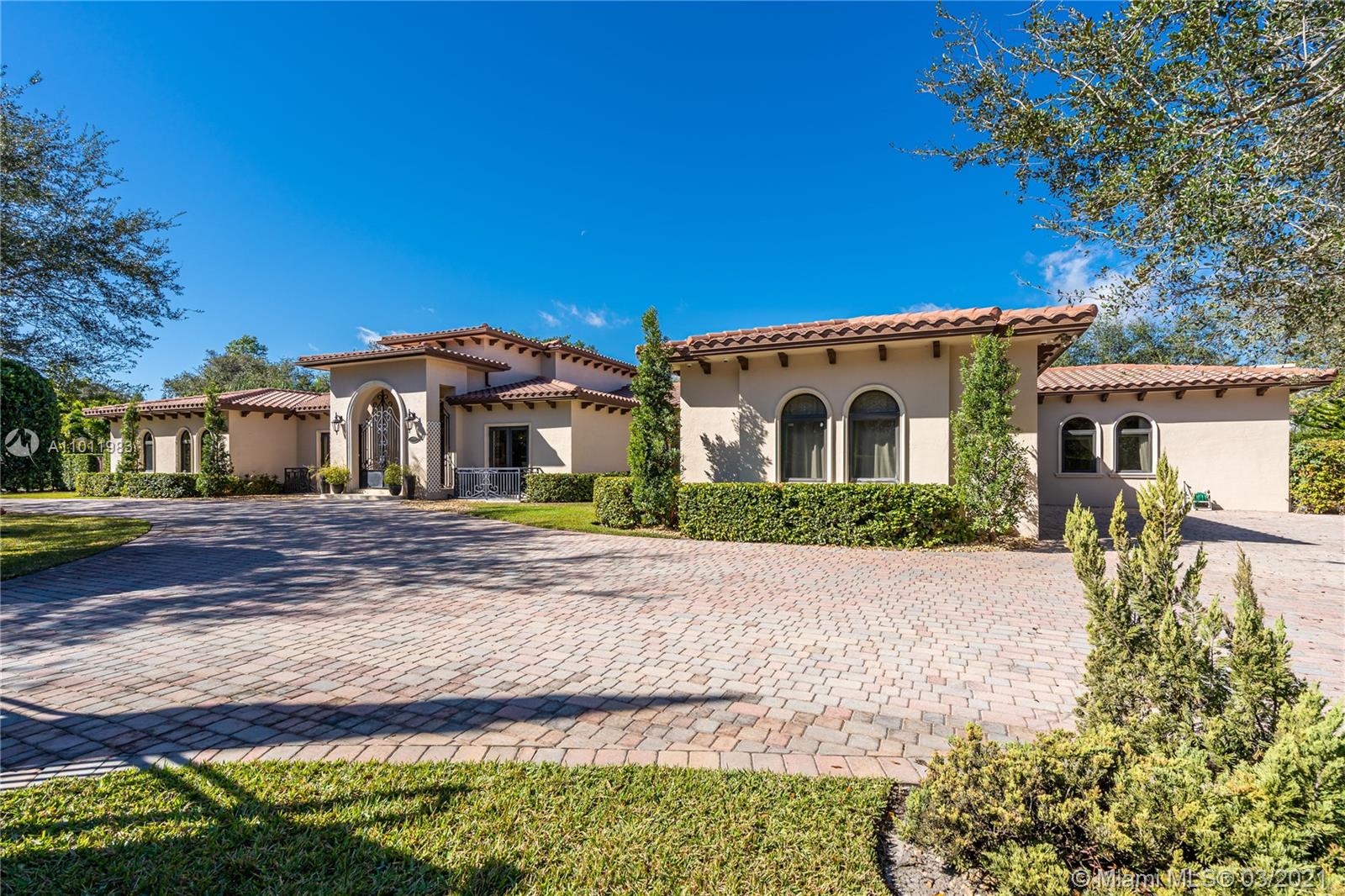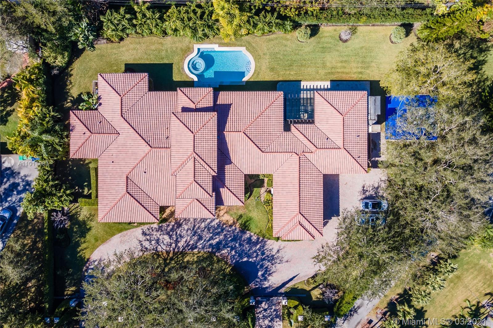 Stunning gated Mediterranean Estate tucked away on a pretty and serene street in the heart of Pinecrest. Imposing entry with cathedral ceiling, marble floors throughout, high impact windows & doors. Formal living and dining rooms, gourmet kitchen opens to Family room overlooking back patio. 6Bd, 6Bath plus additional office. Lavish Master bedroom and bath offers his and hers walk-in closets, whirlpool bathtub and sauna. 750 bottle A/C wine cellar room. Expansive terrace with one-of-a-kind Argentinian BBQ. Pool, Spa and Basketball Court. Security cameras and air-conditioned 3 car Garage. Few blocks away from Pinecrest Gardens and top public & private schools.