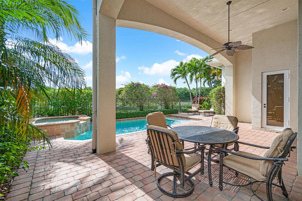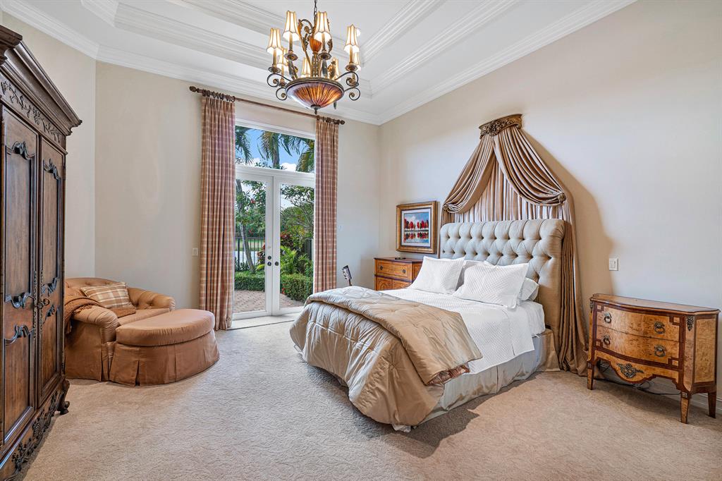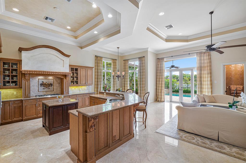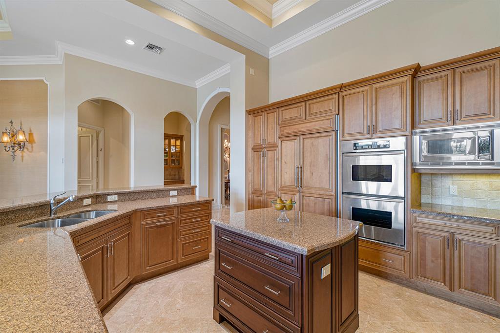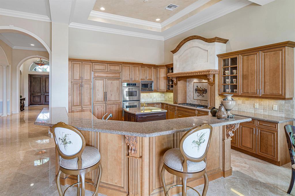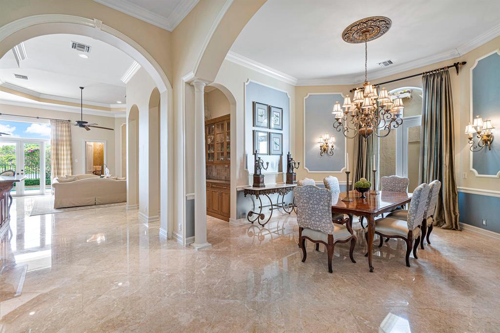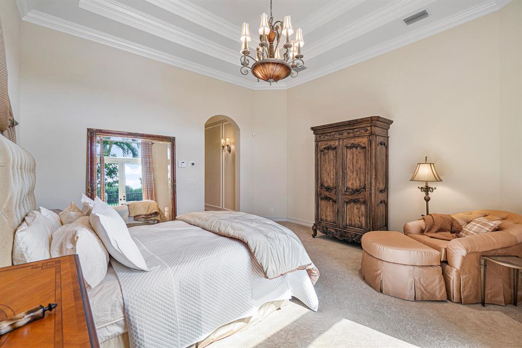 This magnificent Martinique is on a prime private lake lot and features 3 en-suite bedrooms plus a library/4th bedroom, 3 full and 1 half baths - all on one single level, w/ a triple-split floor plan including a private guest house. Highlights include marble floors thru-out the main living areas, wood floors in the office, a gourmet chef's kitchen with stainless steel appliances, wood cabinetry, granite countertops, & is open to a spacious family room. Designer appointments include architectural millwork, light fixtures, and artistic details. The master features his & hers walk-in closets, and a luxurious master bath w/ separate vanities including a makeup vanity. With full impact glass, brand new A/Cs & a heated pool and spa. This home is absolutely Stunning!!!