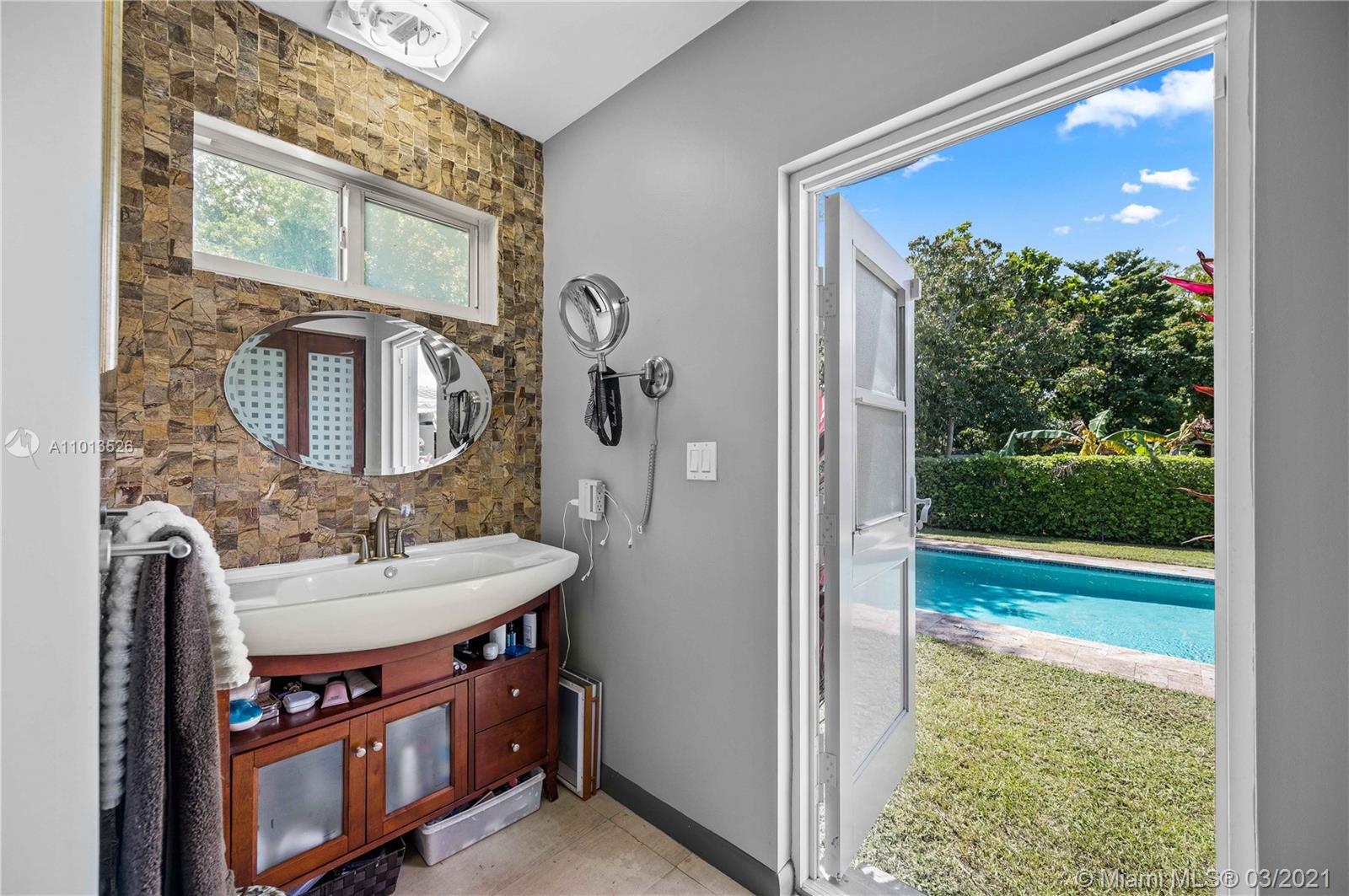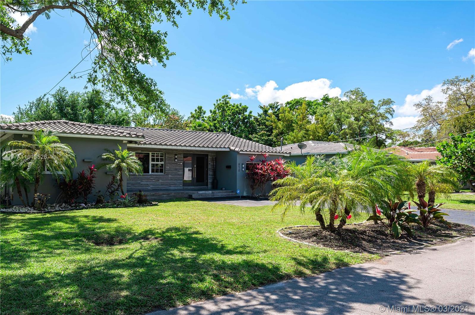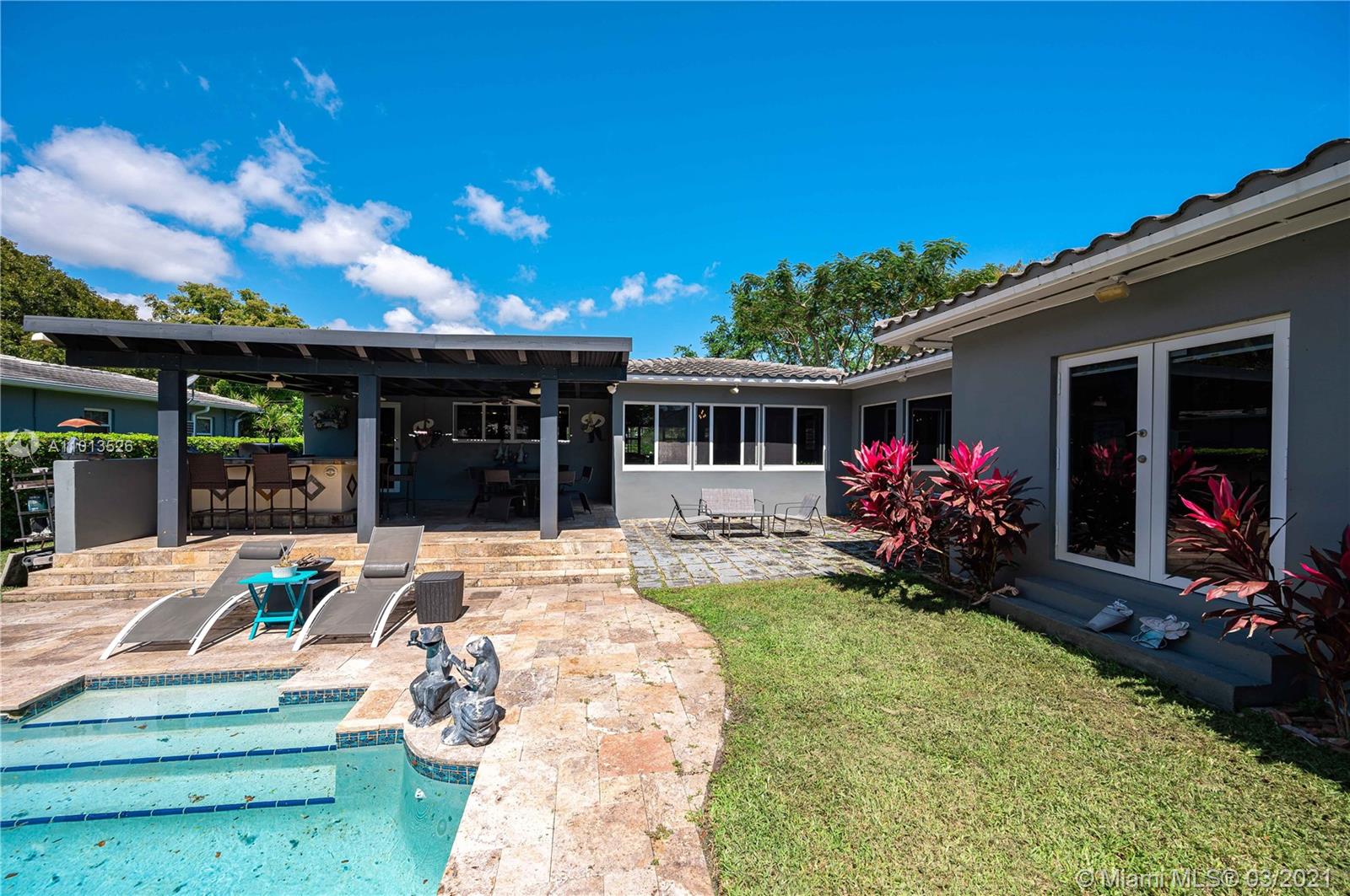 Updated mid-century modern east of Biscayne Blvd in highly desirable Miami Shores neighborhood. This property has been transformed into an entertainer's delight w/ open concept & elevated indoor/outdoor living concept. Interior features include true chef's kitchen w/ Five Star gas range, cast iron grill/griddle, dual wine-coolers, professional exhaust hood, walk-in pantry, & custom kitchen island that comfortably seats six. The open kitchen communicates comfortably w/ the living room & formal dining area, which looks out over the alluring pool terrace. For dining al-fresco, the exterior pergola & outdoor BBQ help to create the ideal atmosphere for enjoying the outdoor space with friends & family. Master-BR wing features an office area, large walk-in closets & more. Impact glass throughout.