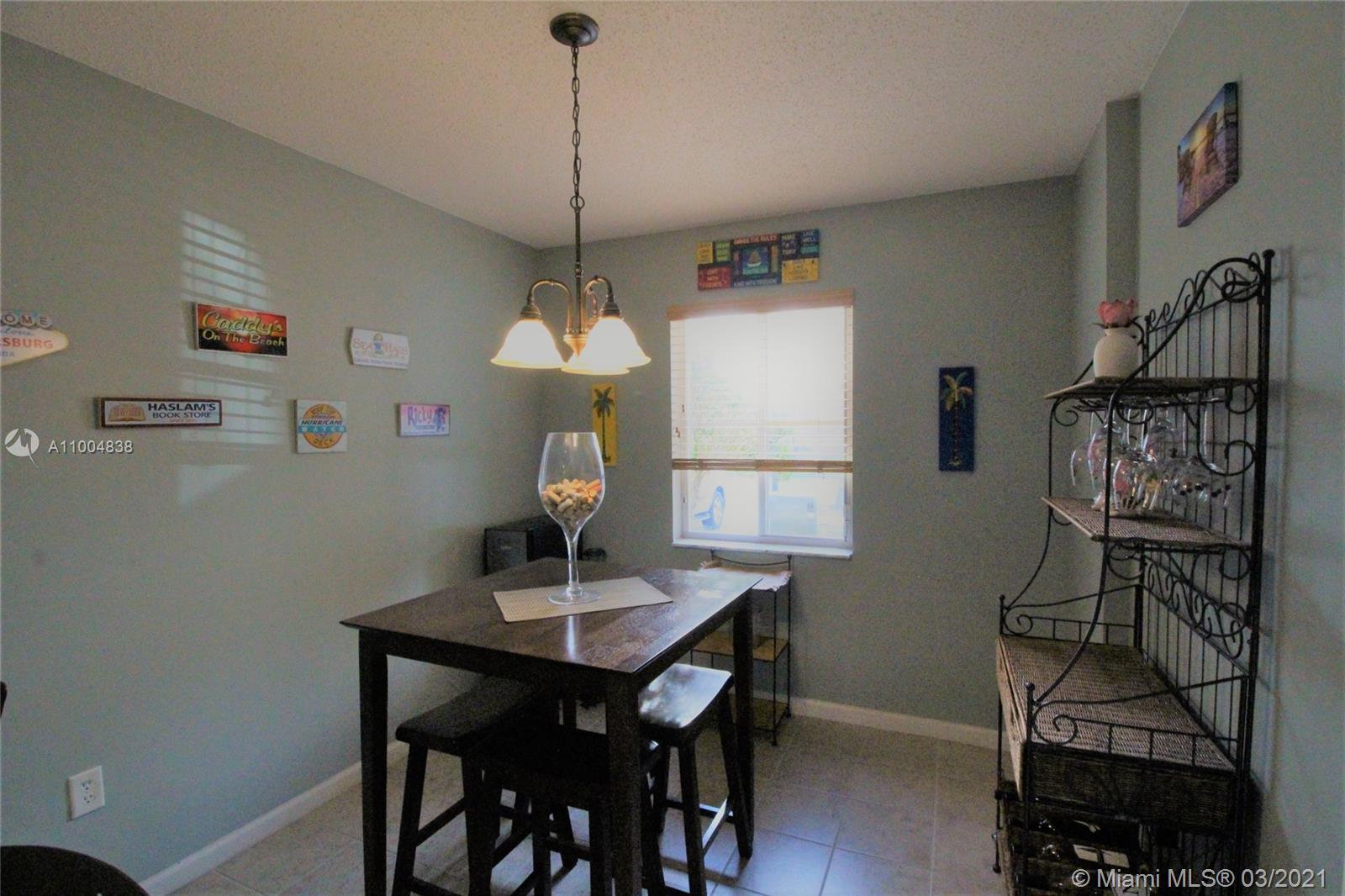 Super spacious 3 bedroom 2.5 bathroom townhome located in the heart of Sunrise, just minutes from Bonefish Grill and Doris's Italian Market in the Park Terrace Community. The exterior has a very clean look with barrel tiles. Home has 2 front parking spots right outside your 1 car garage. Nice size eat-in kitchen, with counter top bar and pass through to additional living or could be dining area. The view out sliders is all trees and very private. Brand new stainless steel appliances, less than 6 months old: pull-out drawer refrigerator, stove/oven, and microwave. Also stainless steel dishwasher. Tile throughout kitchen/entry area. Berber carpet in living areas and upstairs. Unusually large master bedroom and bath with spa like shower and a large walk-in closet. Accordion shutters present.