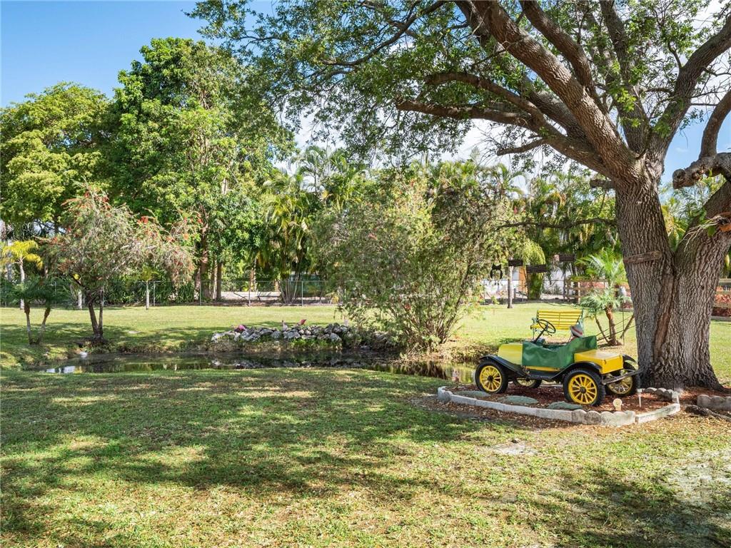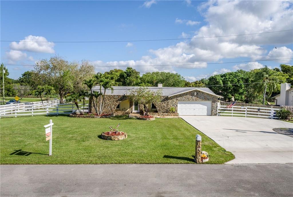 Impeccably-Kept Country Charmer in Southwest Ranches! Spacious 1-acre corner dry-lot host to serene pond, oak trees & beautiful green grounds. This 5BED/2.5BA home has been updated to include a 2-yr roof & a/c, impact windows/doors + accordions & newer kitchen w/S/S appl pkg, floating island, beveled-edge granite countertops & lg pantry. Home's family social area features a real wood-burning fireplace embedded in striking stonewall, exposed ceiling 12" wood beams (w/3" insulation) adds character to this large gathering area w/views to the pool/spa, garden & lovely grounds. Parquet wood floors & Cedar wood walls add warmth & tradition to this timeless ranch home. Deep well w/triple-filtered system grants crystal clear drinking water. Xtra lg sheds for storage. 10-car & RV Parking space.