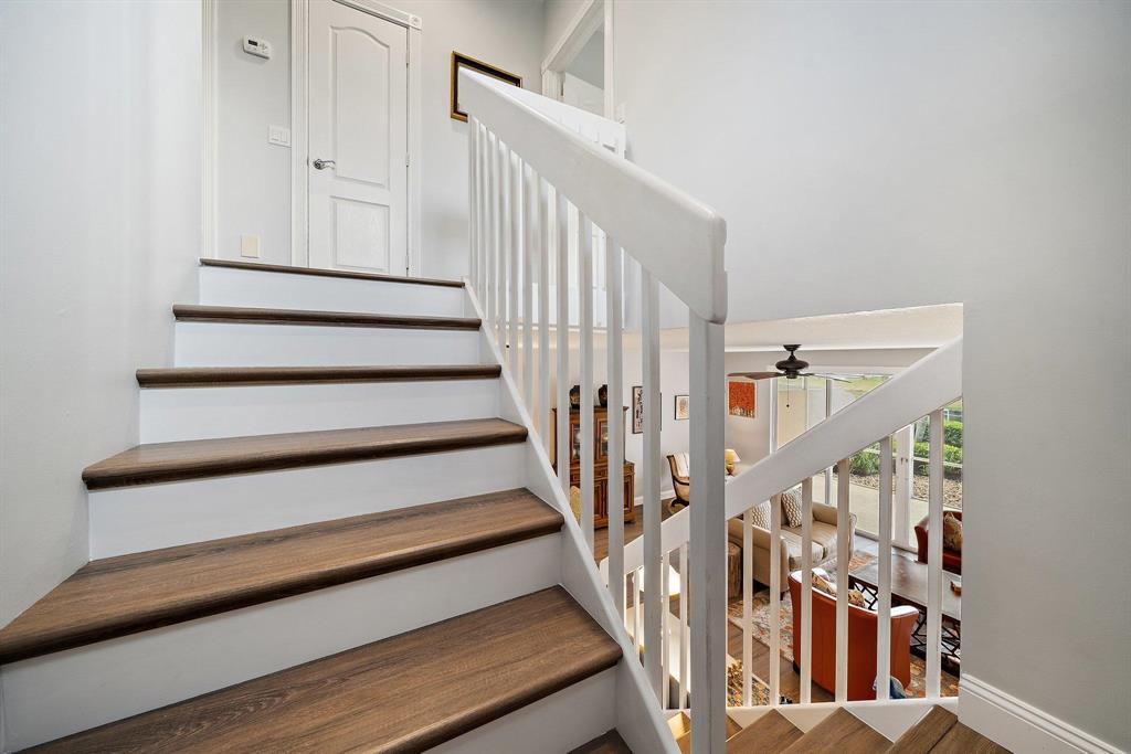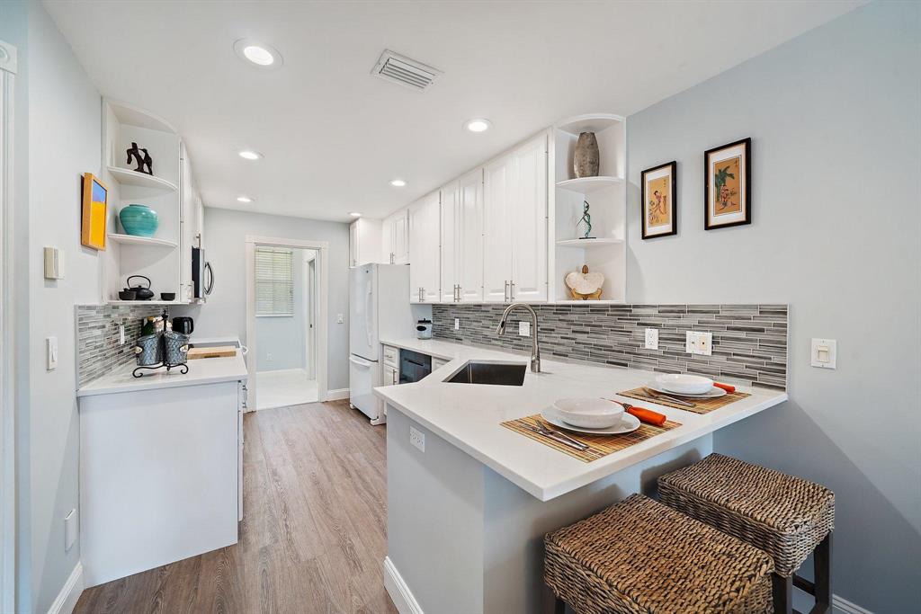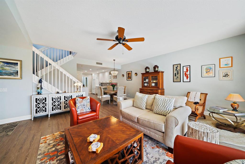 Rarely available waterfront corner townhouse offers gorgeous lake views and spacious green space. This beautifully updated 3-bedroom 2 1/2-bathroom home has been newly painted in a neutral color and features engineered vinyl plank flooring throughout, crown molding, additional kitchen cabinets, quartz countertops, and electric blinds. The open floor plan living kitchen area flows out to a screened lanai overlooking the water. Riverwalk is a manned gated community which offers luxury resort-style living without the exorbitant country club fees. It features three heated pools, a fitness center, and eight lighted Har-Tru tennis courts as well as 12 miles of walkways and a calendar of activities.