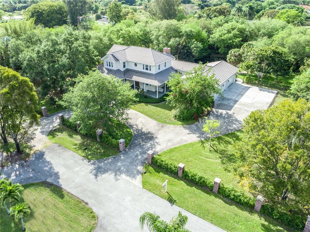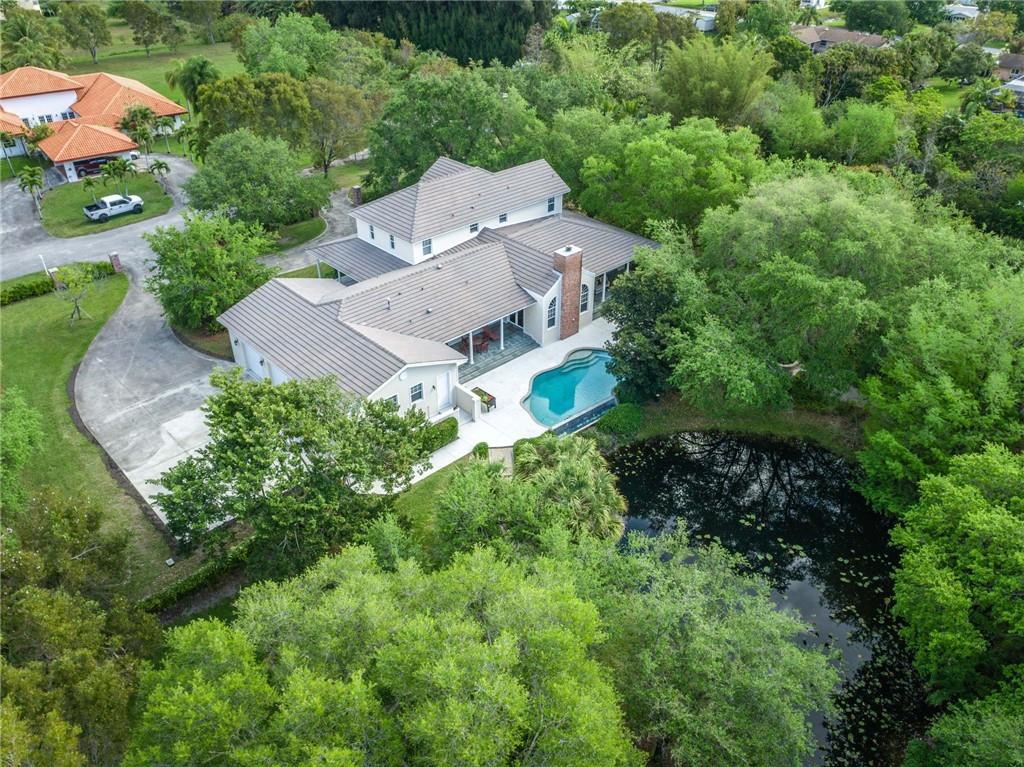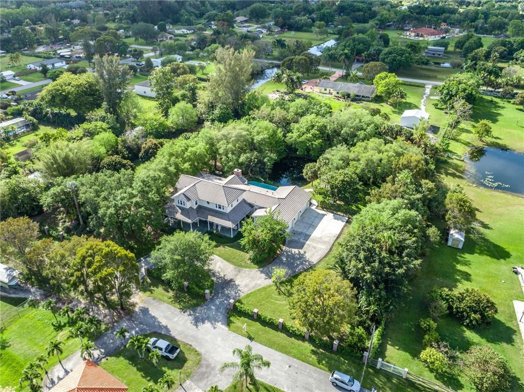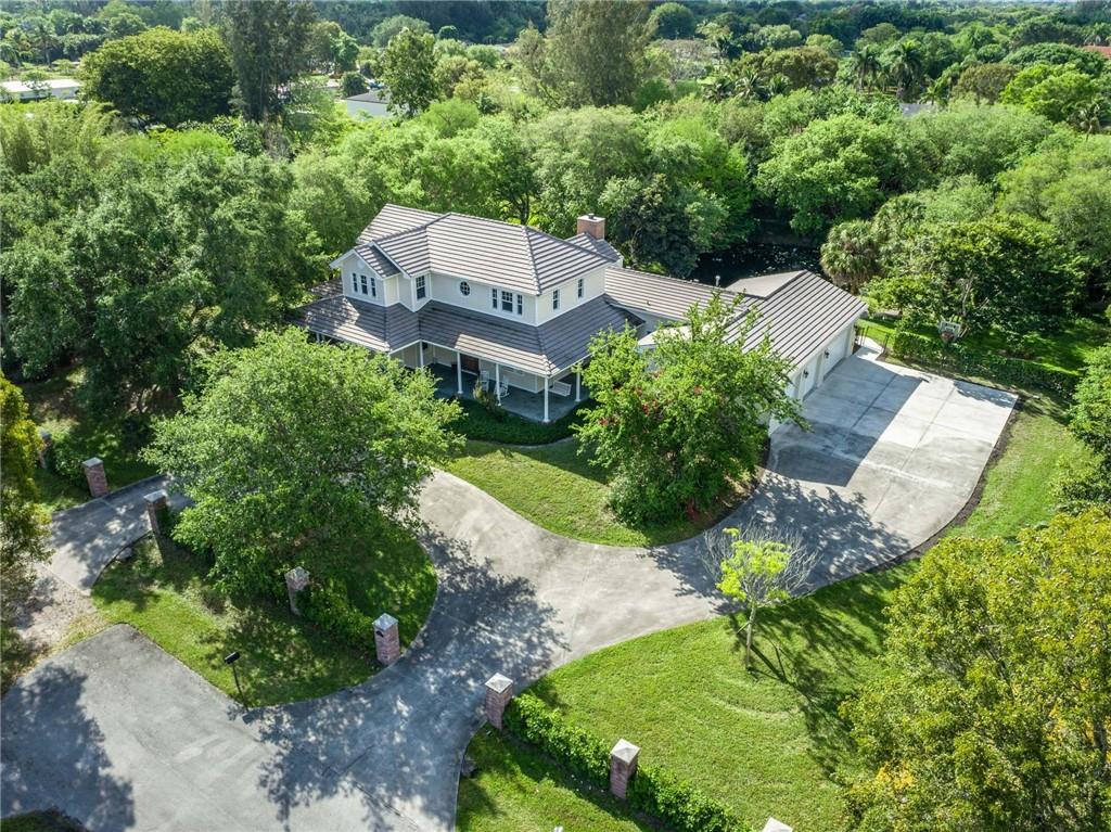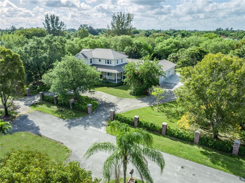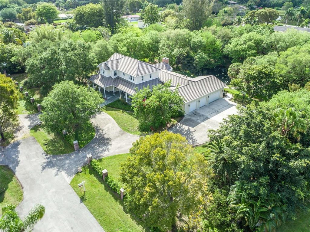 Exquisite Southern Home w/Wrap-Around Porches on 2.5-Acre Private Estate in Sought-after Southwest Ranches! Warm & inviting curb appeal the moment you set your eyes upon this beautiful home set in a storybook garden array of Oaks/Pine trees, fruit trees & butterfly vegetation. Impeccably maintained spacious interior featuring shimmering wall-to-wall wood floors, accented by the finest of finishes in white panel doors, crown molding & touches of wainscot throughout. Picturesque views of the botanical gardens from every impact window & French door adorning this masterpiece home. Showcase Great Room w/tongue & groove wood ceiling & stone wood burning fireplace is the perfect setting for family gatherings overlooking the infinity pool w/waterfall, serene pond views & grabble walking path.
