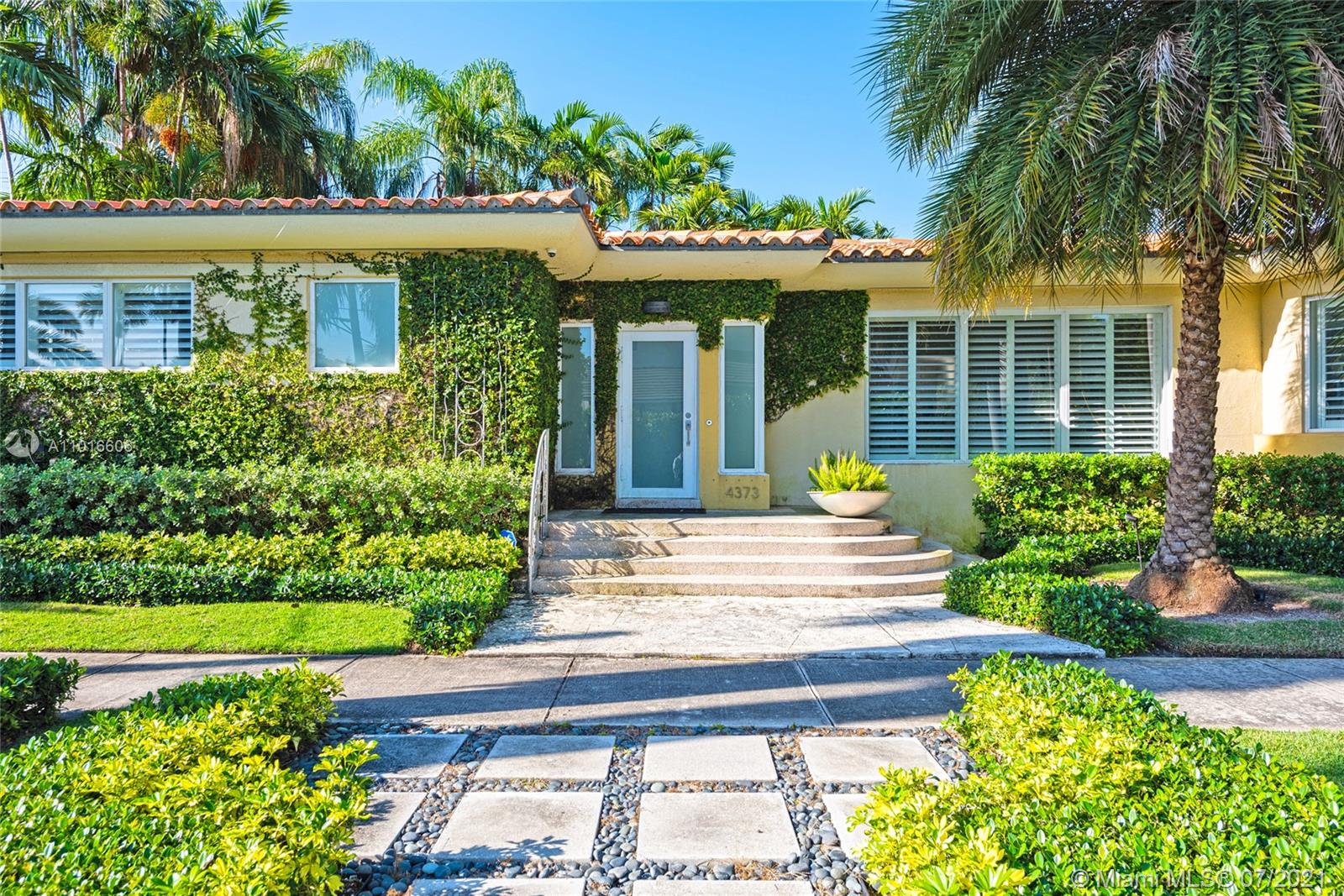 Perfectly executed Mid-Century stunner situated on an incomparable corner lot on North Bay Road. Abounding with architectural details, this updated totally move in condition charming home features original terrazzo floors, crown molding, stone mantel fireplace, and volume ceilings throughout. Spacious living and dining rooms make for effortless entertaining. Gourmet kitchen with custom cabinetry, Carrera marble counter tops, and eat-in island flow smoothly into the adjacent family room. Impact windows and doors throughout allow for an abundance of natural light. Lush private garden and patio flawlessly connect the indoor and outdoor space.