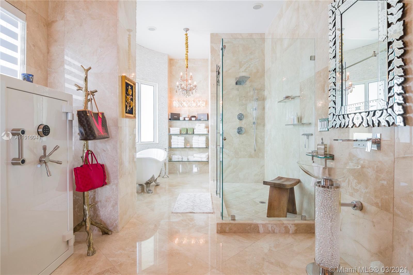 Truly an aquatic paradise, this incredibly elegant waterfront estate offers a magnificent 6,135 total SF 5bd/5.2ba floorplan situated on a 9,225 SF lot. 60ft of water frontage w/a 40ft dock + separate 2-jet ski slip overlooking the residence’s secluded private island. No fixed bridges to the bay or Ocean. Additional features include: grand atrium entrance, dramatic high-volume ceilings, designer finishes, detached guest suite, oversized impact windows/doors, elevator, 2 laundry rooms & chef’s open kitchen overlooking pool area. The regal double Master suites on the airy 2nd floor each offer gigantic walk-in closets, sitting areas, spa-like baths w/toto toilets & private terrace. 2-car garage, gym, & pool area w/cabana bathroom. Exclusive beach access from HOA for only $1 a day.
